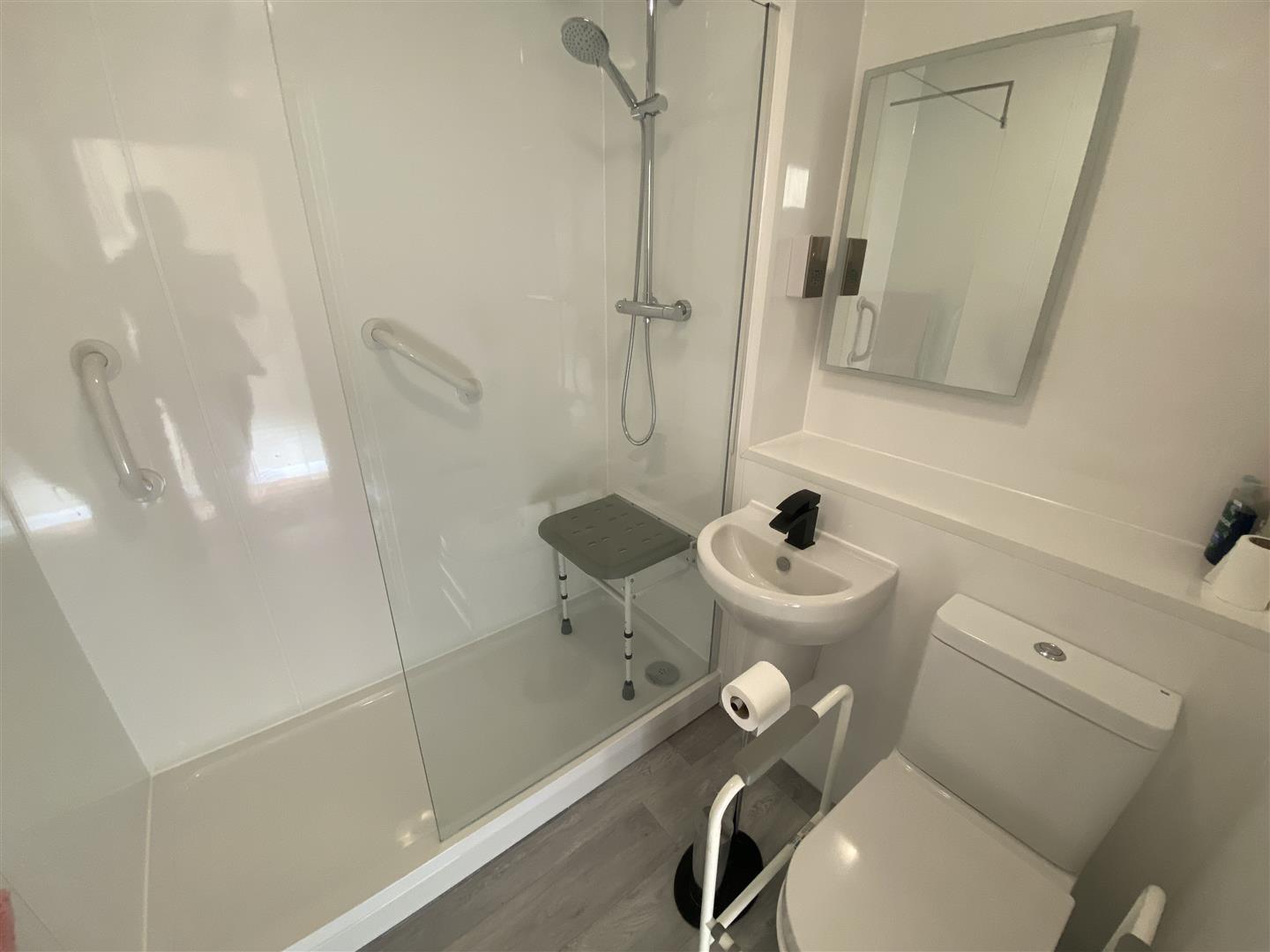 Shower enclosure. WC. Wash basin. Chrome heated towel ladder.