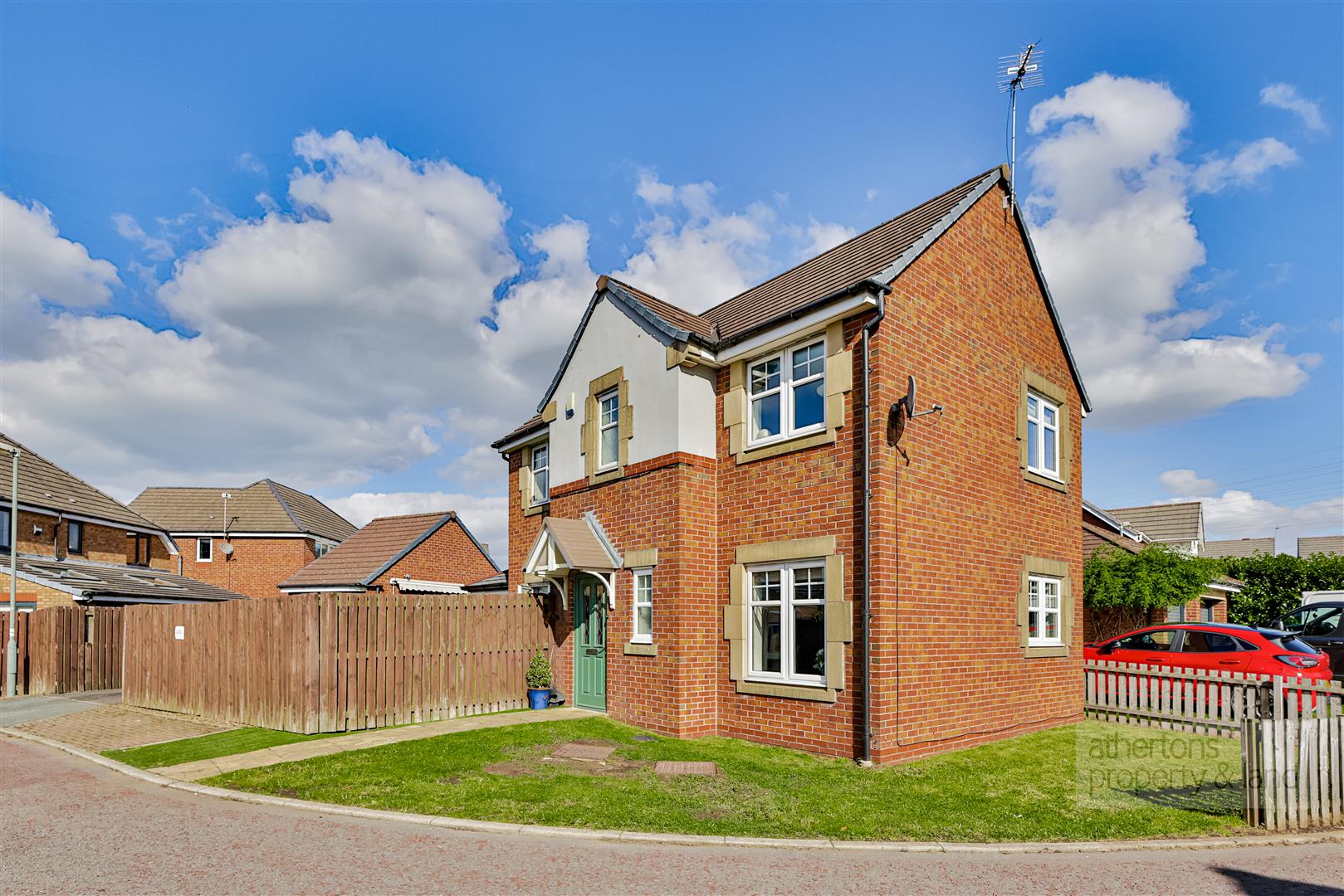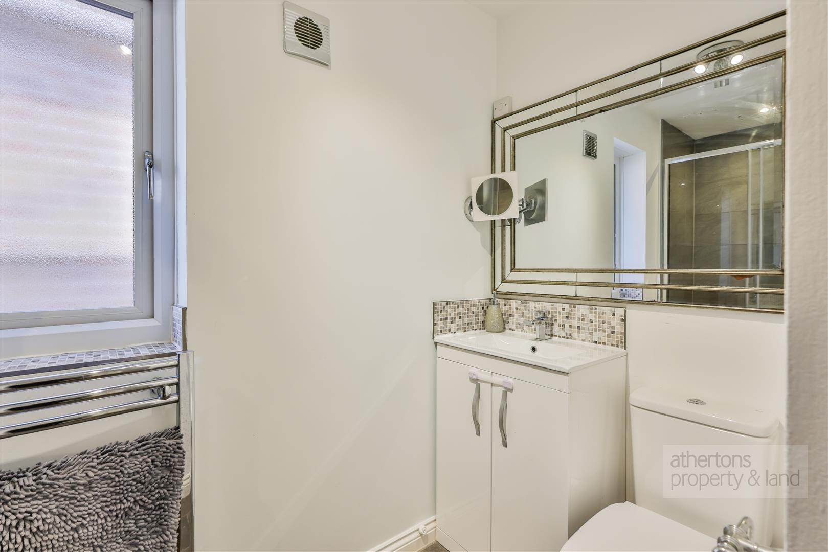 To the first floor, a bright and airy landing serves three bedrooms and a family bathroom. The principal bedroom enjoys twin built-in wardrobes and a well-appointed en-suite shower room with a double-width enclosure and dual-head thermostatic shower.
