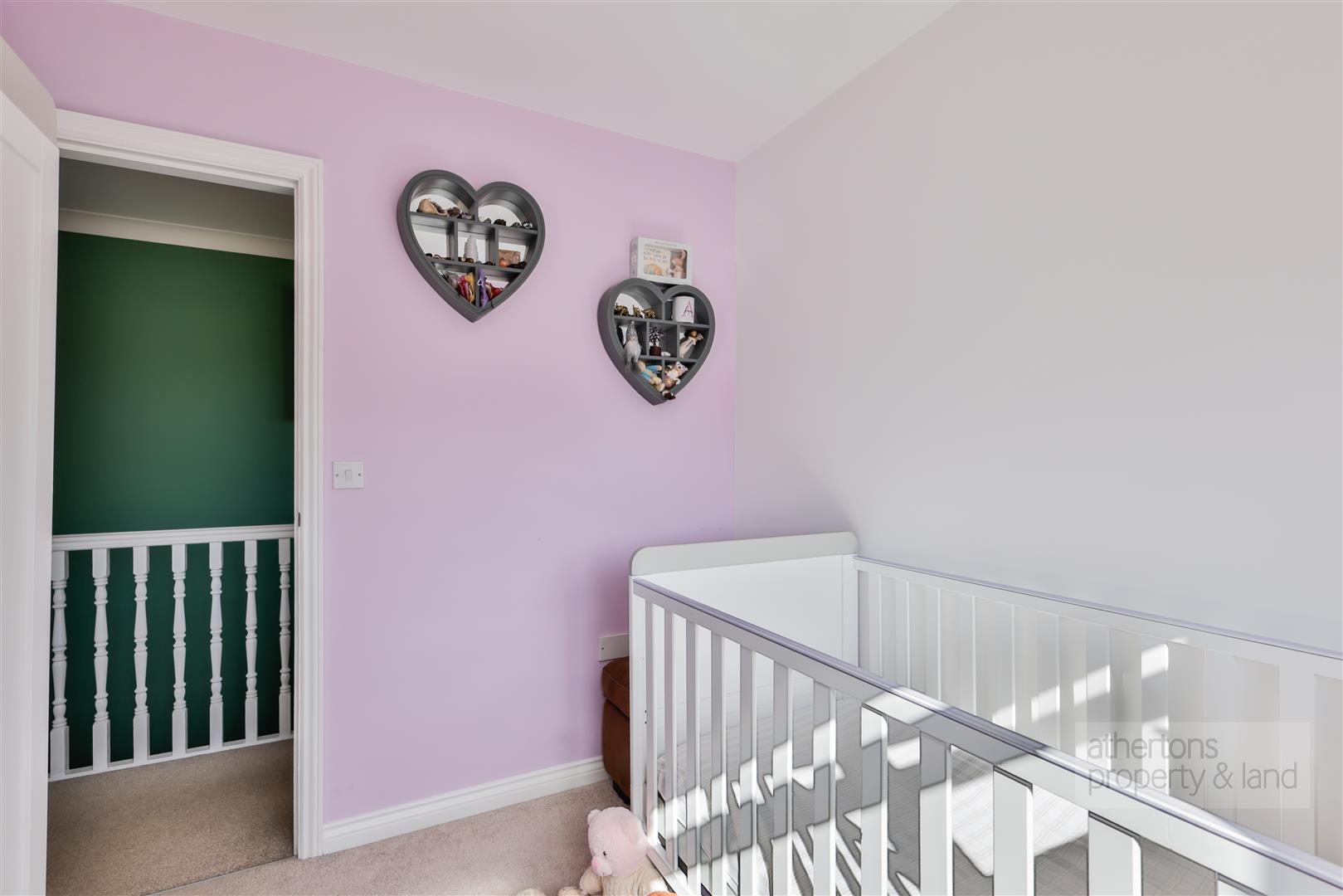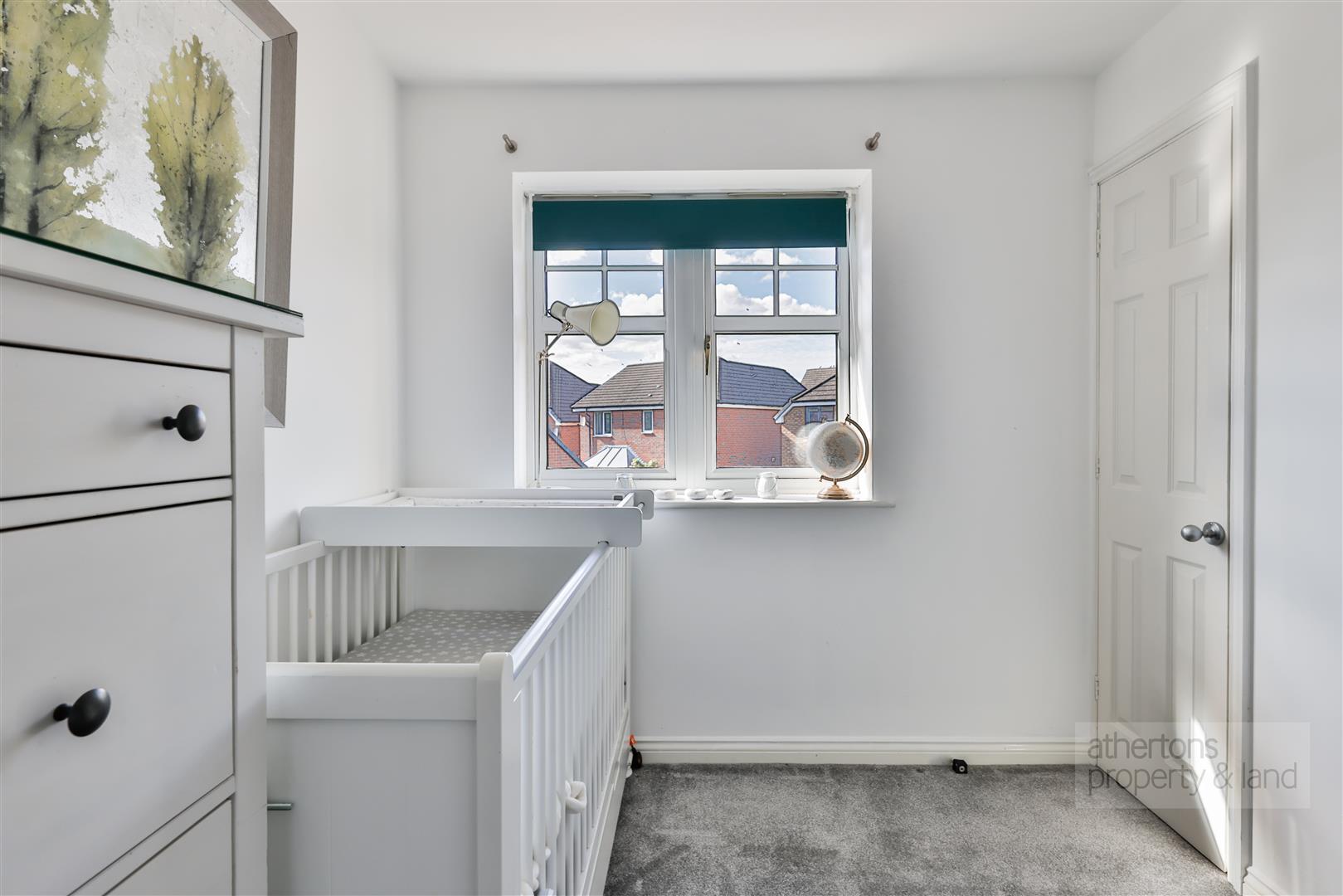The second bedroom, also a double, benefits from a built-in wardrobe, while the third is a generous single with side-facing views. Completing the accommodation is a contemporary family bathroom, finished with a white suite, over-bath thermostatic shower, and built-in storage cupboard.