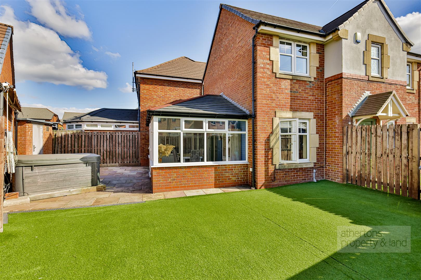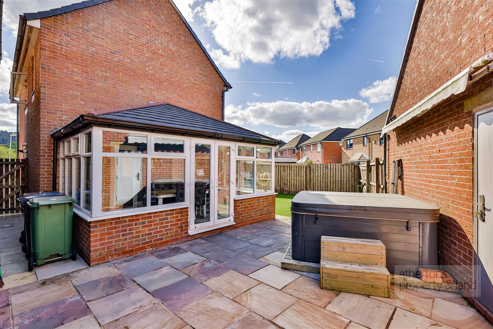 Externally, the property offers excellent outside space. To the front, a tarmacadam driveway and block paving provide parking for two vehicles and lead to a detached single garage with up-and-over door, eaves storage, and deadbolt security side door. Adjoining the garage, a recently refurbished outbuilding provides a fantastic space for entertaining and serving the garden as a home bar. Gardens wrap around three sides of the house, with a large enclosed front garden laid with artificial turf, an additional lawned side garden, and a private York stone patio to the rear with access to the sun room and garage.