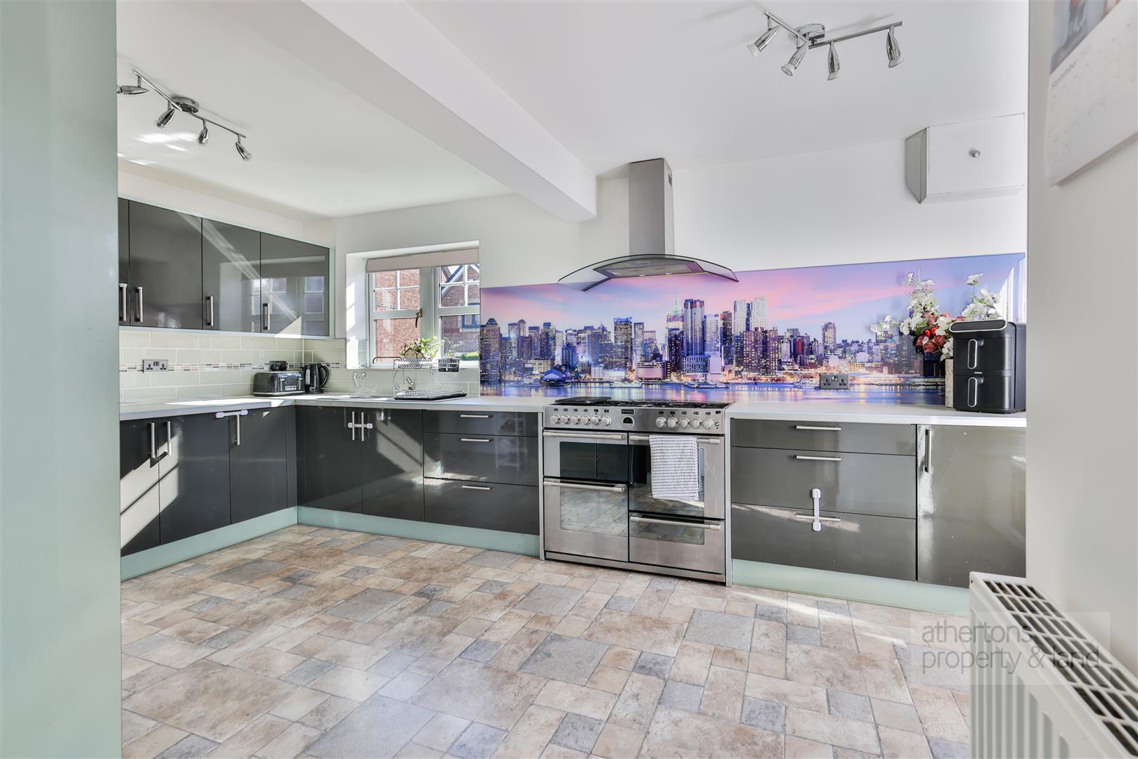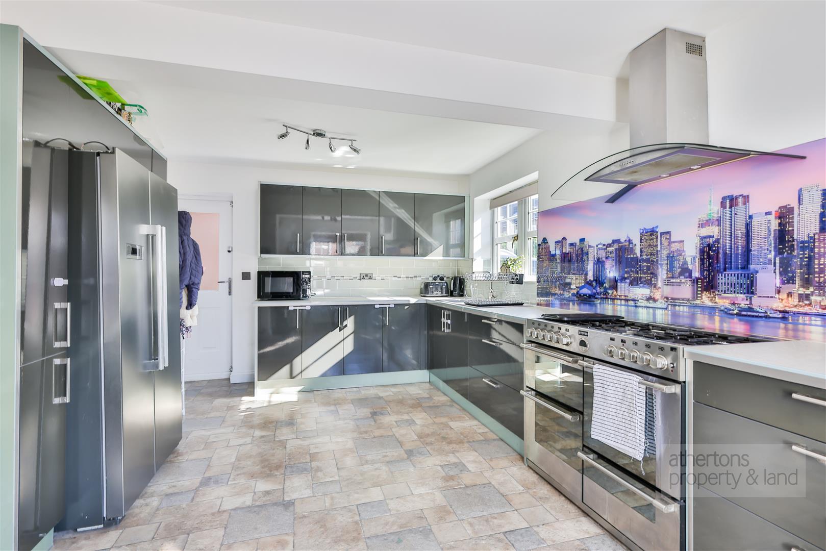 On the opposite side of the hallway, there is a spacious kitchen diner finished with anthracite grey units, complementary work surfaces, and provision for a range cooker and wide fridge freezer. This space is both practical and attractive, with direct access to the rear. A cleverly designed under-stairs utility area provides additional storage and laundry facilities.