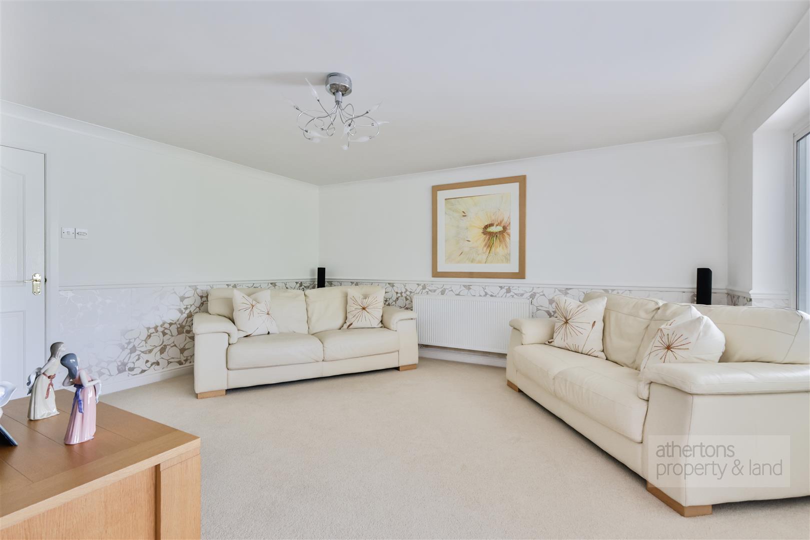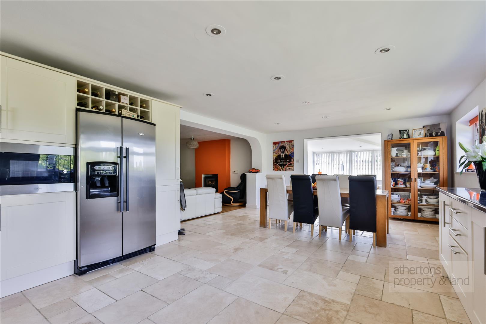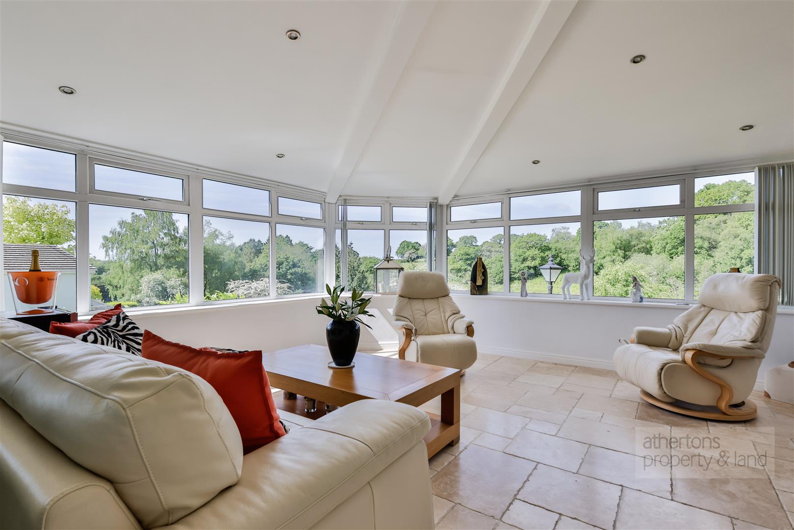 The generously sized living room connects effortlessly to a bright sunroom via sliding glazed doors. This wonderful space is perfect for relaxing or hosting guests, with expansive garden views, double glazed windows, and a warm roof allowing year-round use. A comfortable snug, ideal as a second lounge or reading nook, features a Stovax log-burning stove and opens into the heart of the home—a spacious kitchen/diner extending over 24 feet wide. This kitchen includes a comprehensive range of base and wall units, integrated appliances including a Stoves electric double oven, induction hob with extractor, dishwasher, combination microwave, and dual-bowl sink with drainer. There is space for a fridge/freezer, tiled flooring throughout, and breathtaking views to the rear, as well as external access and open links to both the snug and sunroom.