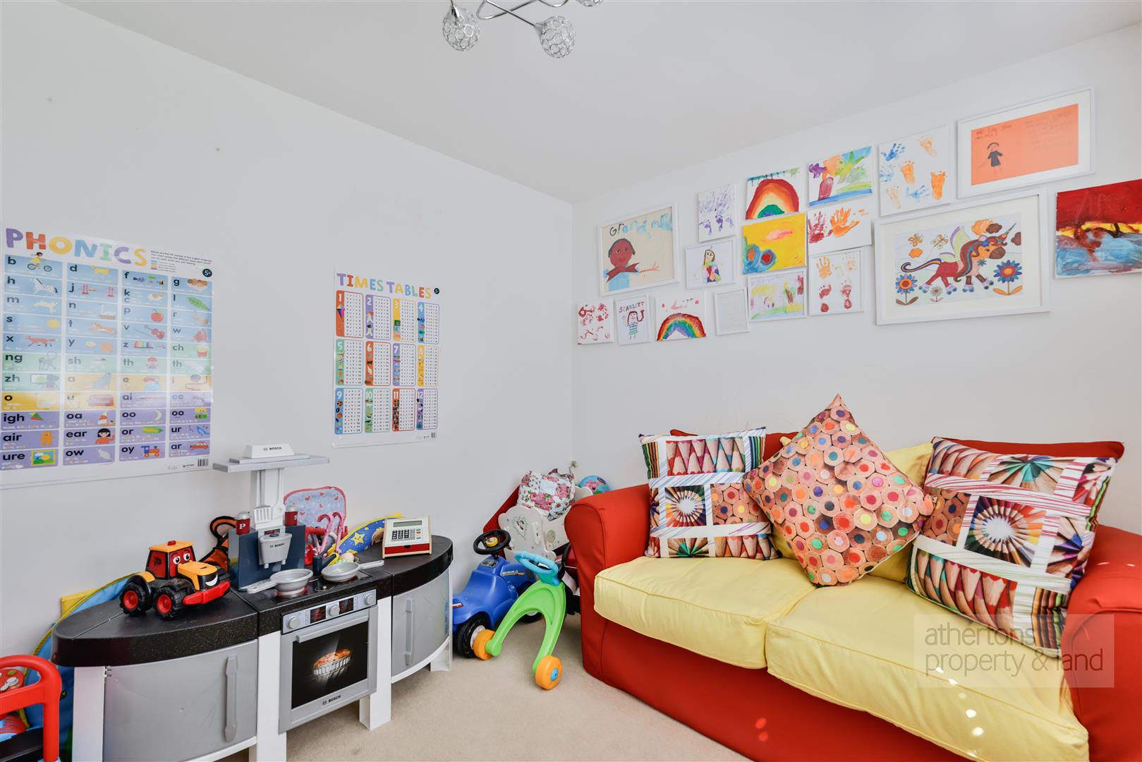 On the ground floor, a welcoming entrance vestibule leads into a spacious hallway, from which several well-sized reception rooms extend, along with a staircase to the first floor. At the front of the property, a cosy playroom—ideal for children—and a modern three-piece tiled shower room provide flexible accommodation suited to modern family life.