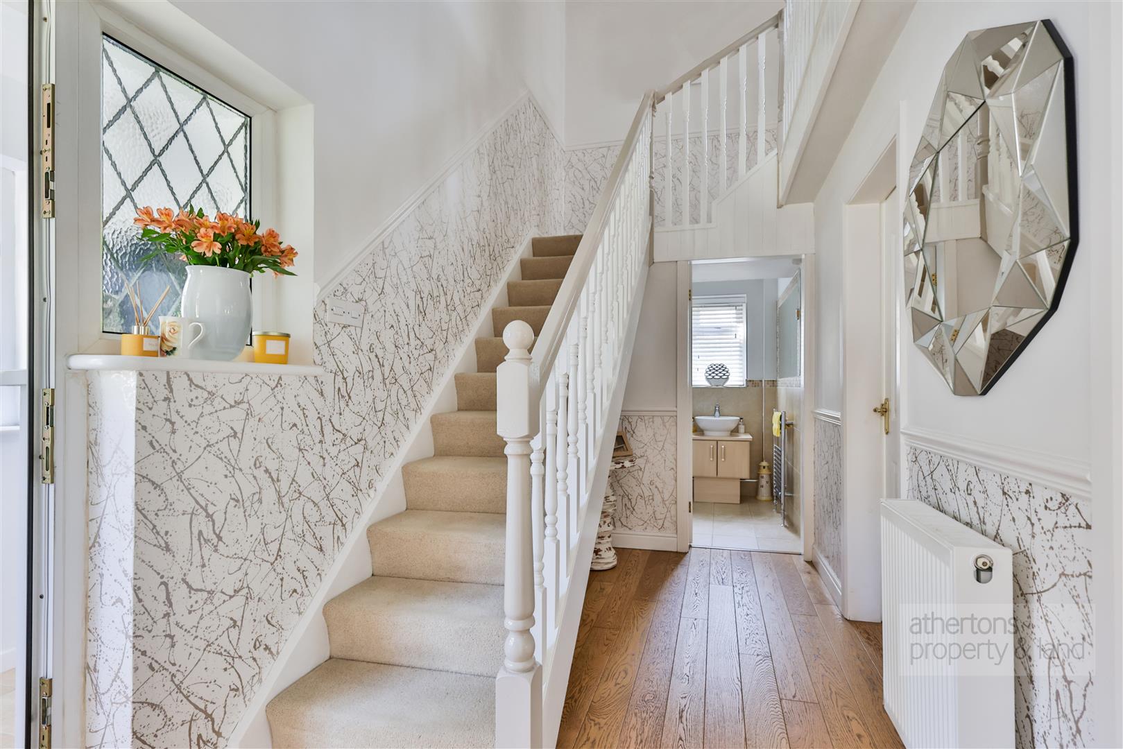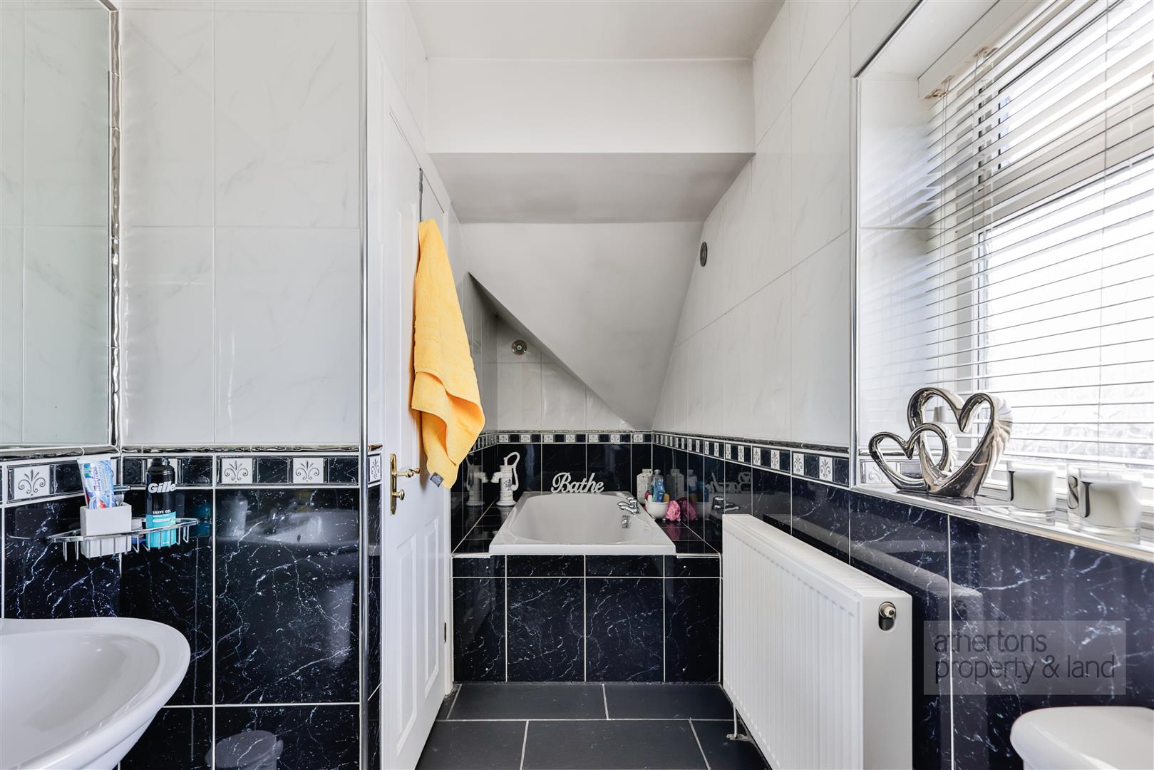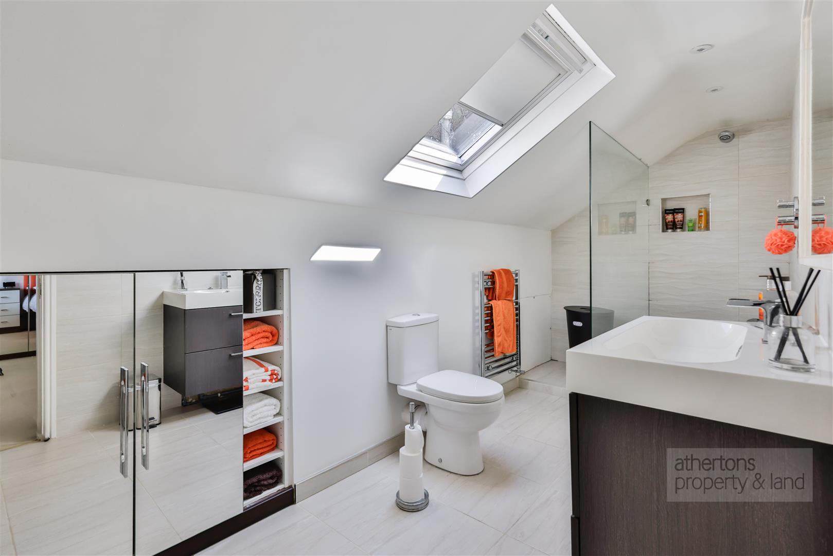 Upstairs, the property offers four spacious double bedrooms, all thoughtfully positioned. The principal suite enjoys rear garden views, fitted wardrobes, and a contemporary three-piece en-suite shower room with dual flush WC, skylight, walk-in mains shower, and vanity wash basin. The remaining bedrooms are served by a stylish four-piece family bathroom, featuring a double-ended bath with tiled surround, slate flooring, a wall-mounted wash basin, dual flush WC, and a large cubicle shower with surrounding water jets and tiled seating. Off the landing, two storage rooms are available, one of which houses the hot water cylinder and serves as an excellent airing cupboard.
