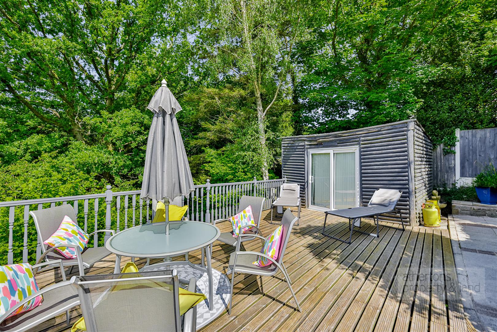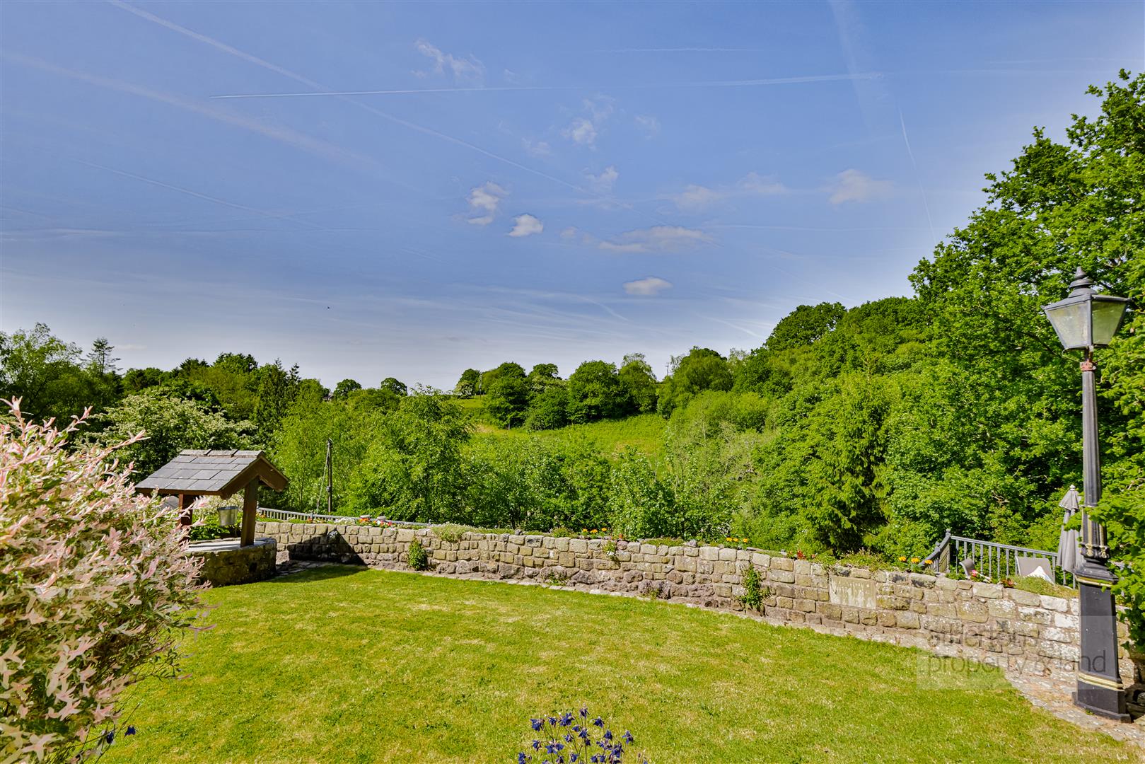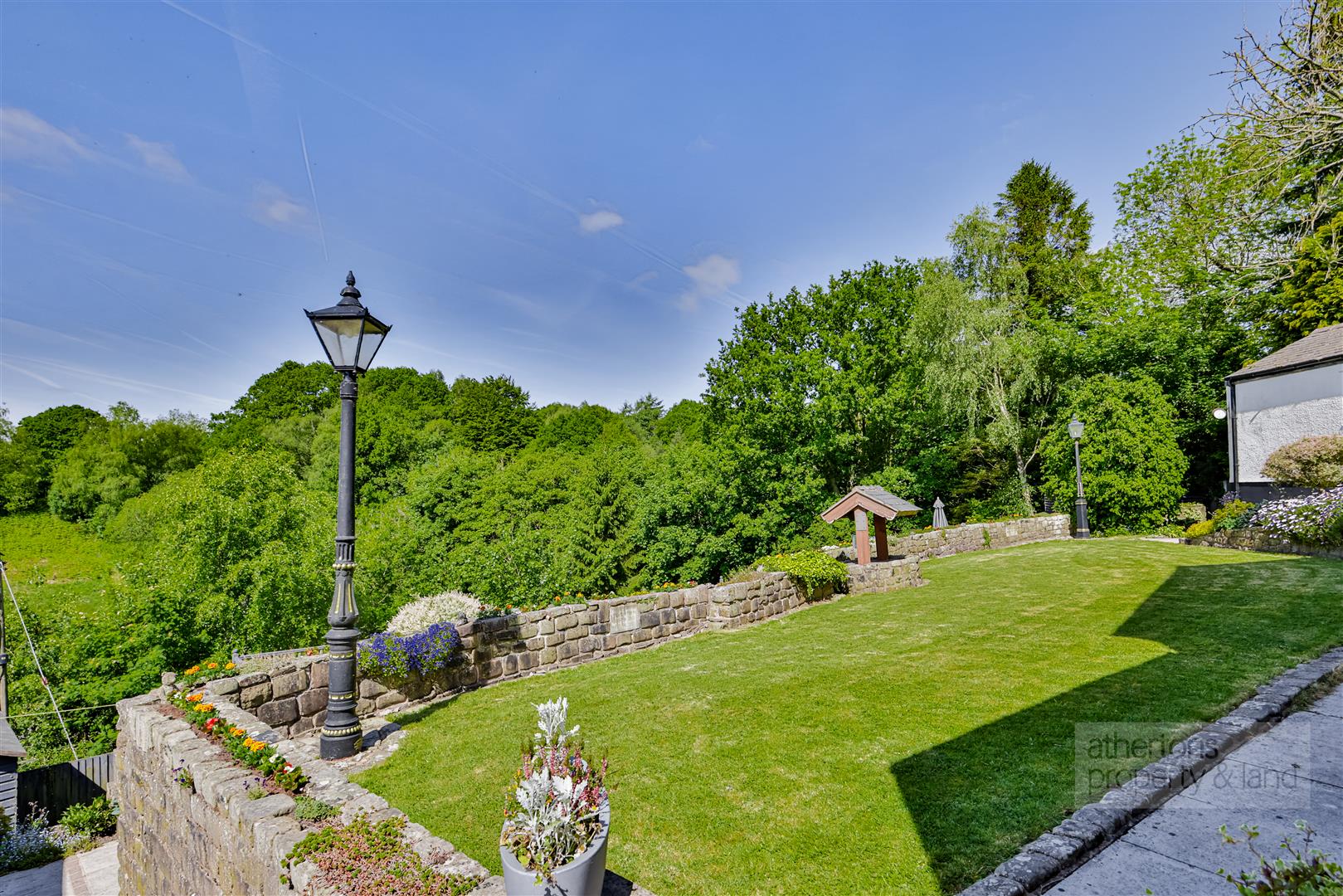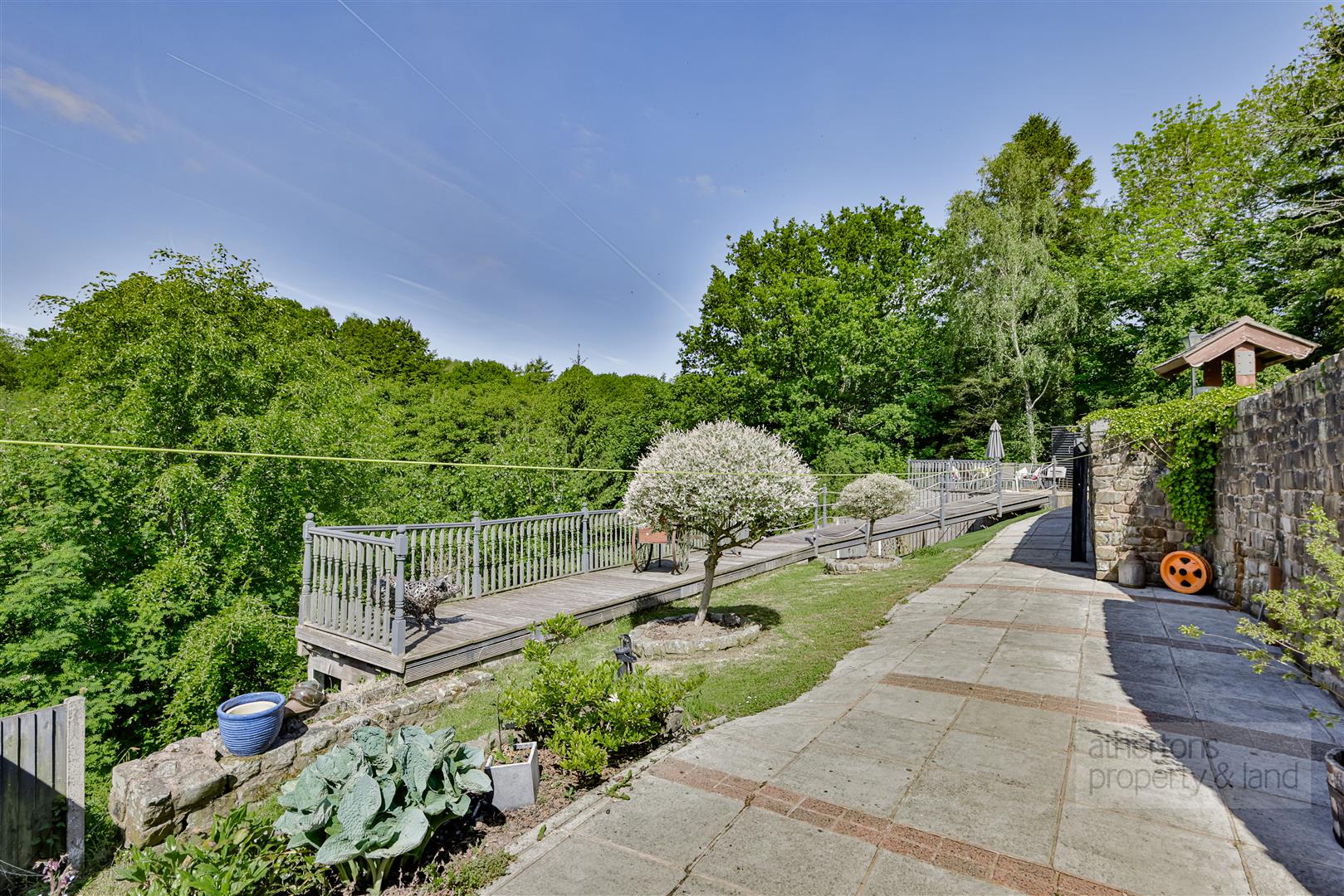 Outside, the home benefits from an electric gated entrance onto a large driveway, leading to a detached garage with remote-controlled roller door. The rear garden opens up to a stunning vista, with tiered lawned and paved terraces, decked walkways, multiple seating areas, low stone walls, stone steps and pathways, and a spacious balcony—perfect for enjoying the views. Beyond the formal gardens, the sloping plot continues down to Dean Brook, providing a wonderful setting rich in nature and wildlife.