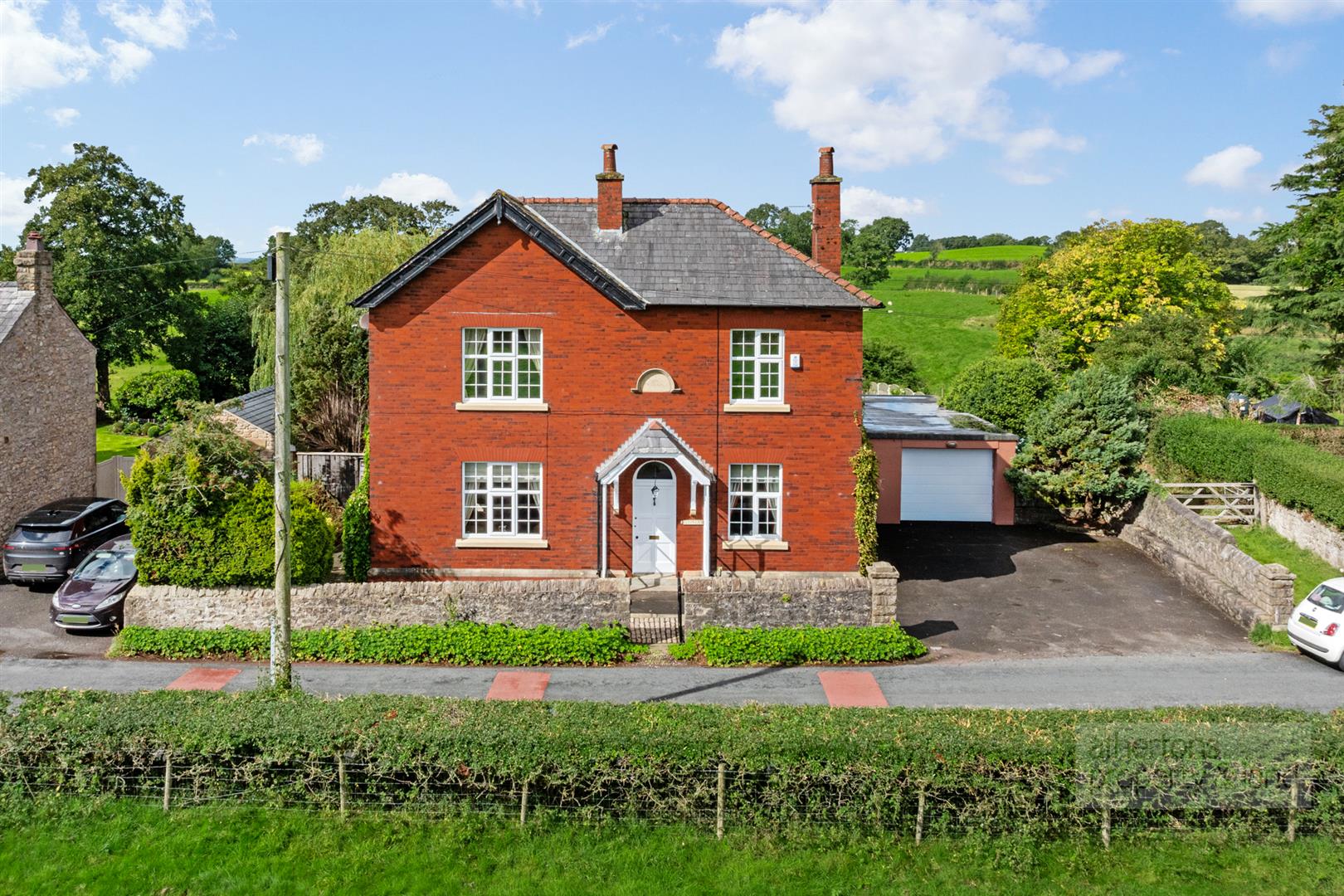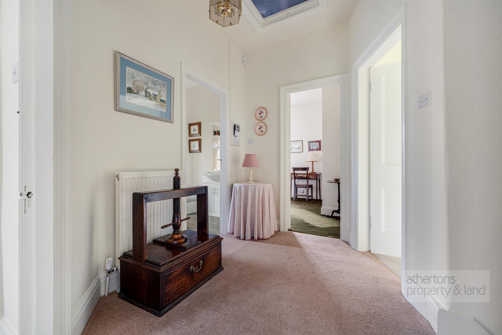 Approached via a tarmac driveway leading to a generous parking area and double garage, the home immediately conveys a sense of substance and quiet authority. The front door sits beneath an open porch and opens into an entrance vestibule, from which a further door leads into the principal sitting room.