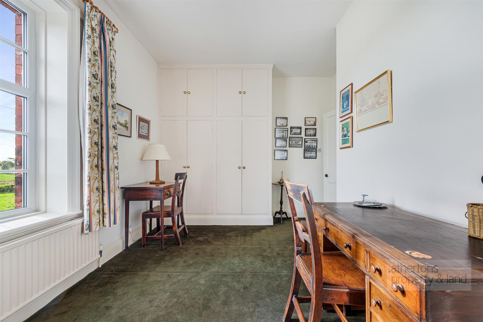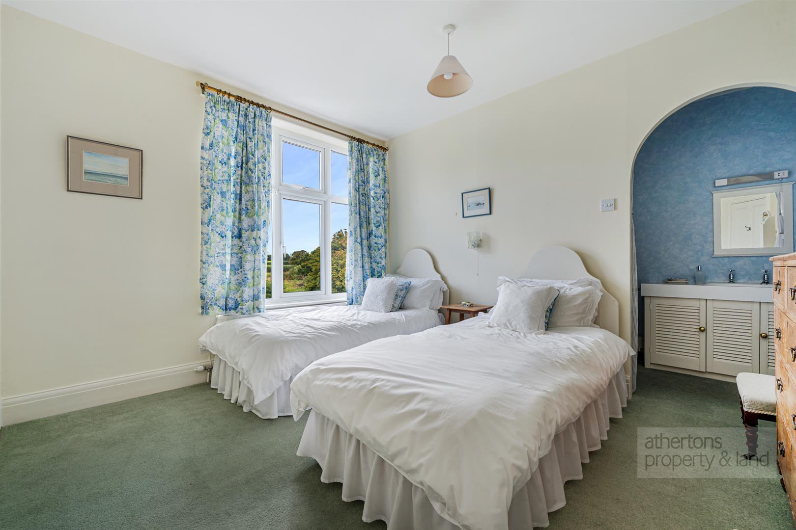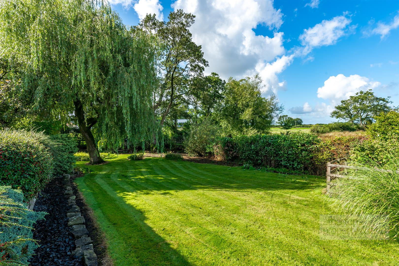 The conservatory is a particularly attractive addition, framing lovely views across the mature gardens and the fields beyond. Patio doors open directly onto the stone terrace, allowing the interior to extend effortlessly into the outdoor space during the warmer months.