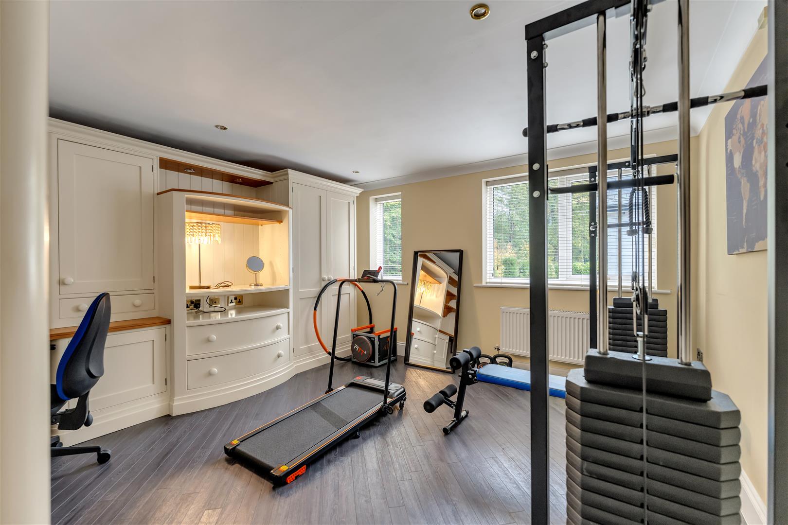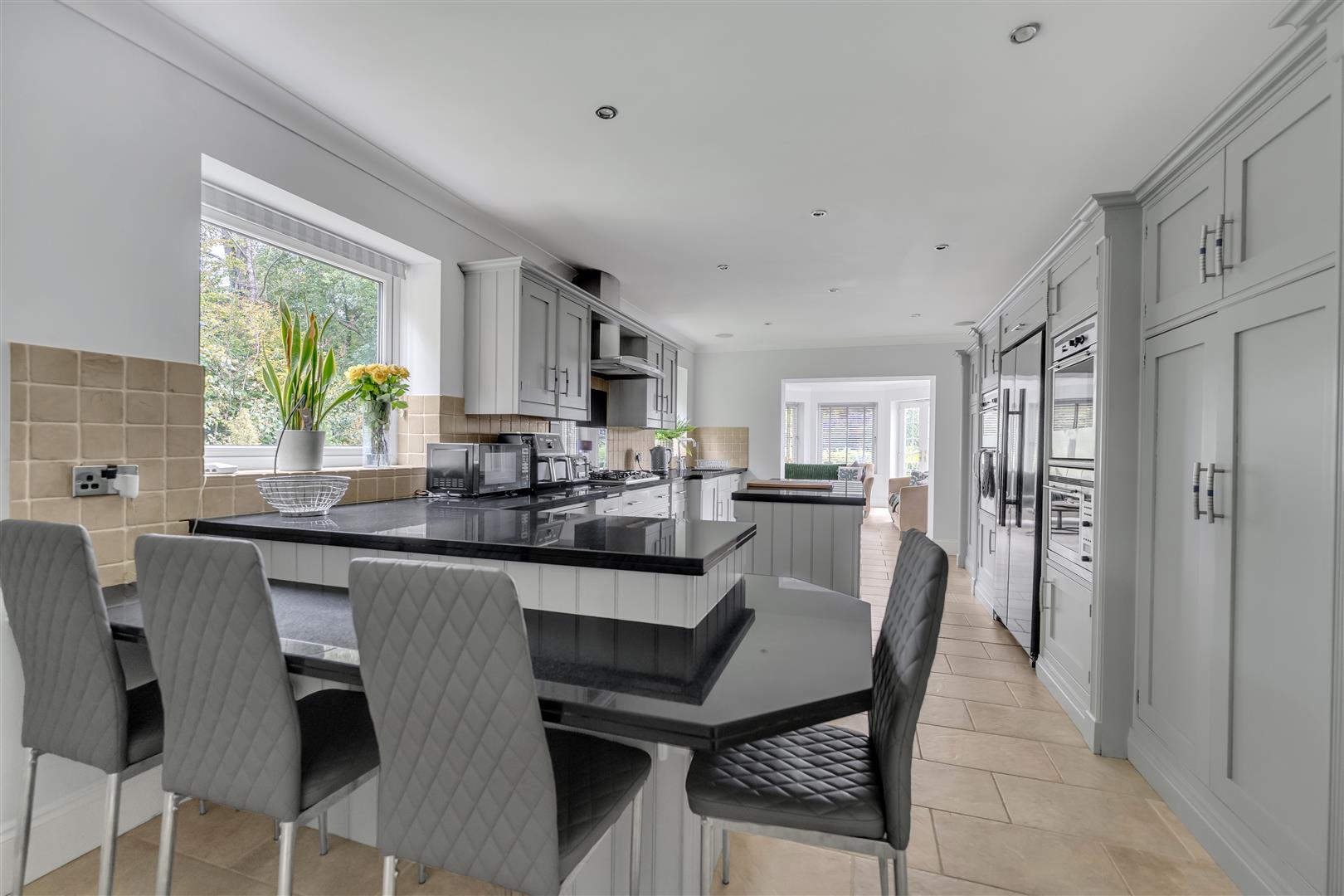 At the heart of the home lies the bespoke kitchen, appointed to an exceptional standard with granite work surfaces, grey base and eye-level cabinetry, and an array of Neff integrated appliances, including four ovens, two dishwashers, a five-ring gas hob with extractor, and provision for an American-style fridge/freezer. The large central island and breakfast bar, together with underfloor heating, ensure both comfort and practicality. To the rear, a sun room with uPVC French doors opens directly to the patio and gardens, while an adjoining games and living room features twin bay windows, a timber bar with storage, and a decorative central fireplace making it a relaxed and sociable family space.