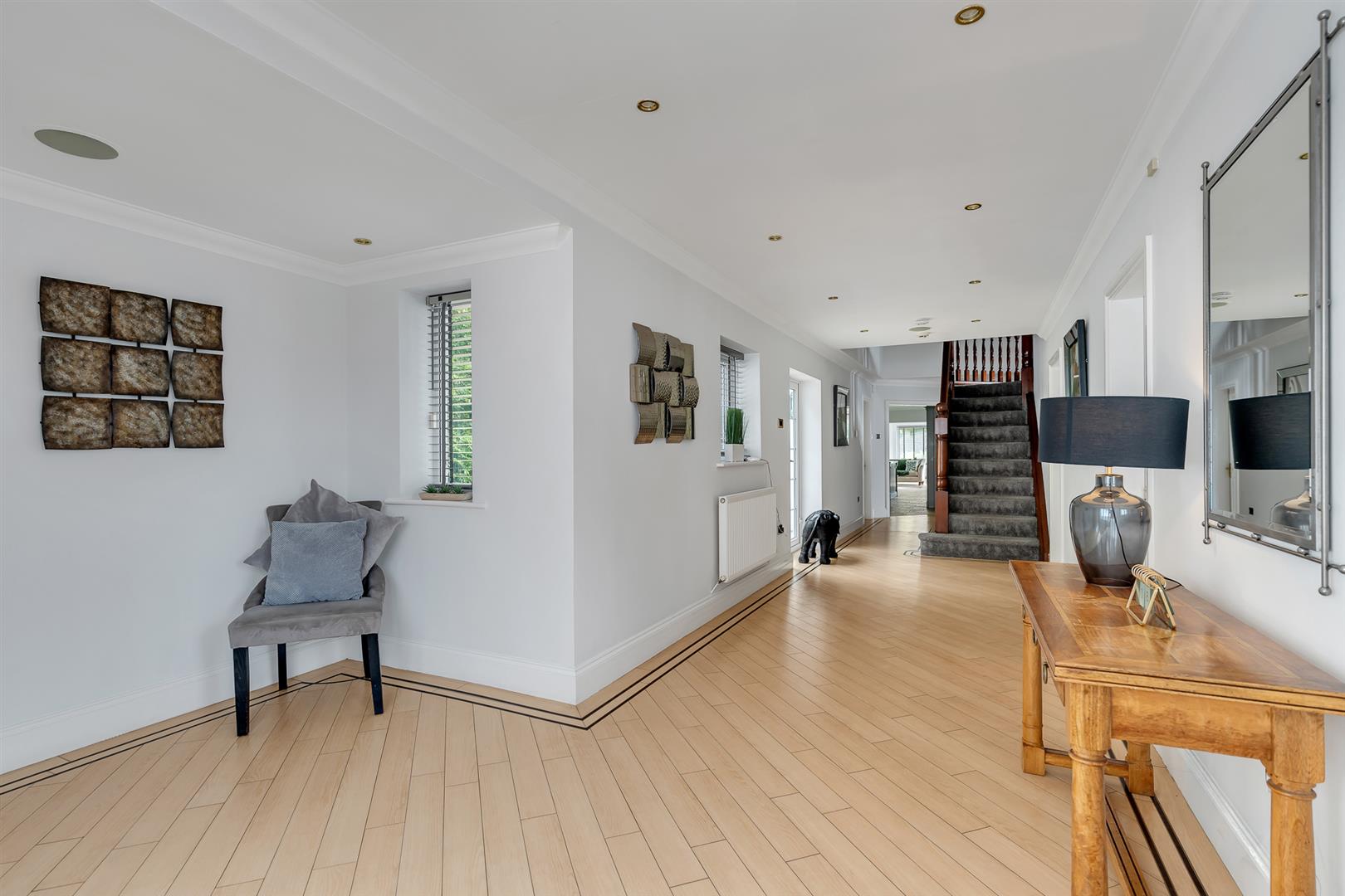 Approached via impressive electric wrought-iron entrance gates, a sweeping block-paved driveway, offering parking for ten or more vehicles, leads past the double garage to the principal entrance. A stone-framed doorway opens into an expansive reception hall, finished with Amtico flooring and featuring two separate staircases rising to the first floor.