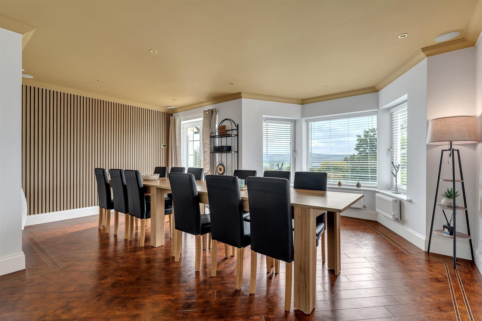 The ground-floor accommodation offers a superb balance of formal and informal living spaces. The snug provides an intimate retreat, while the dining room is a light-filled and spacious setting, comfortably accommodating a twenty-seat table, ideal for entertaining on a grand scale. Two ground-floor cloakrooms serve the reception areas, one housing one of the property’s three boilers and a hot water cylinder.