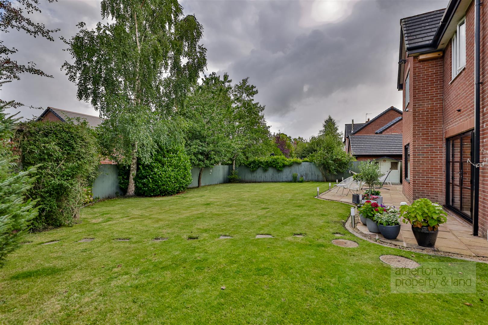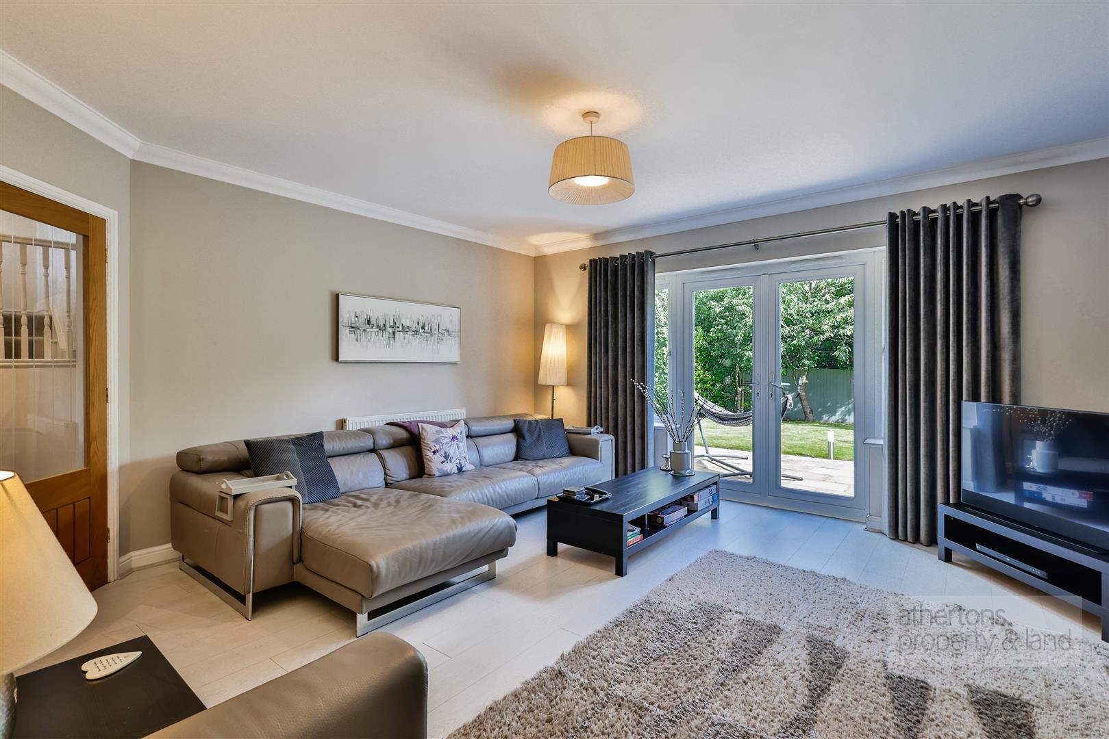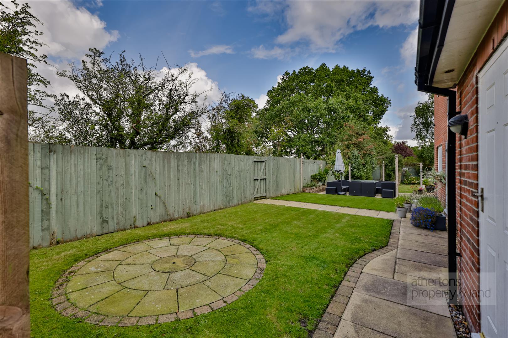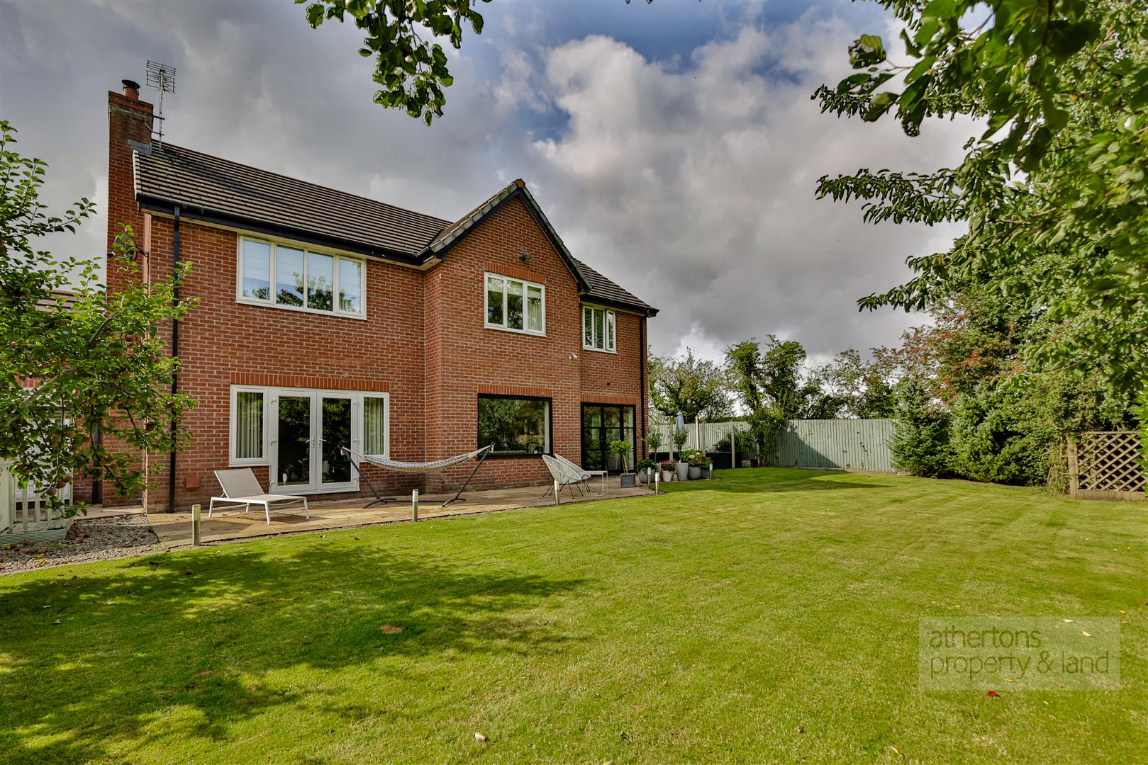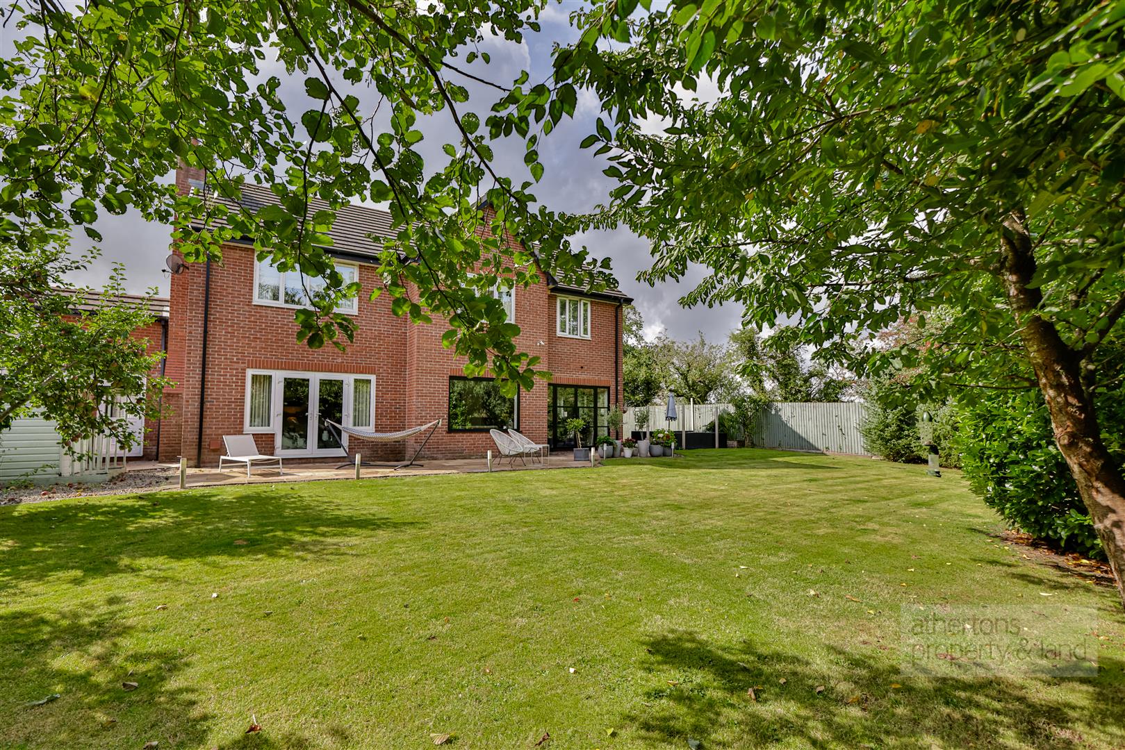 The grounds have been thoughtfully landscaped to provide year-round enjoyment. To the side, a west-facing garden offers multiple patio and seating areas – the perfect spot to enjoy afternoon and evening sunsets over the surrounding farmland. To the rear, the garden is mainly laid to lawn with a further patio, mature tree-lined borders for privacy, and gated side access to the front, where a four-car driveway leads to the attached double garage with twin up-and-over doors.