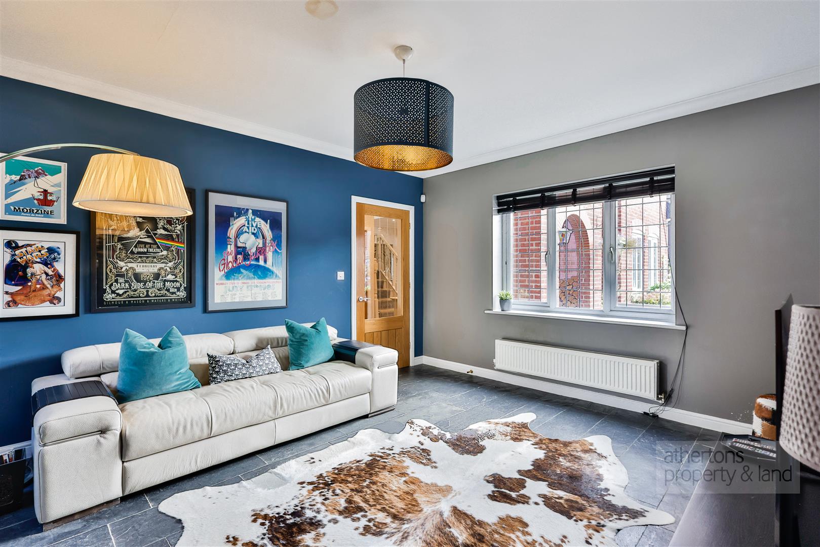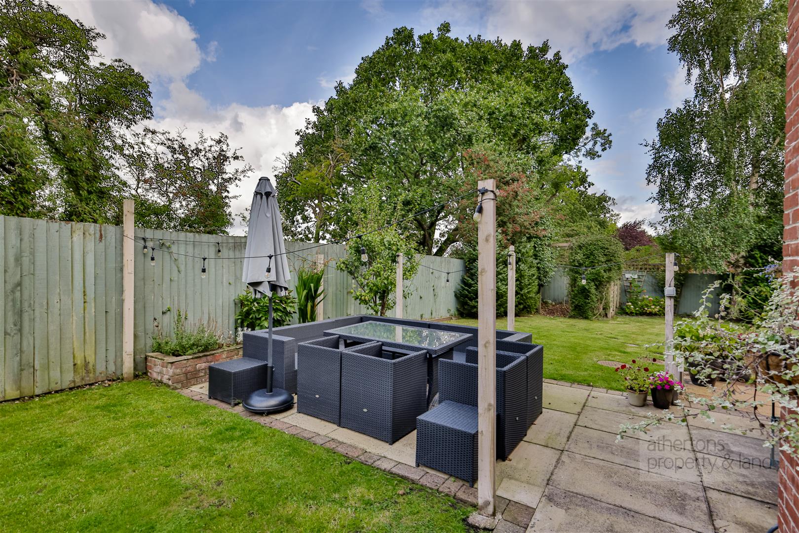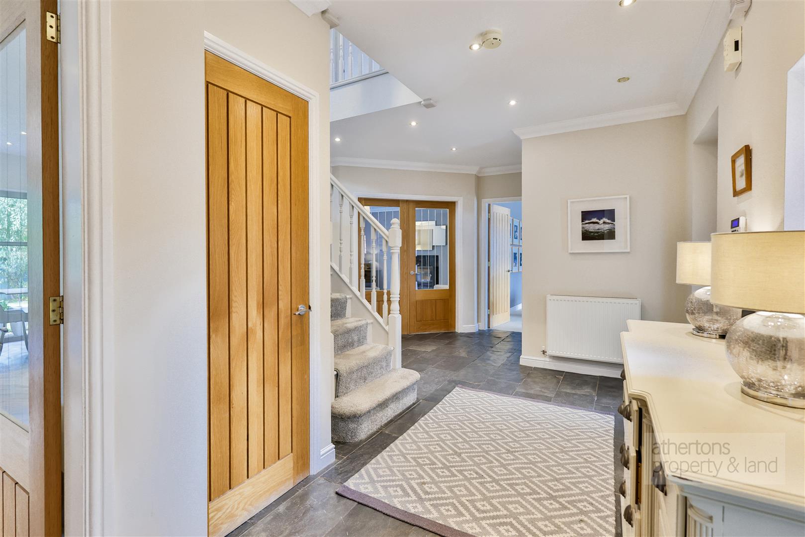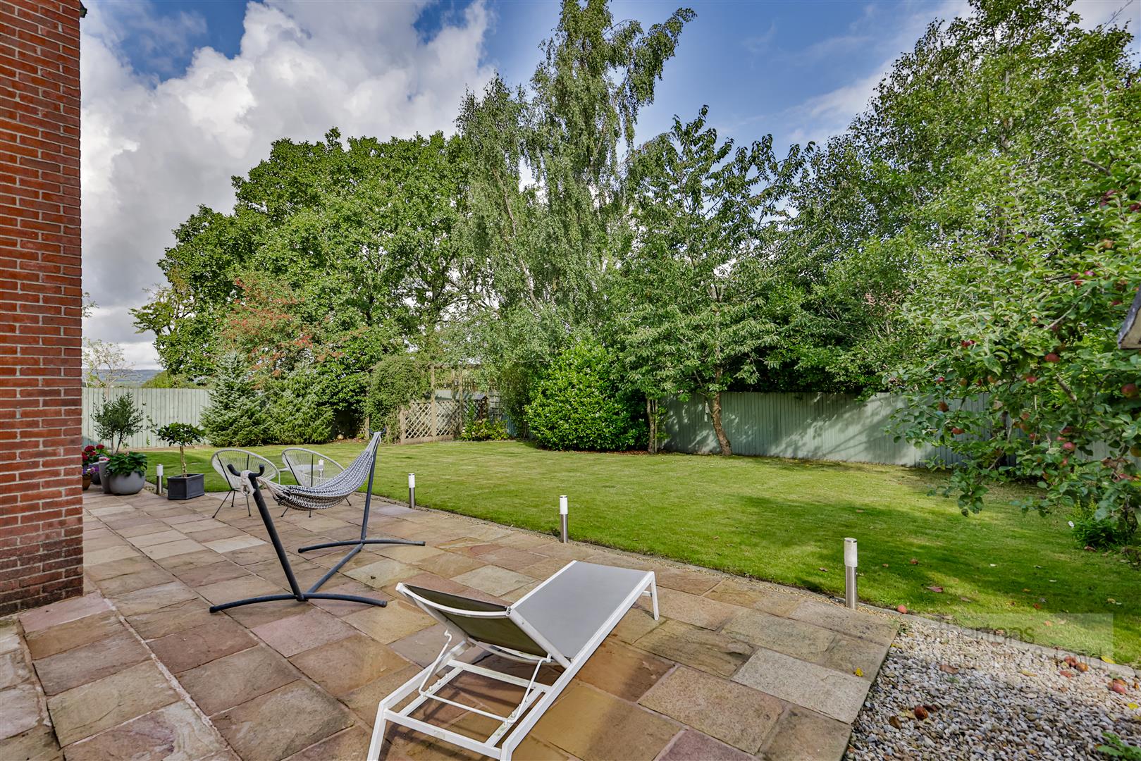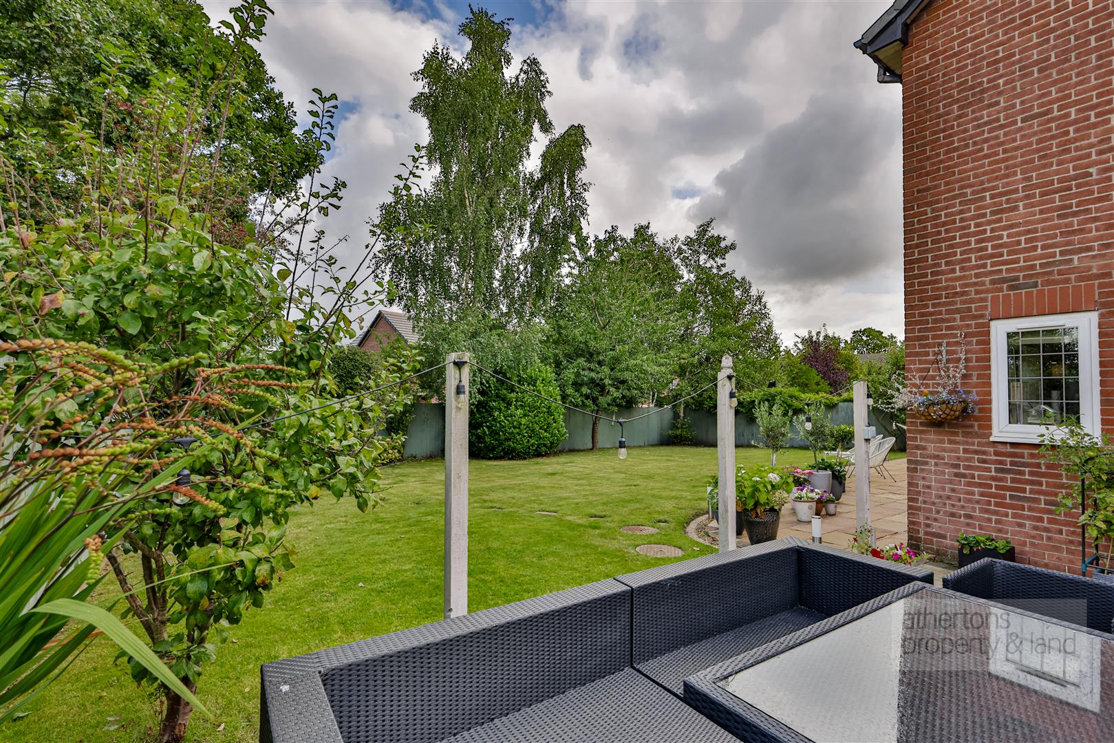The grounds have been thoughtfully landscaped to provide year-round enjoyment. To the side, a west-facing garden offers multiple patio and seating areas – the perfect spot to enjoy afternoon and evening sunsets over the surrounding farmland. To the rear, the garden is mainly laid to lawn with a further patio, mature tree-lined borders for privacy, and gated side access to the front, where a four-car driveway leads to the attached double garage with twin up-and-over doors.