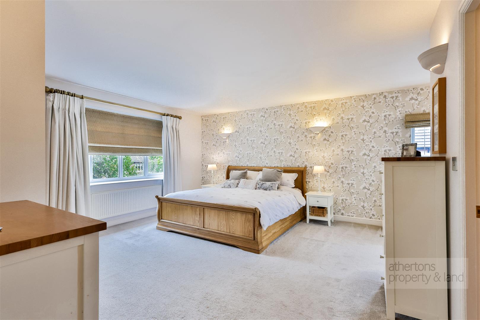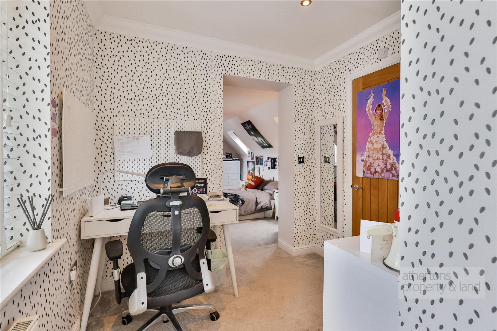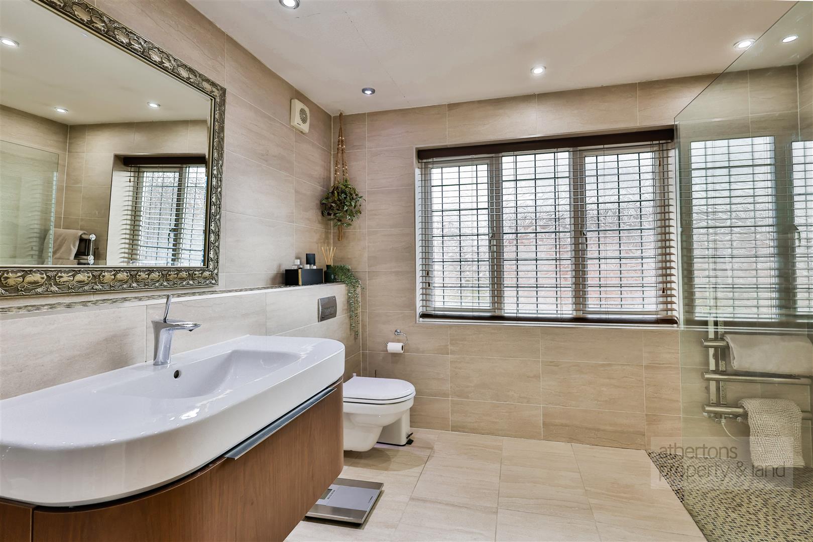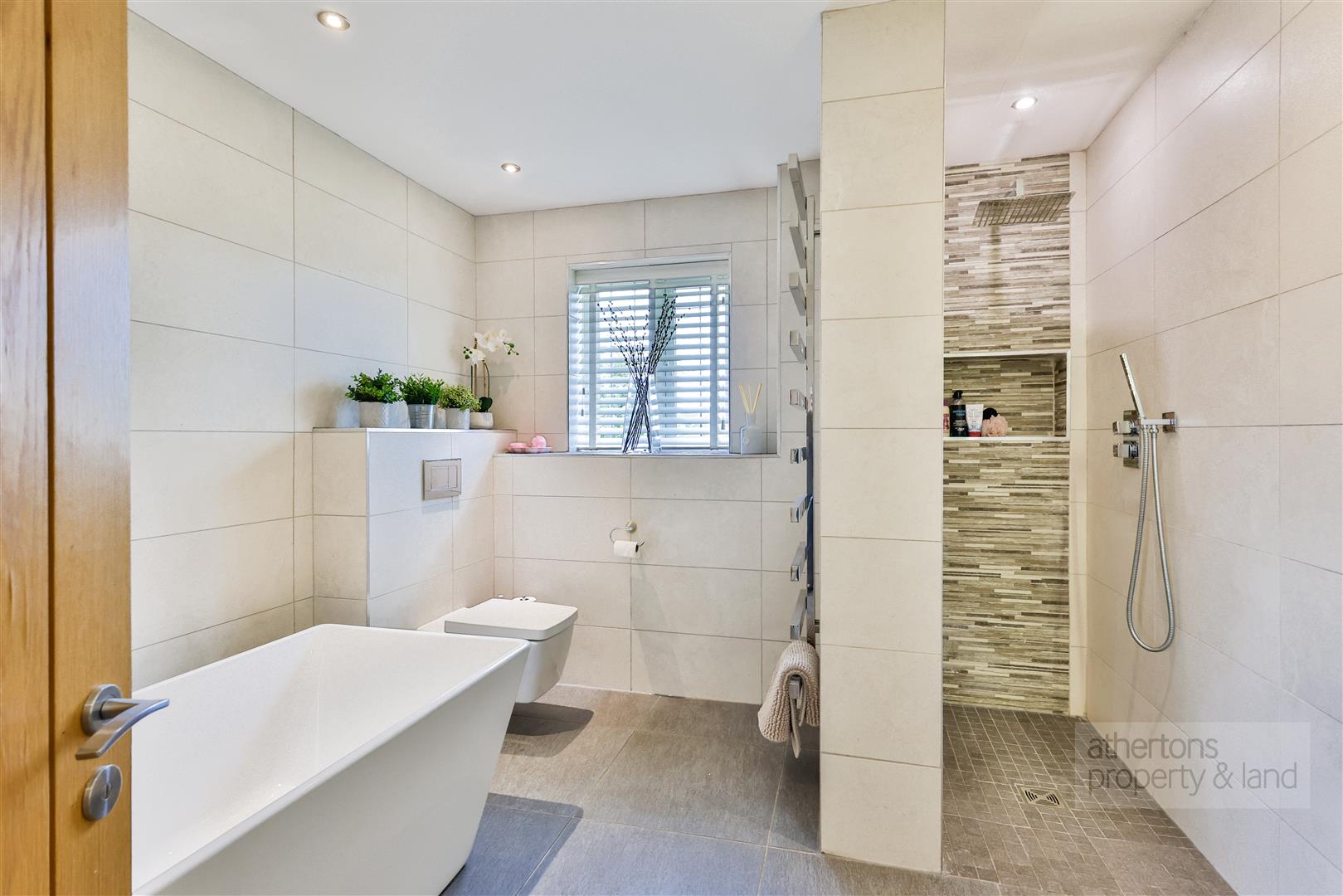 The first-floor galleried landing leads to the house bathroom and five generously proportioned bedrooms, two of which enjoy en-suite facilities. The principal suite is a luxurious retreat, featuring a dressing room, fitted wardrobes, and a stylish en-suite with walk-in rainfall shower, wall-mounted WC, and vanity wash basin. A second large bedroom, located above the garage, also benefits from its own en-suite and dressing area, currently used as a small office. The remaining bedrooms are well-sized and enjoy pleasant aspects and excellent privacy, while the family bathroom is fitted with a contemporary four-piece suite comprising a freestanding bath, rainfall shower cubicle, vanity wash basin, and wall-mounted WC, all finished with elegant tiling and feature lighting.