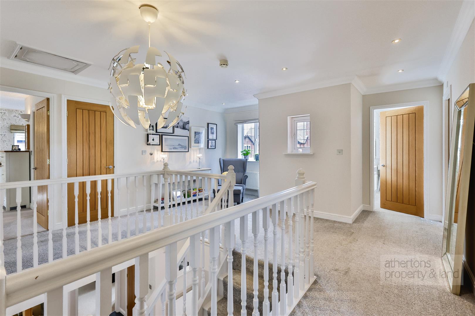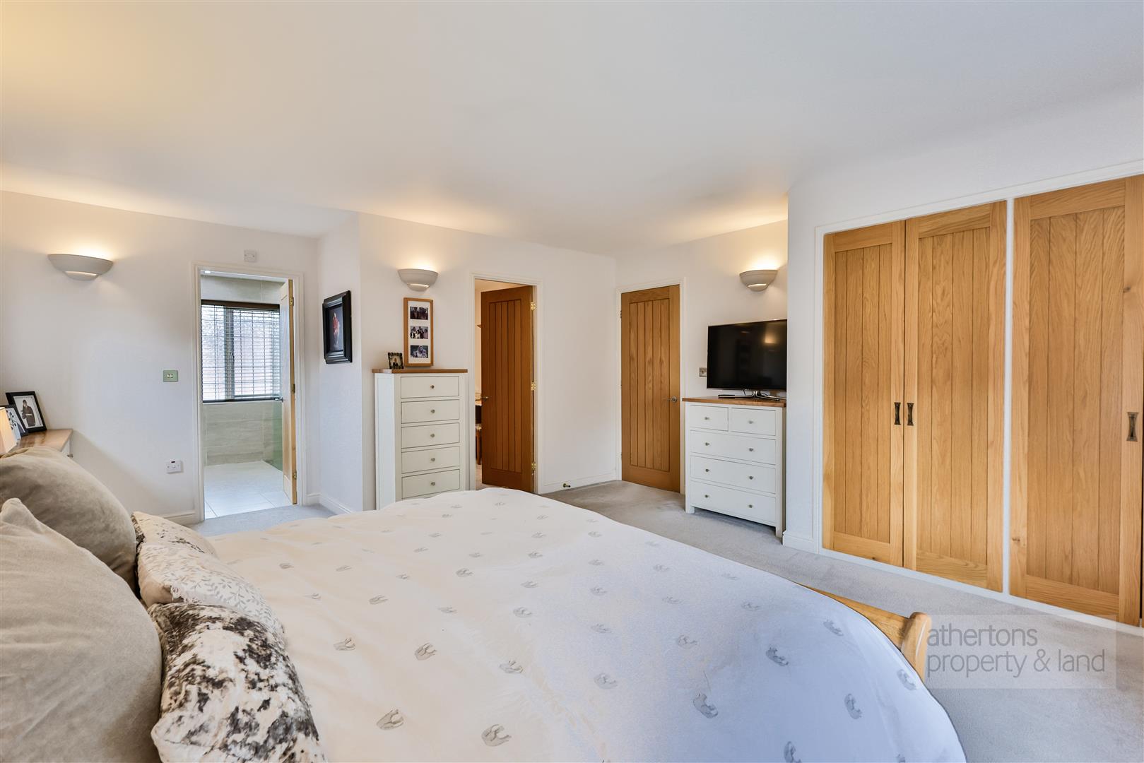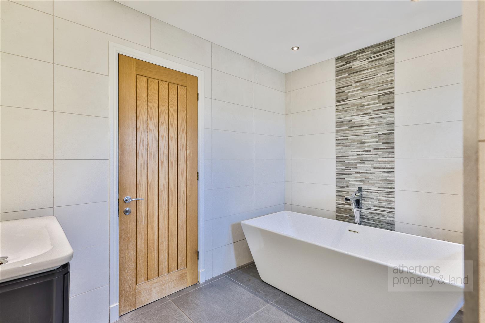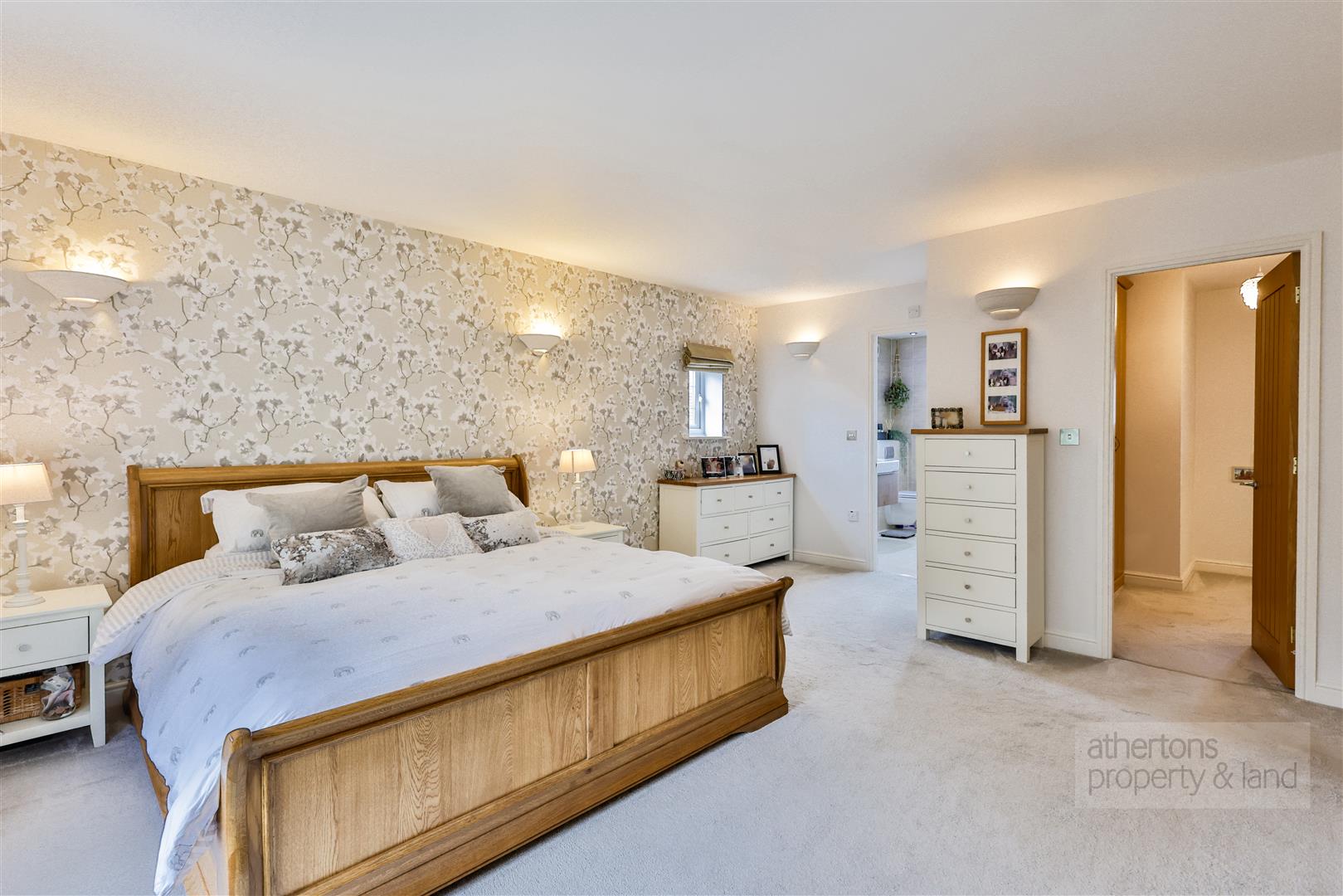 The first-floor galleried landing leads to the house bathroom and five generously proportioned bedrooms, two of which enjoy en-suite facilities. The principal suite is a luxurious retreat, featuring a dressing room, fitted wardrobes, and a stylish en-suite with walk-in rainfall shower, wall-mounted WC, and vanity wash basin. A second large bedroom, located above the garage, also benefits from its own en-suite and dressing area, currently used as a small office. The remaining bedrooms are well-sized and enjoy pleasant aspects and excellent privacy, while the family bathroom is fitted with a contemporary four-piece suite comprising a freestanding bath, rainfall shower cubicle, vanity wash basin, and wall-mounted WC, all finished with elegant tiling and feature lighting.