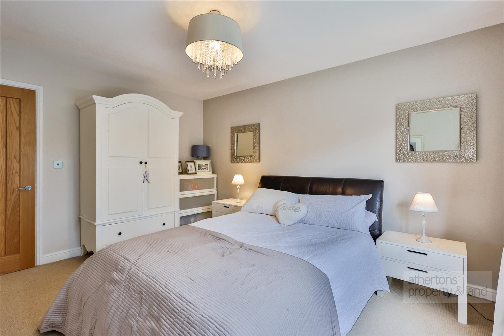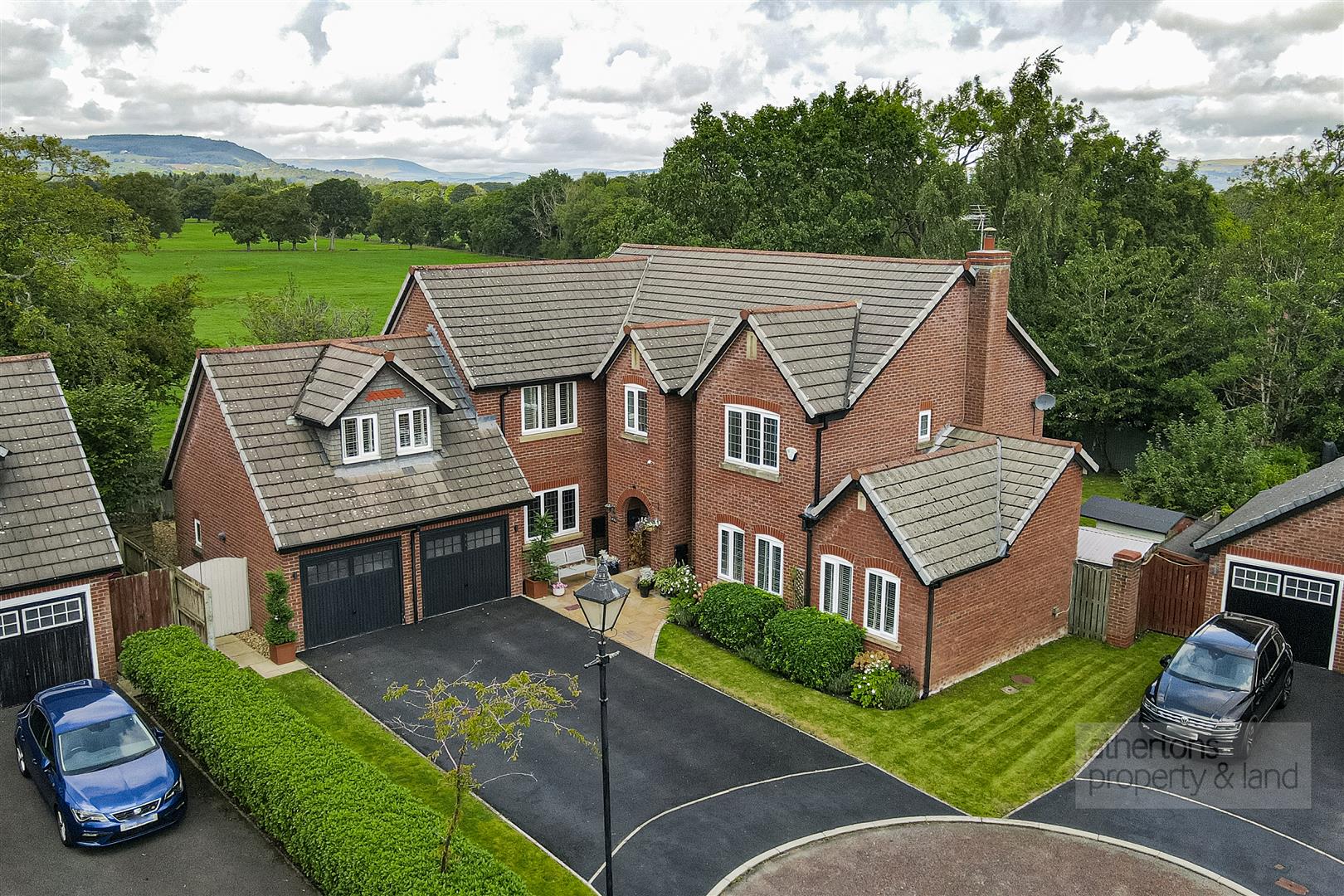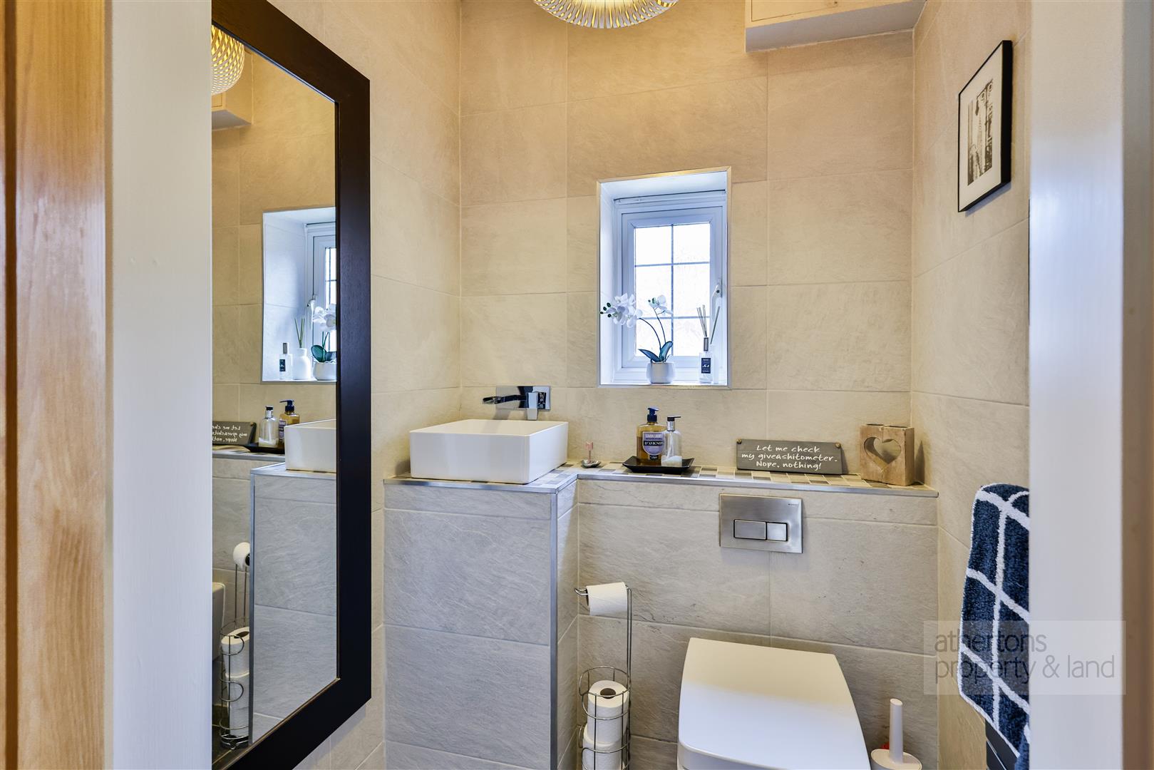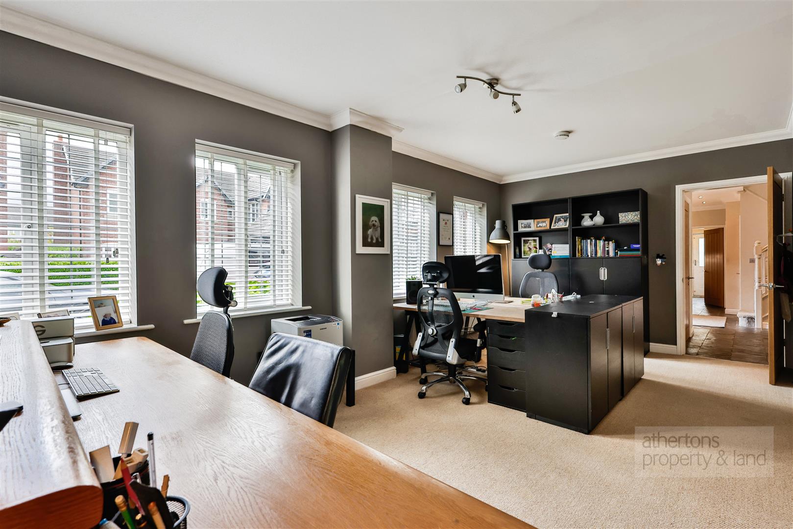 The first-floor galleried landing leads to the house bathroom and five generously proportioned bedrooms, two of which enjoy en-suite facilities. The principal suite is a luxurious retreat, featuring a dressing room, fitted wardrobes, and a stylish en-suite with walk-in rainfall shower, wall-mounted WC, and vanity wash basin. A second large bedroom, located above the garage, also benefits from its own en-suite and dressing area, currently used as a small office. The remaining bedrooms are well-sized and enjoy pleasant aspects and excellent privacy, while the family bathroom is fitted with a contemporary four-piece suite comprising a freestanding bath, rainfall shower cubicle, vanity wash basin, and wall-mounted WC, all finished with elegant tiling and feature lighting.