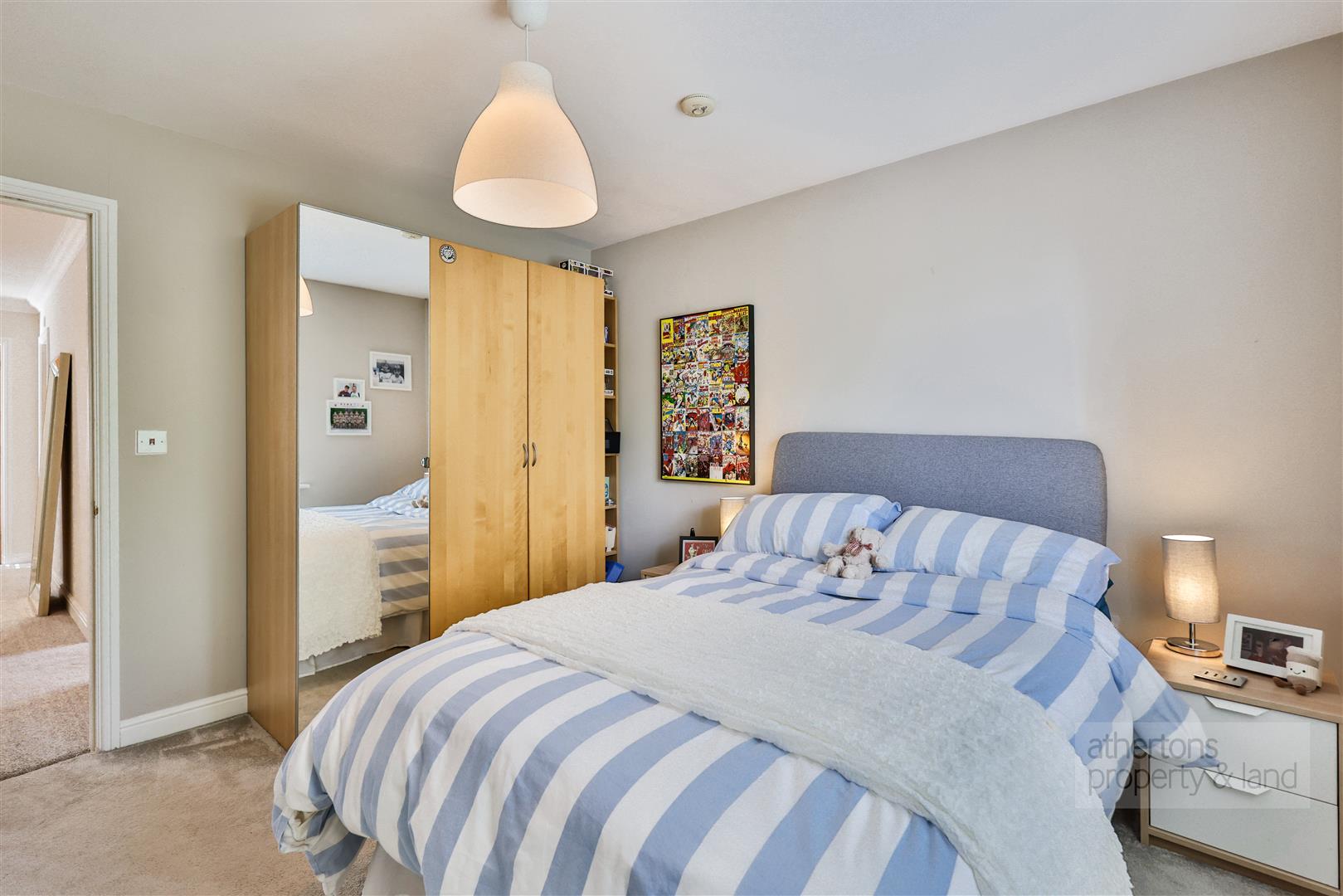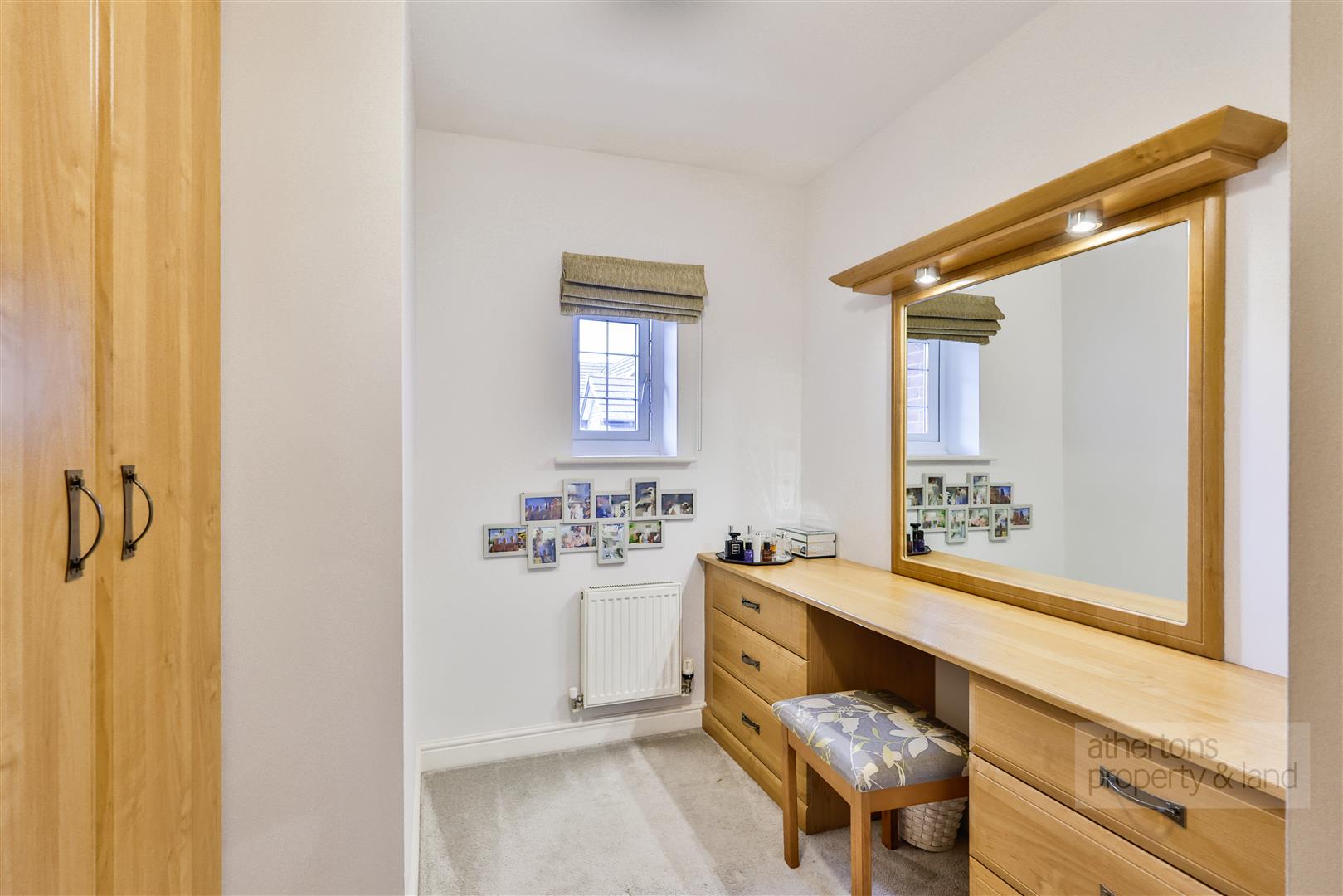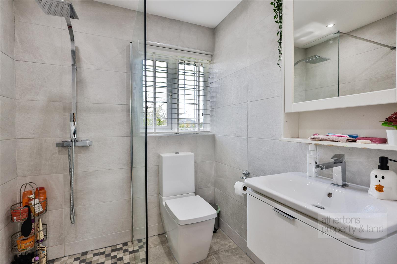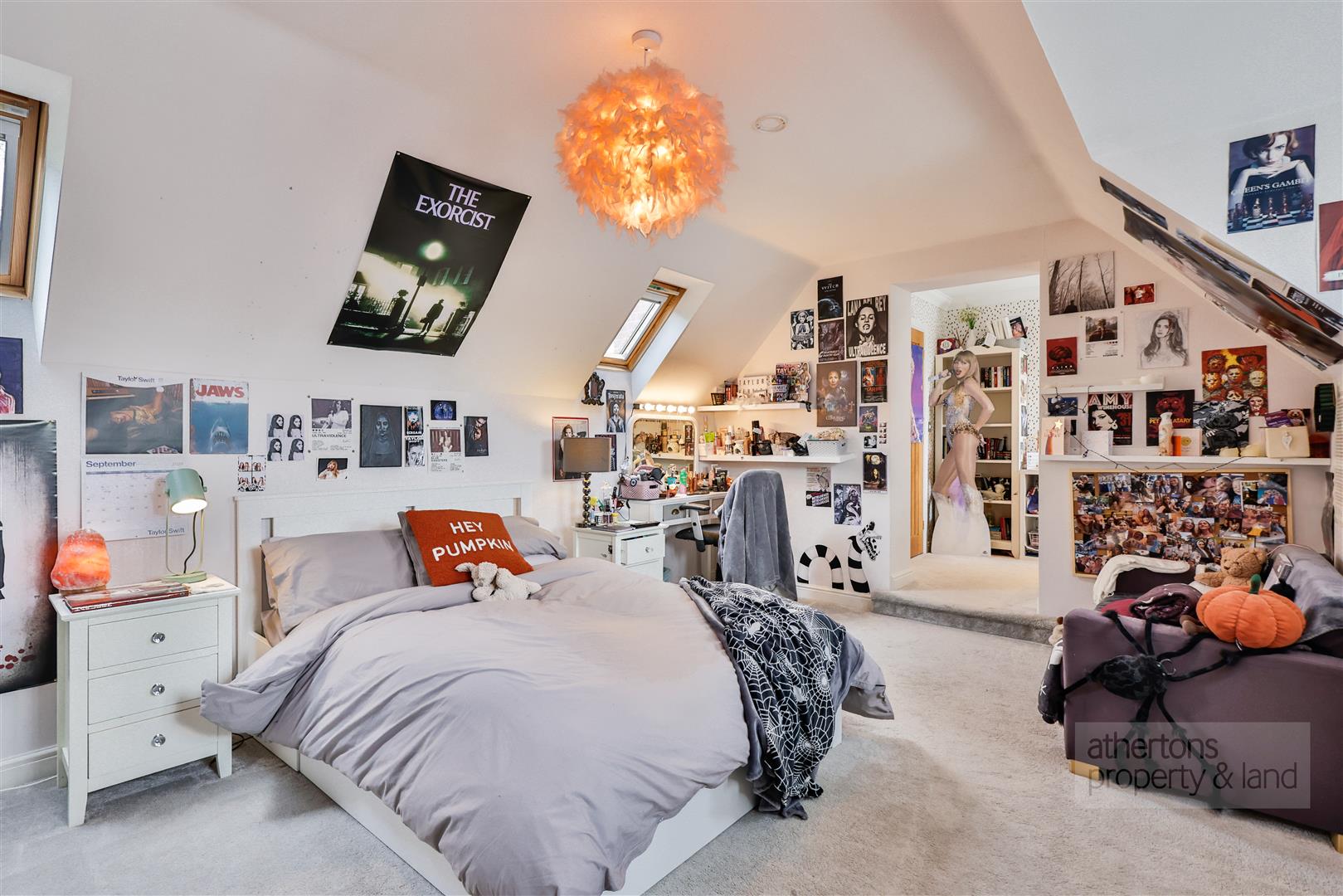 The first-floor galleried landing leads to the house bathroom and five generously proportioned bedrooms, two of which enjoy en-suite facilities. The principal suite is a luxurious retreat, featuring a dressing room, fitted wardrobes, and a stylish en-suite with walk-in rainfall shower, wall-mounted WC, and vanity wash basin. A second large bedroom, located above the garage, also benefits from its own en-suite and dressing area, currently used as a small office. The remaining bedrooms are well-sized and enjoy pleasant aspects and excellent privacy, while the family bathroom is fitted with a contemporary four-piece suite comprising a freestanding bath, rainfall shower cubicle, vanity wash basin, and wall-mounted WC, all finished with elegant tiling and feature lighting.