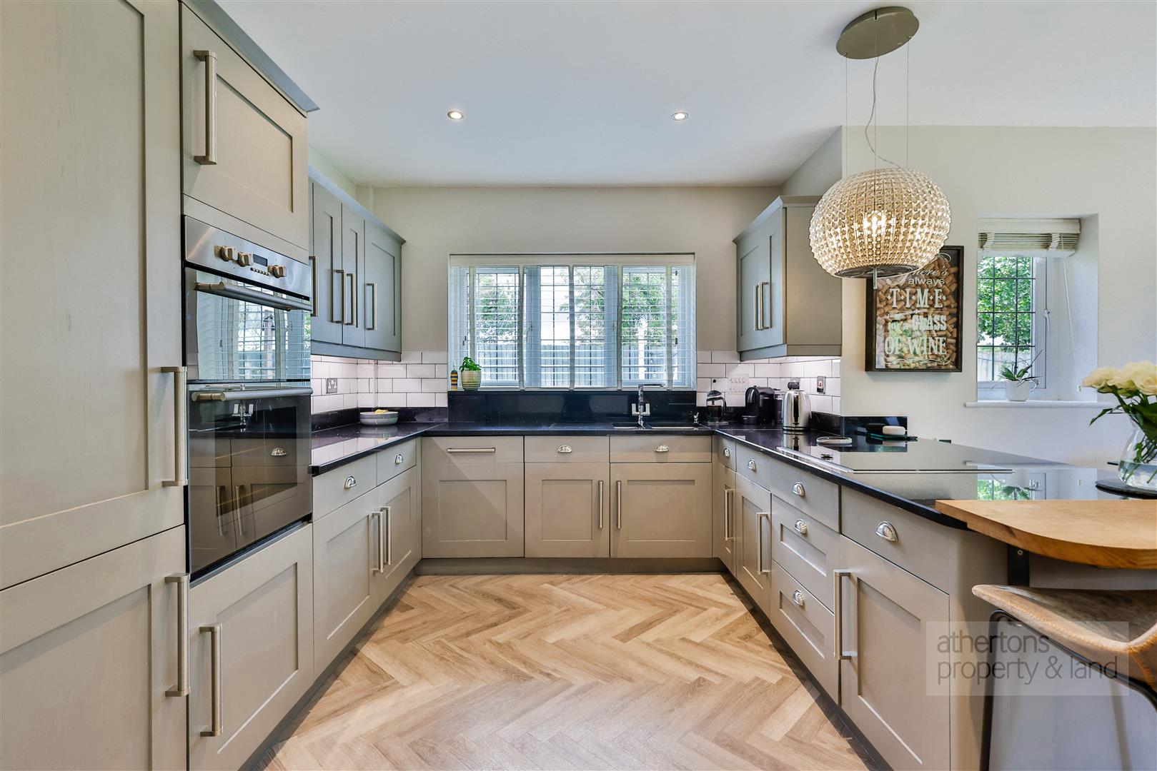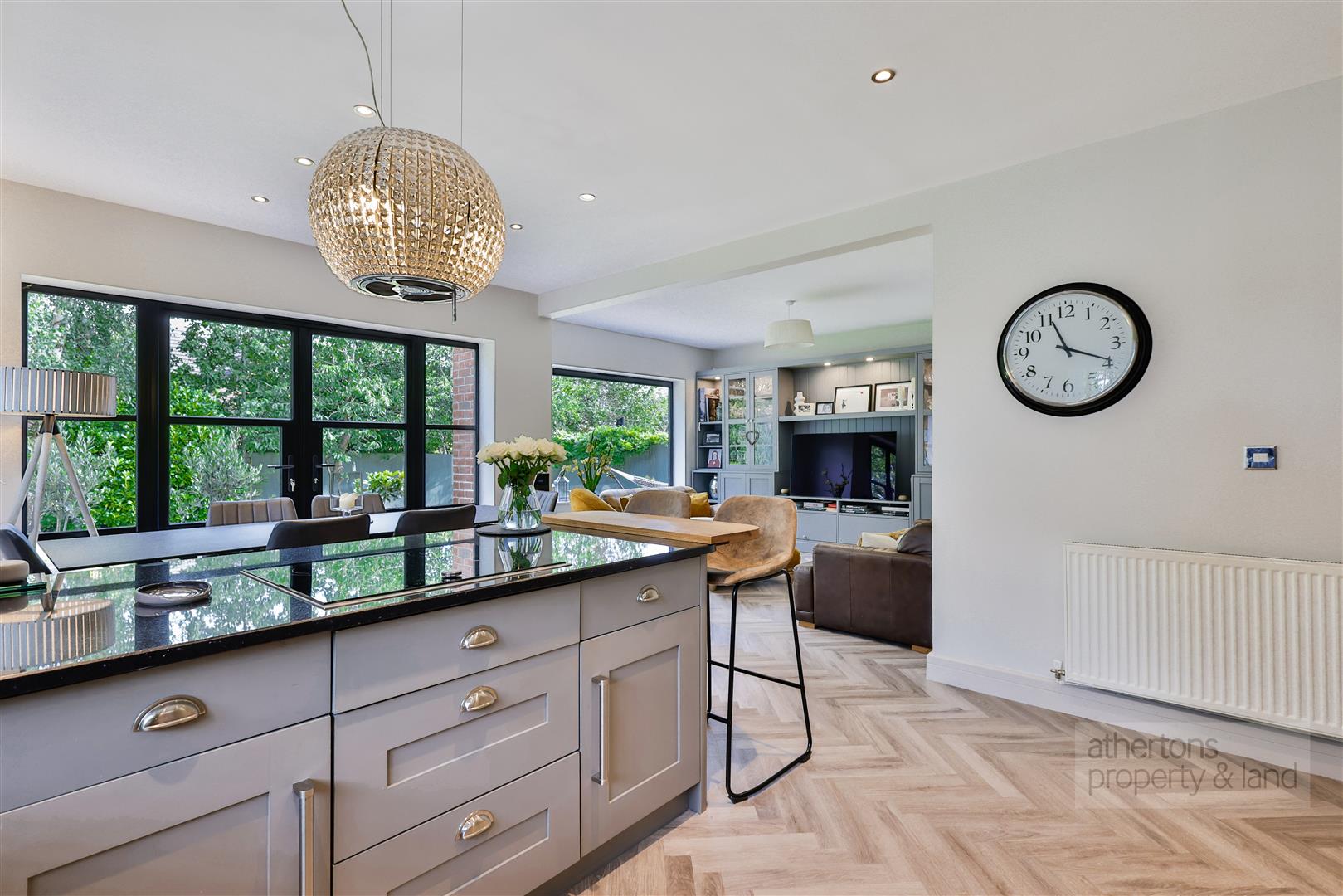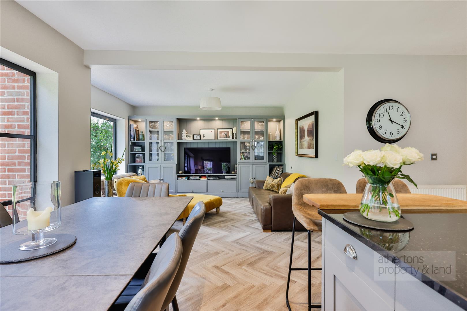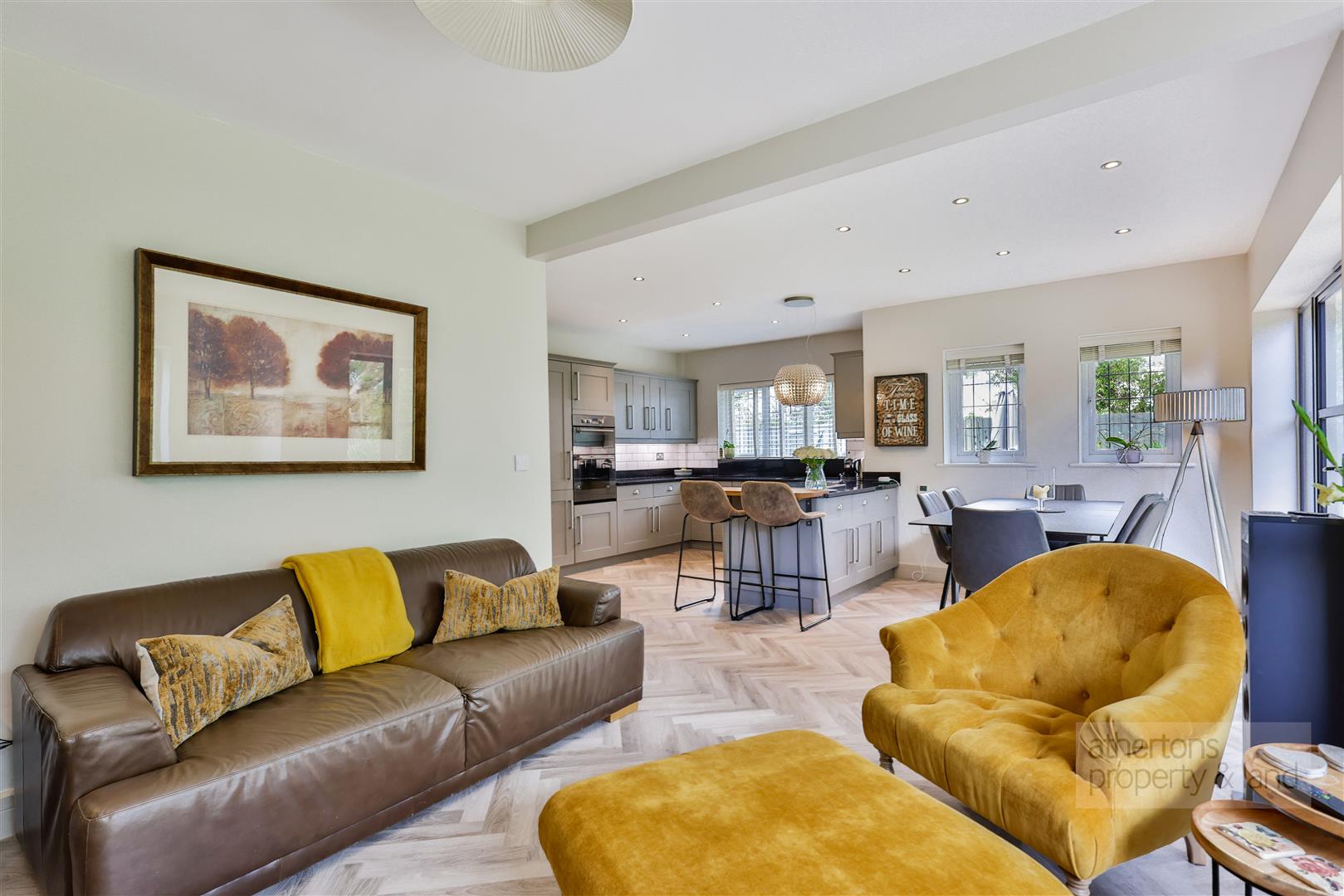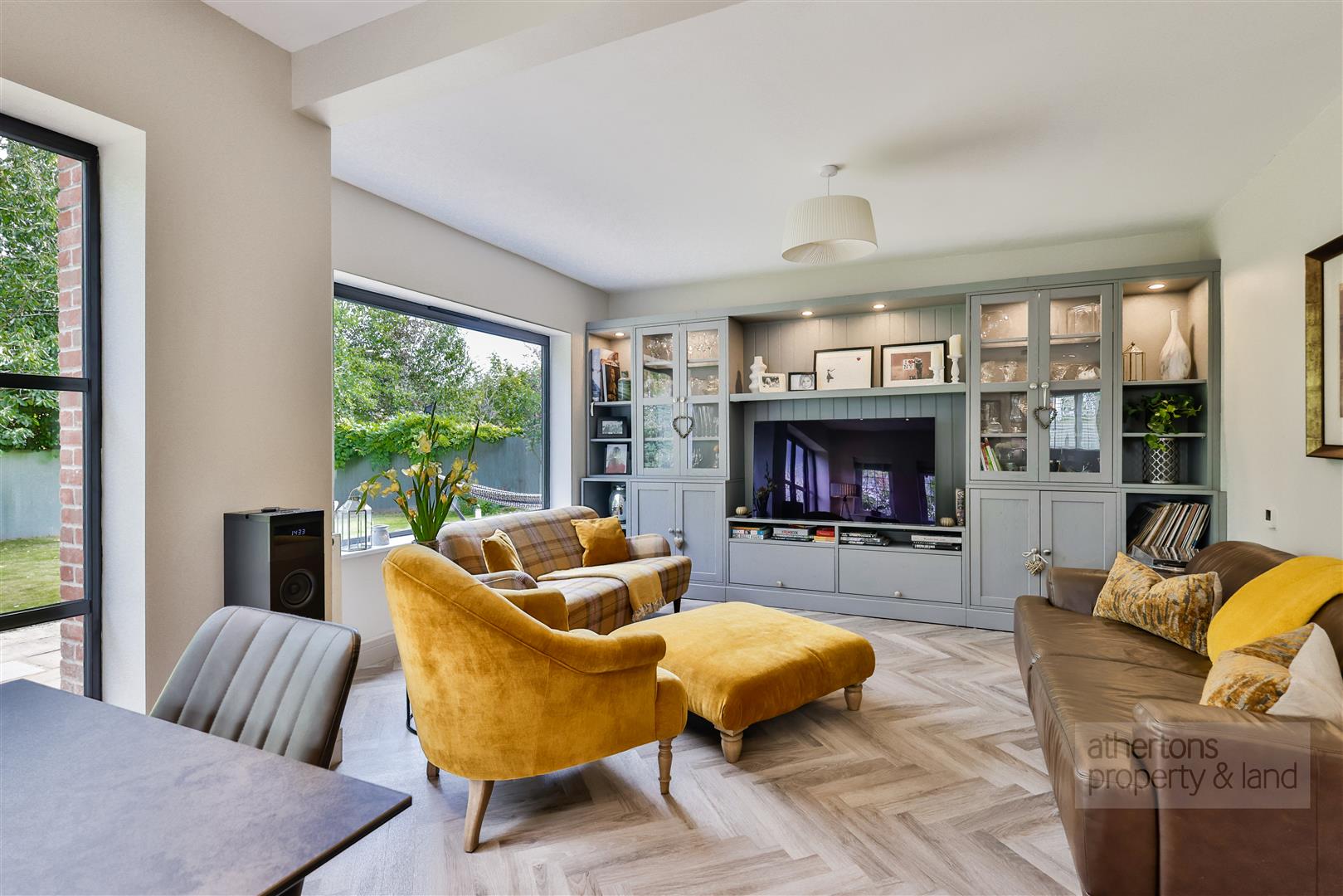 To the rear, the heart of the home is the open-plan kitchen, dining, and snug. Designed with both family living and entertaining in mind, this light-filled space is fitted with an extensive range of base and eye-level units with black granite work surfaces, complemented by a central island with oak breakfast bar. Quality appliances include a Neff induction hob with extractor, Hotpoint double oven, integrated fridge-freezer, and dishwasher. Amtico herringbone flooring adds elegance throughout, flowing into the snug where a bespoke media wall with fitted shelving and cabinetry completes the space. Crittall French doors and a striking feature window flood the area with natural light and open directly onto the garden.