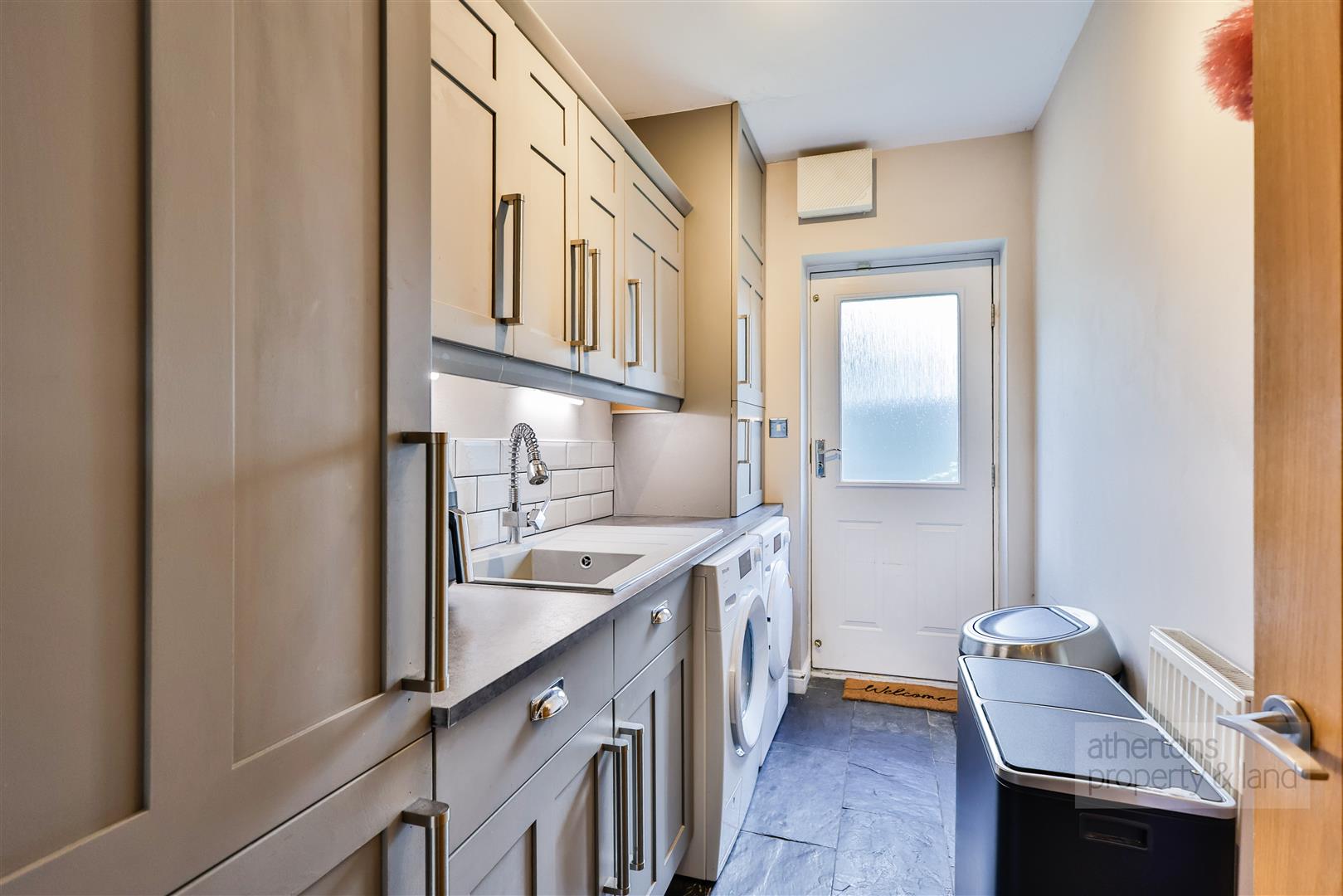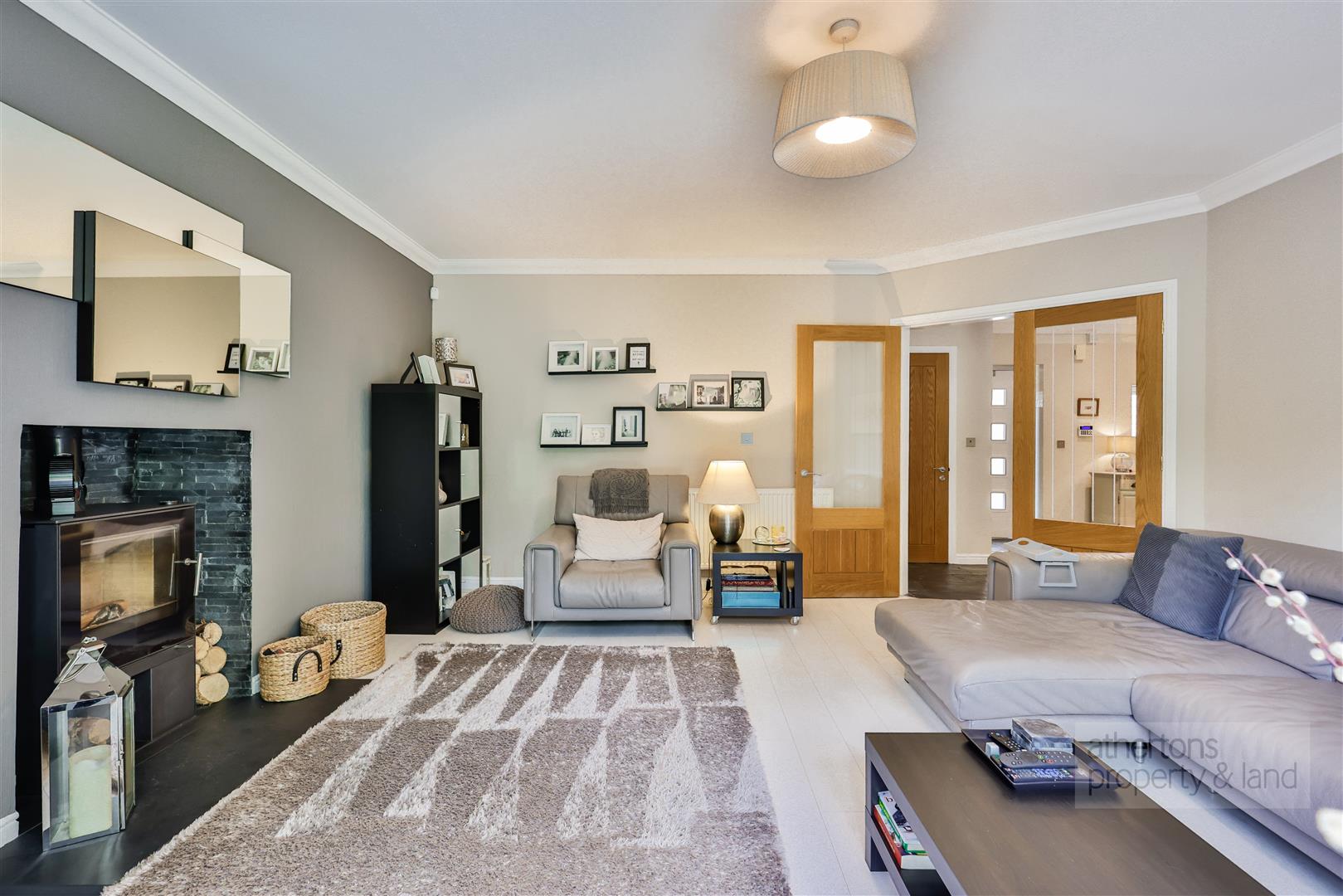 The welcoming entrance hallway is finished with slate tiled flooring and features a return staircase, under-stairs storage, and a stylish two-piece cloakroom. The spacious living room, with its feature log-burning stove and French doors opening onto the rear garden, creates a warm and inviting family and entertaining space. A further office or studio lies adjacent, incorporating the single-storey extension, filled with natural light and offering excellent flexibility for private or professional use.