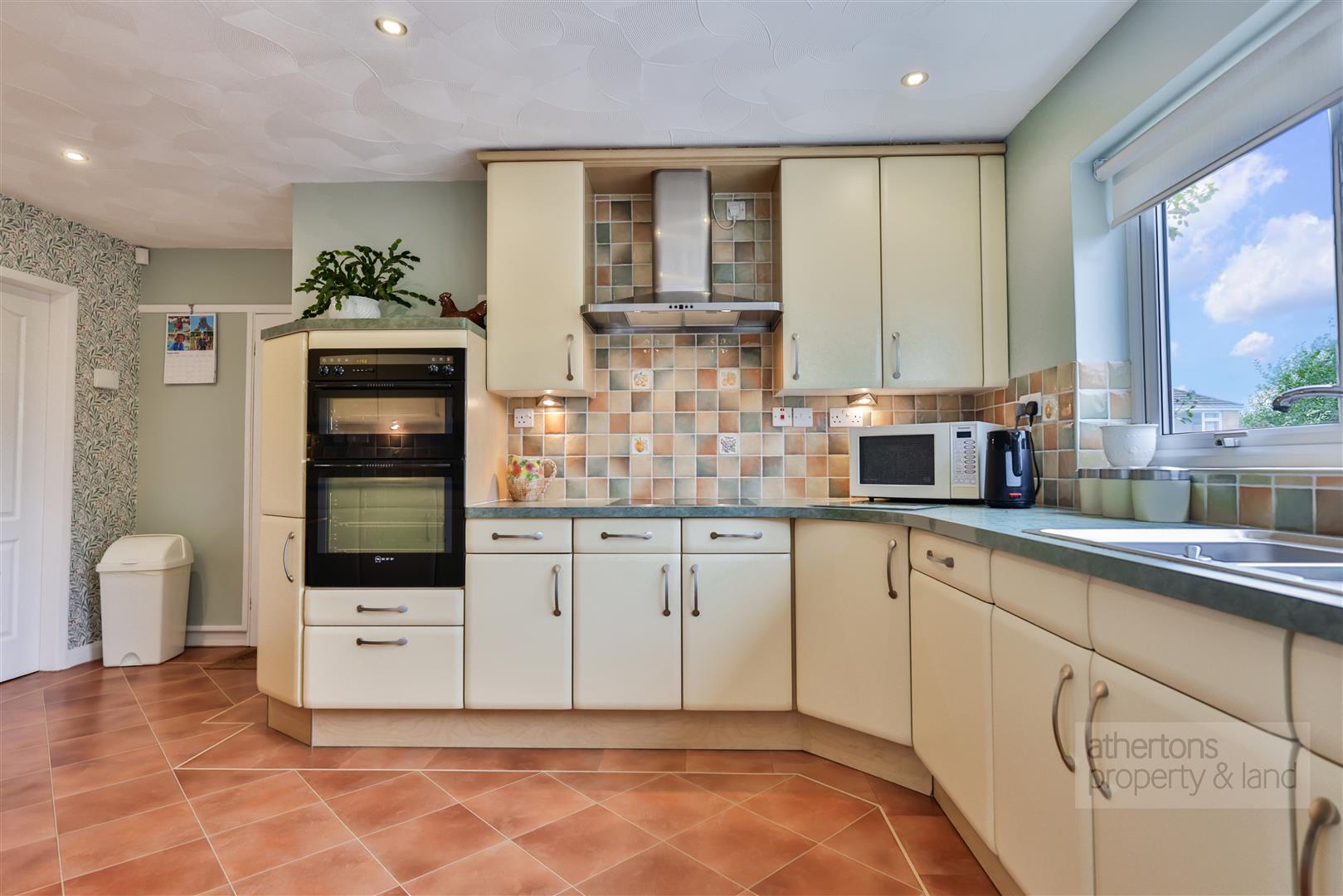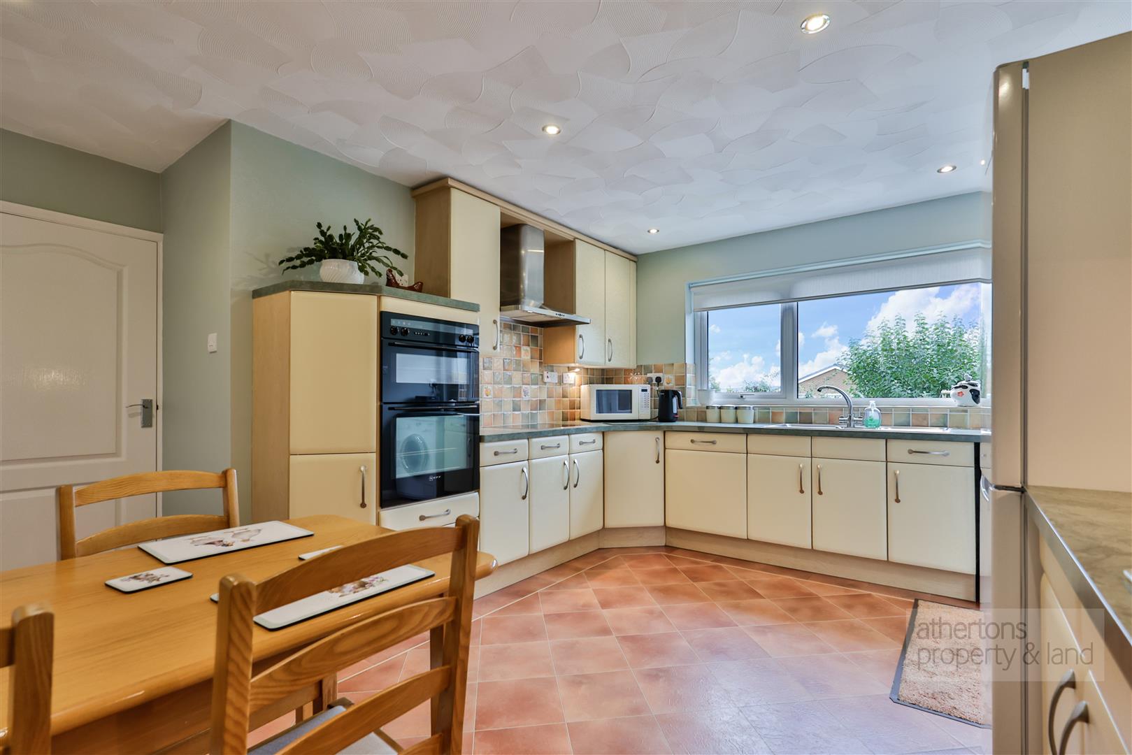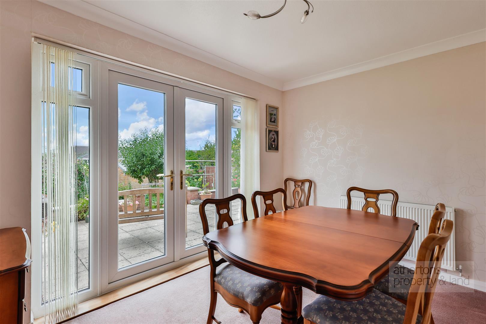 The dining kitchen is well appointed with an extensive range of base and eye-level units, complementary laminate work surfaces with matching upstands, and a host of premium Neff appliances including an induction hob, double oven, and integrated dishwasher. There is also space for a fridge/freezer and dining table, along with an external door to the side of the property and integral access into the double garage. The double garage houses the recently installed heating system including a Worcester Bosch boiler and pressurised hot water cylinder, as well as an electric remote-controlled up-and-over door.