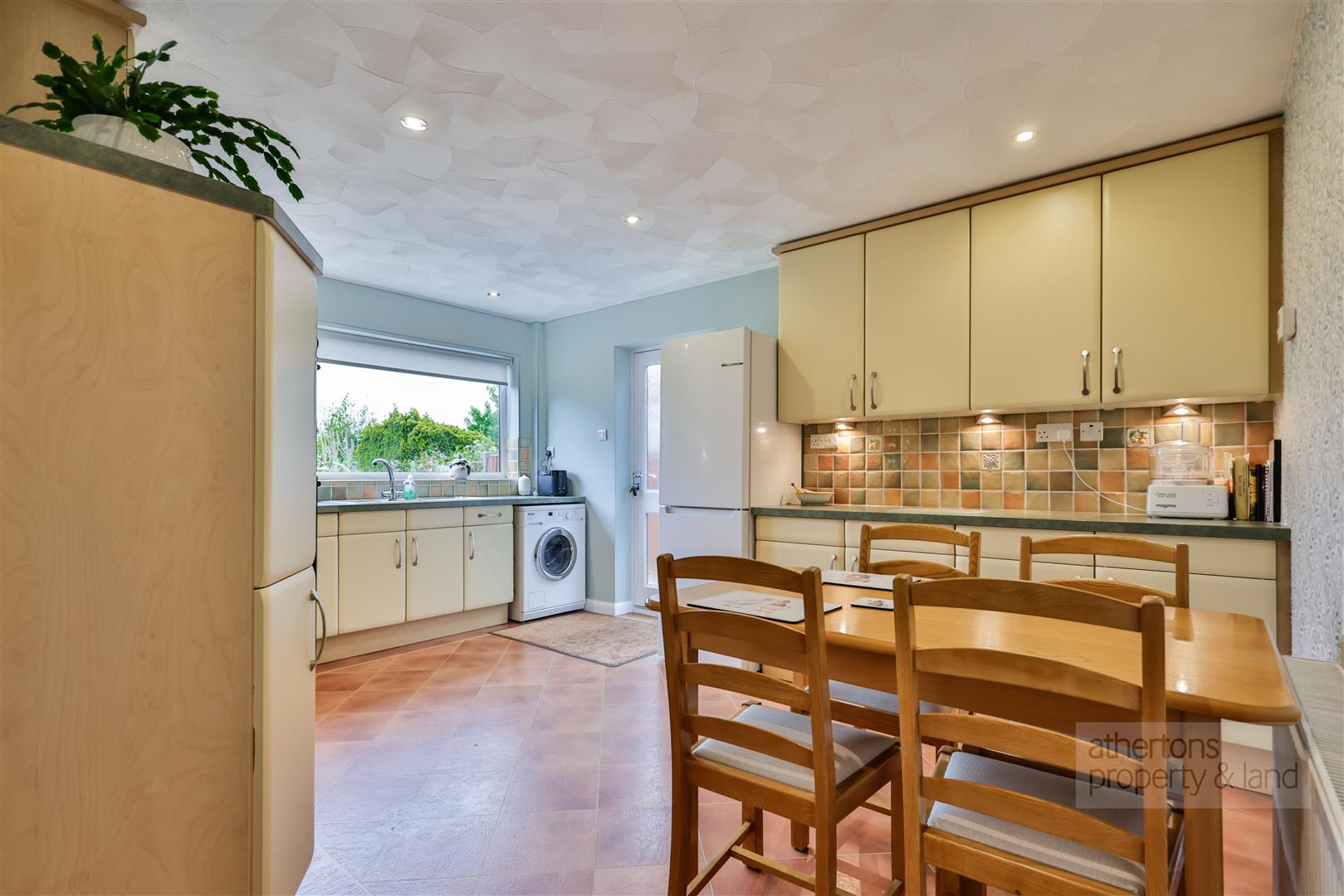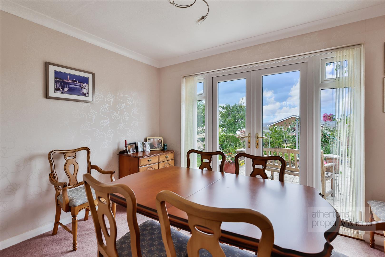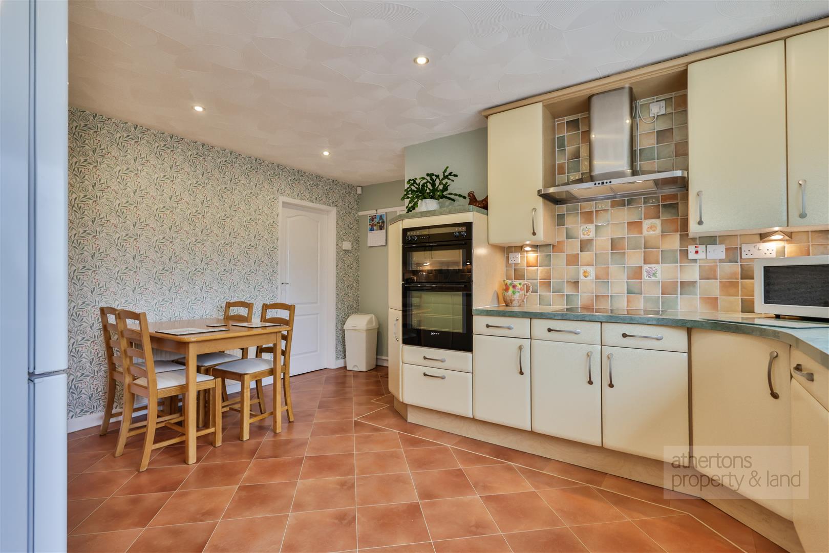 The dining kitchen is well appointed with an extensive range of base and eye-level units, complementary laminate work surfaces with matching upstands, and a host of premium Neff appliances including an induction hob, double oven, and integrated dishwasher. There is also space for a fridge/freezer and dining table, along with an external door to the side of the property and integral access into the double garage. The double garage houses the recently installed heating system including a Worcester Bosch boiler and pressurised hot water cylinder, as well as an electric remote-controlled up-and-over door.