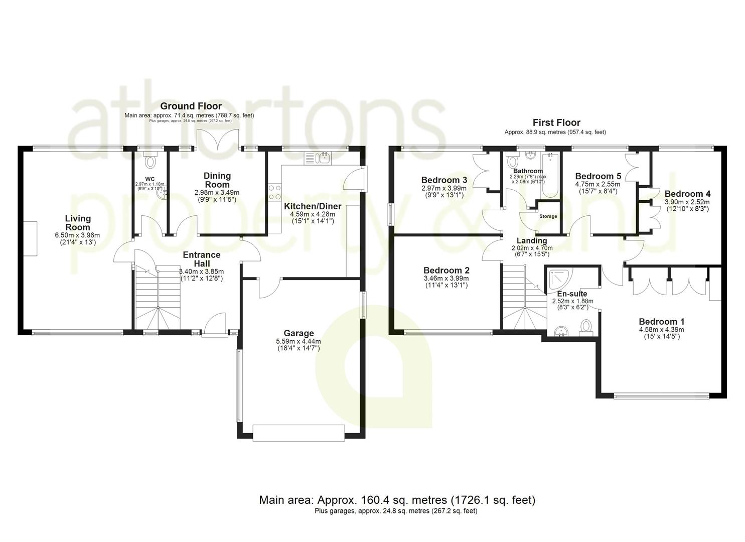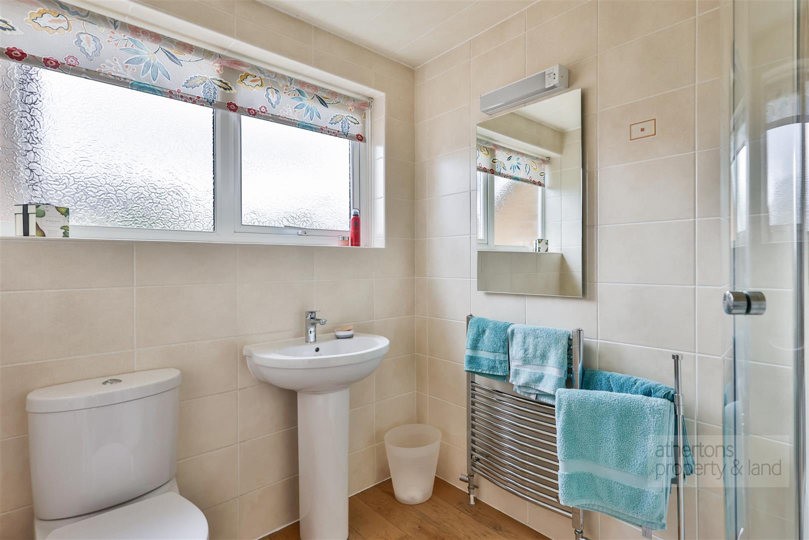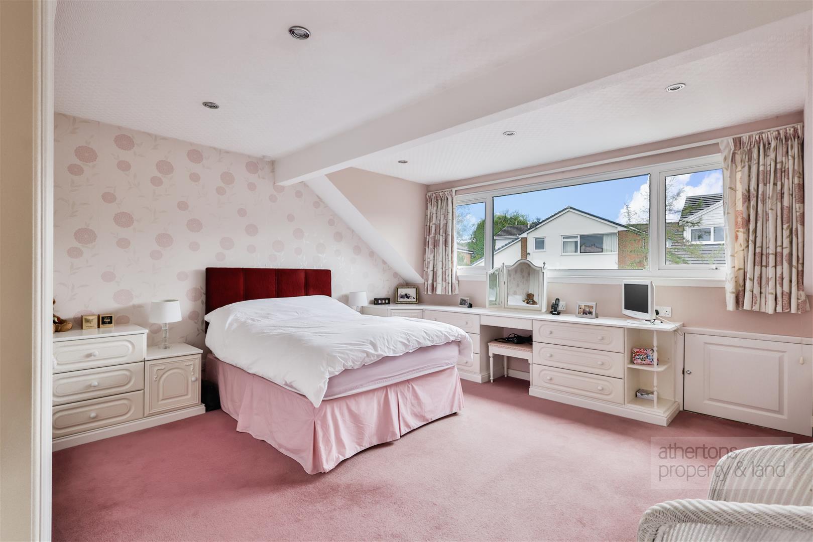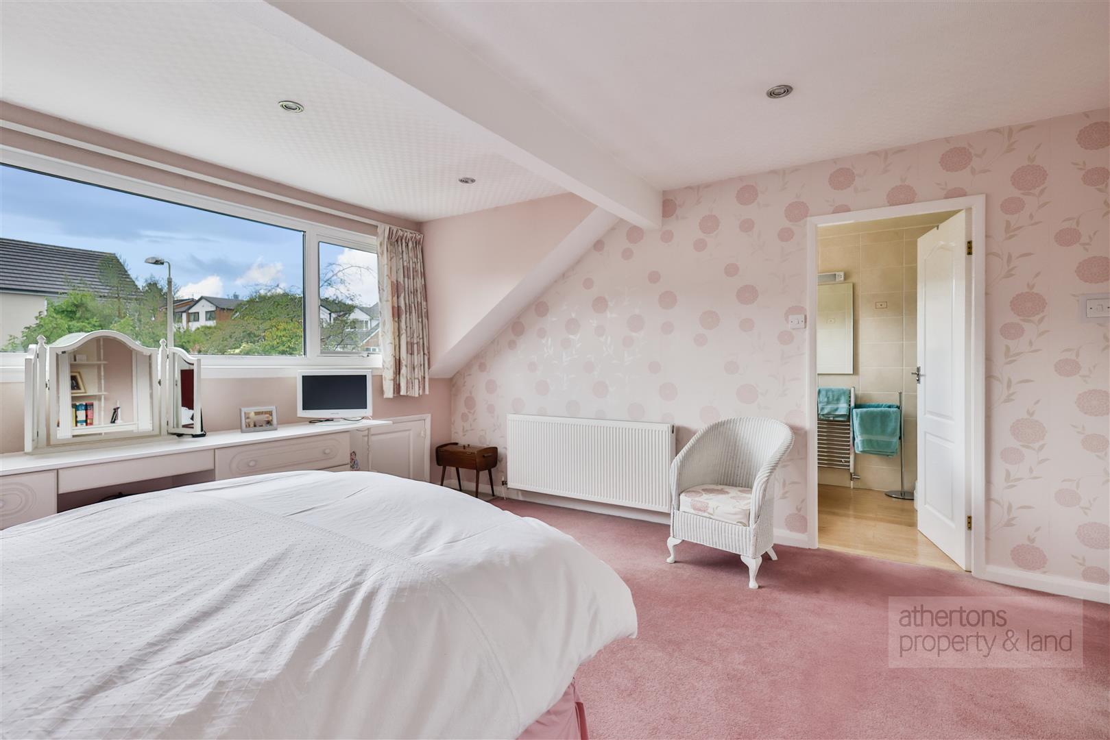To the first floor, a spacious landing with airing cupboard and loft access serves five double bedrooms. The principal suite enjoys fitted wardrobes and a contemporary en-suite shower room featuring a corner electric shower, vanity unit, towel rail, and dual flush WC. Bedrooms three, four, and five all benefit from fitted wardrobes, while bedroom two is a generous double with ample space for additional furniture. The family bathroom is well appointed with a panelled bath with shower over, pedestal basin, WC, chrome towel rail, and tiled flooring.
