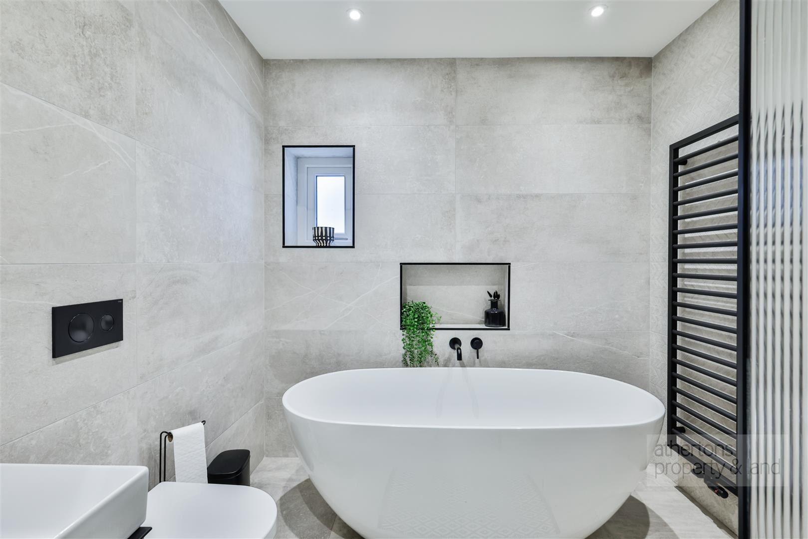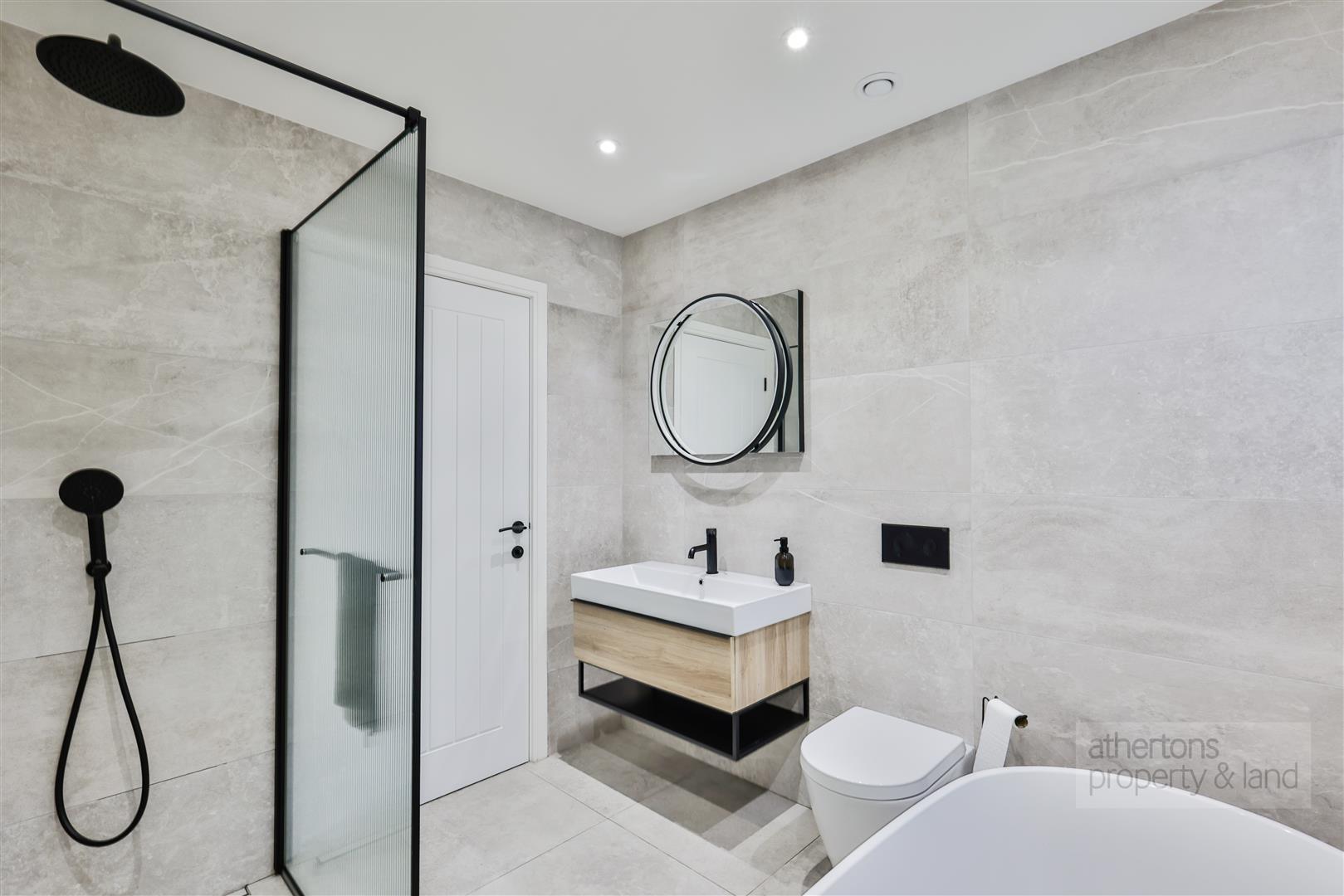 The luxurious family bathroom on this level would grace any showroom, fully tiled with an elegant free-standing oval bath, walk-in rainfall shower with black chrome heated towel rail and alcove shelving, wall-mounted dual flush WC, and vanity wash basin.