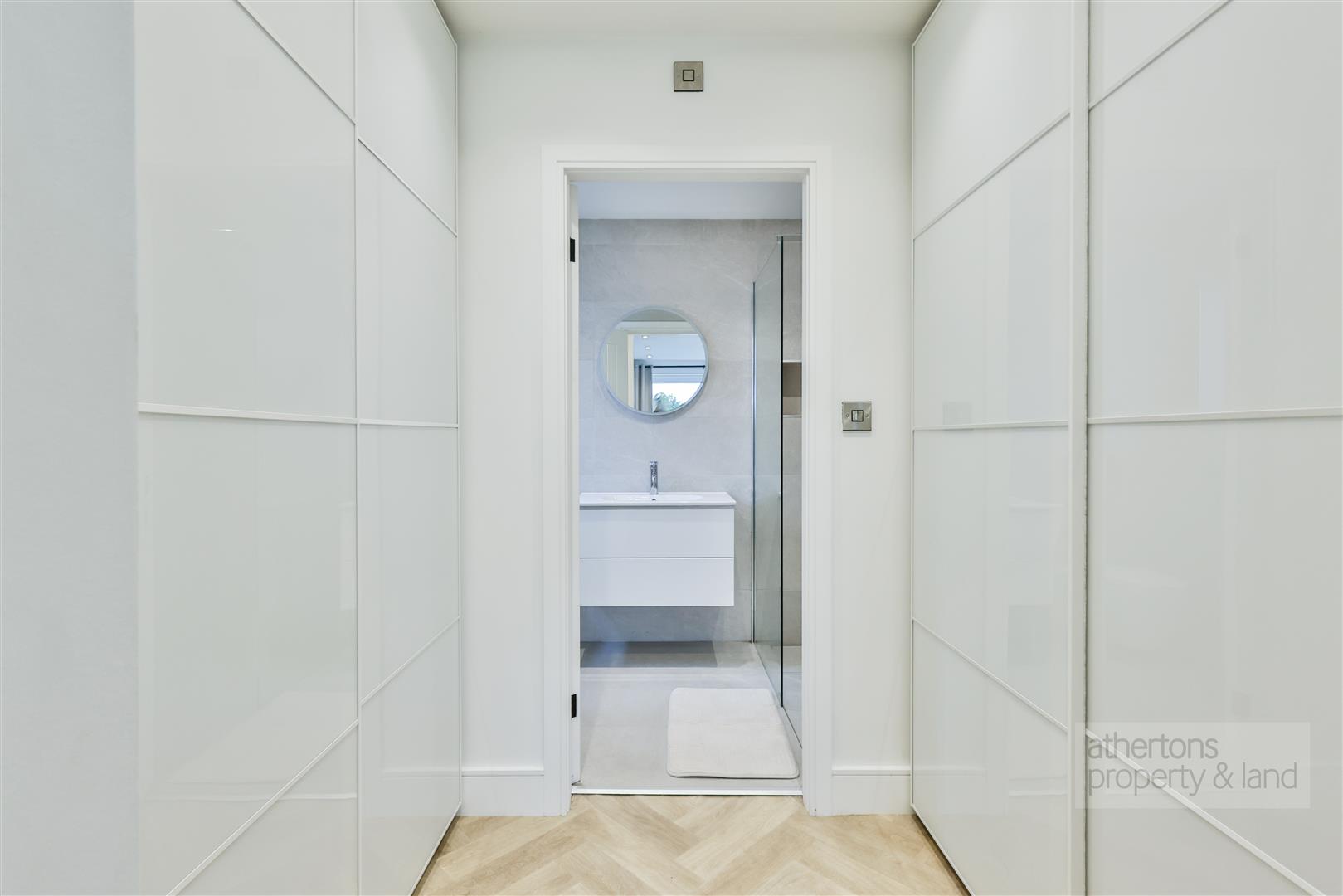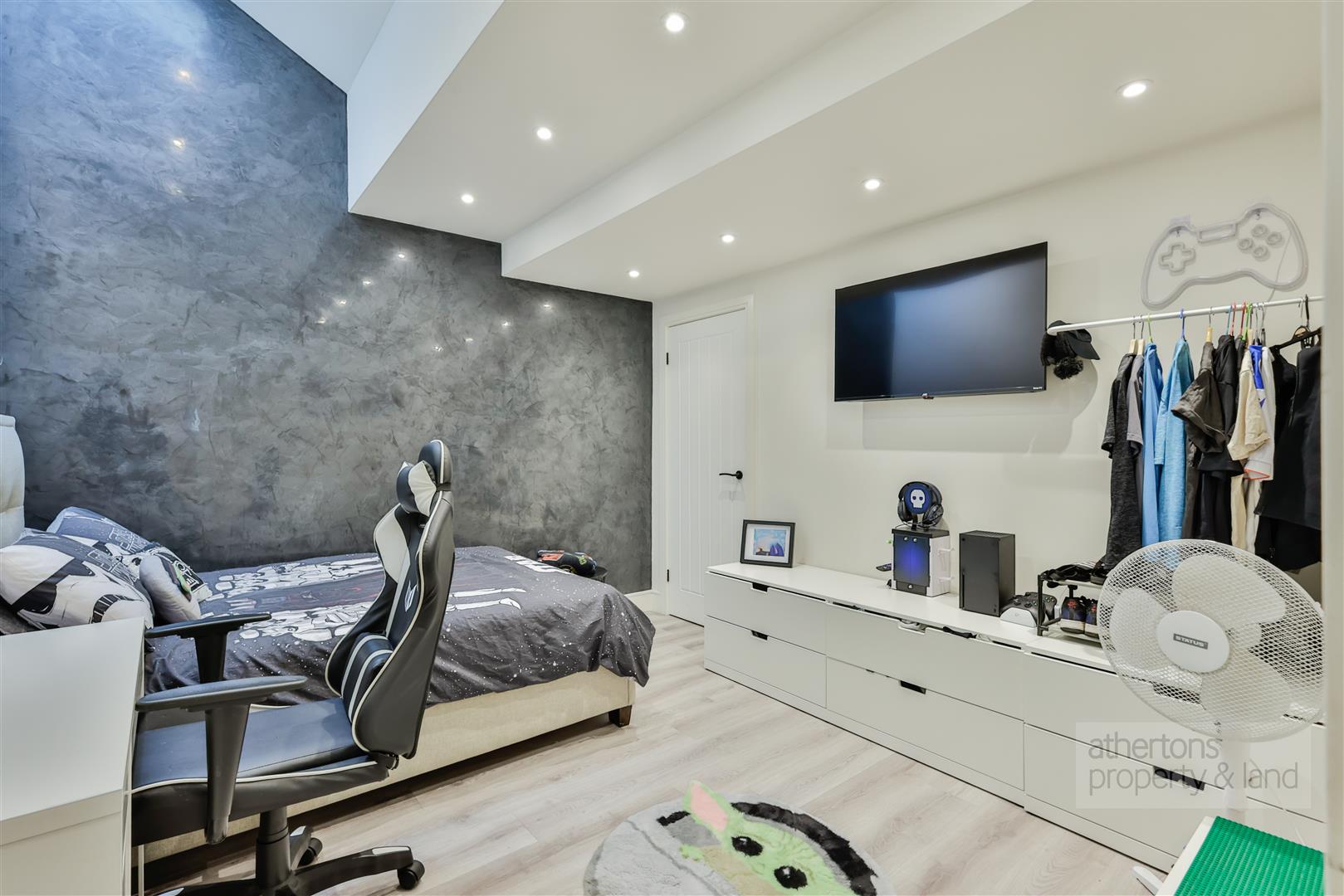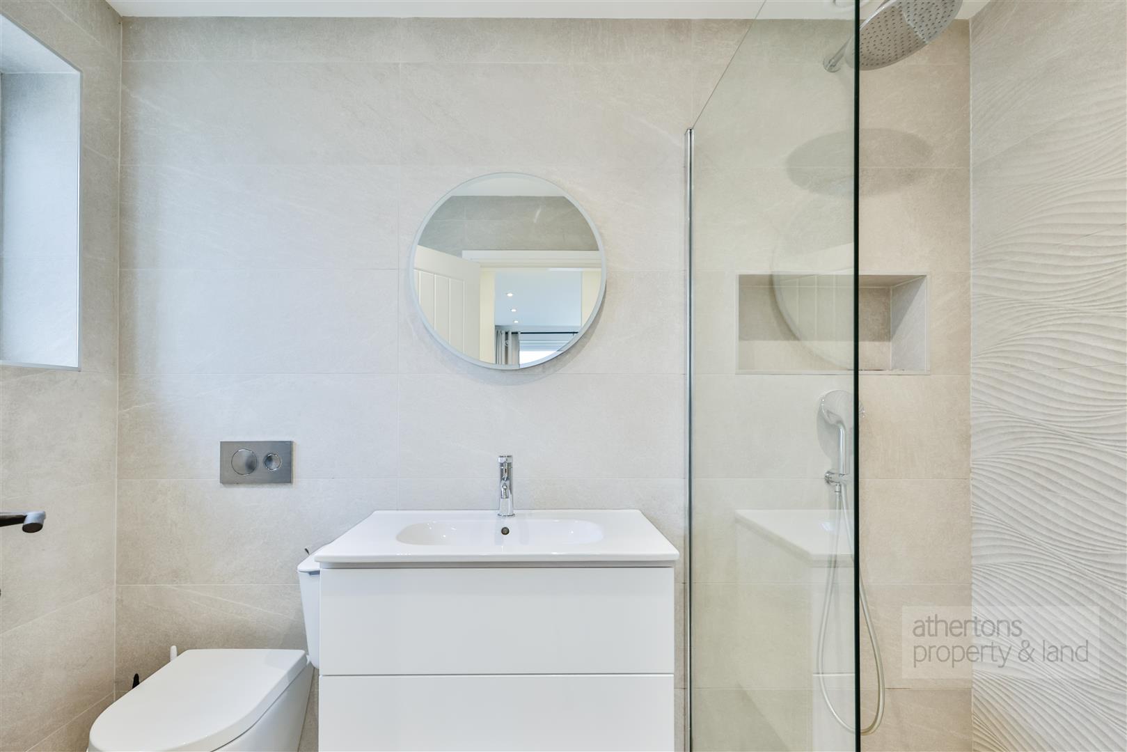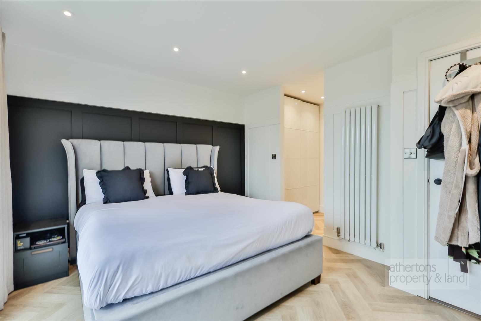The principal bedroom is a true highlight — an expansive retreat with Juliet balcony and French doors enjoying views towards Longridge Fell, a walk-through dressing area with fitted wardrobes, and a sleek en-suite shower room. Finished to the same exacting standard as the family bathroom, the en-suite includes a walk-in rainfall shower, vanity basin, tiled floor and walls, and a dual flush WC.