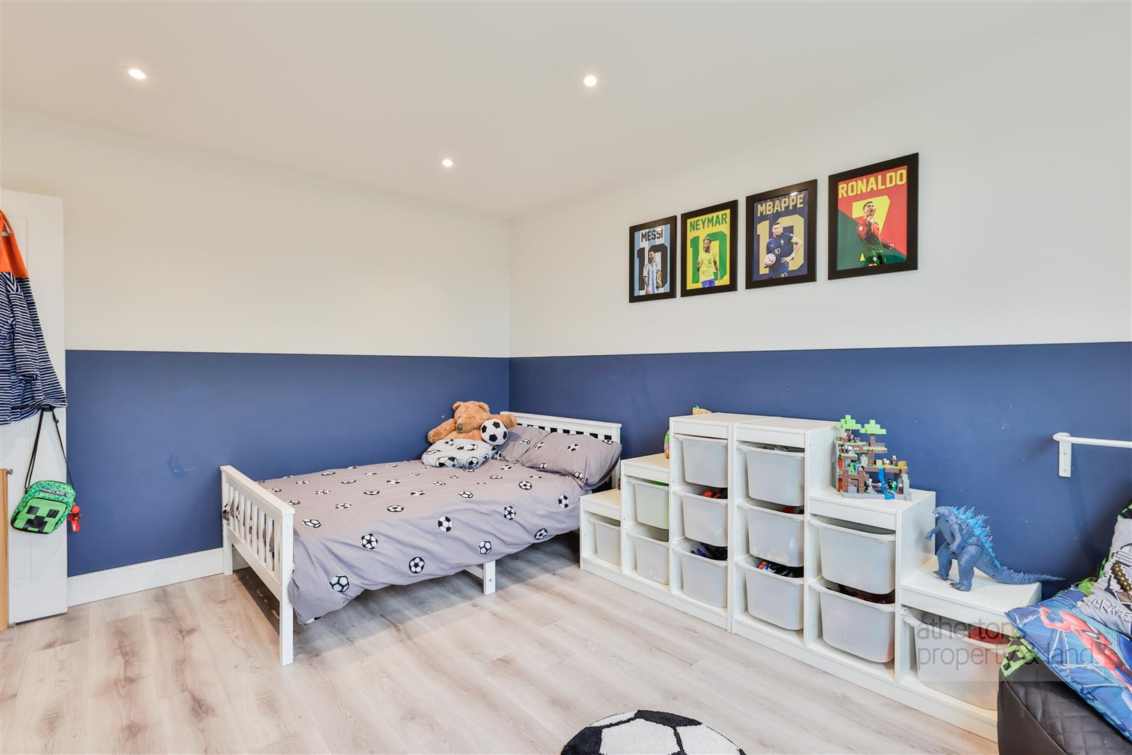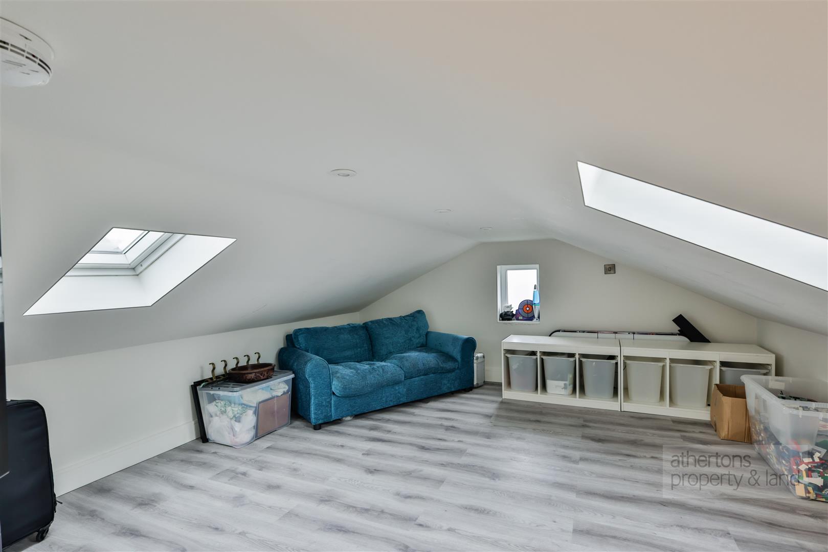 To the front of the home, a cosy lounge provides a relaxing retreat, complete with Karndean flooring and a picture window to the front. Bedroom four is a well-proportioned double, finished with stylish panelled walls, while bedroom three is another spacious double room. Bedroom two is particularly striking — an impressive double with vaulted ceilings, skylight, and access to a small inner hall with stairs leading to a converted attic space. With low ceilings, skylights, and a large eaves storage area, the attic is perfect as a playroom or den for younger children.