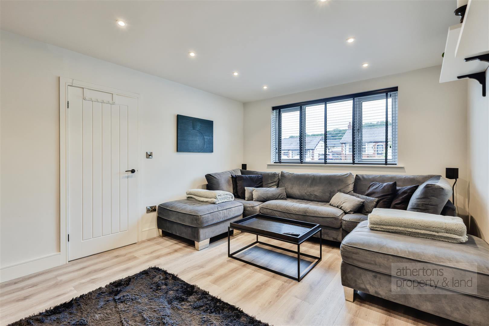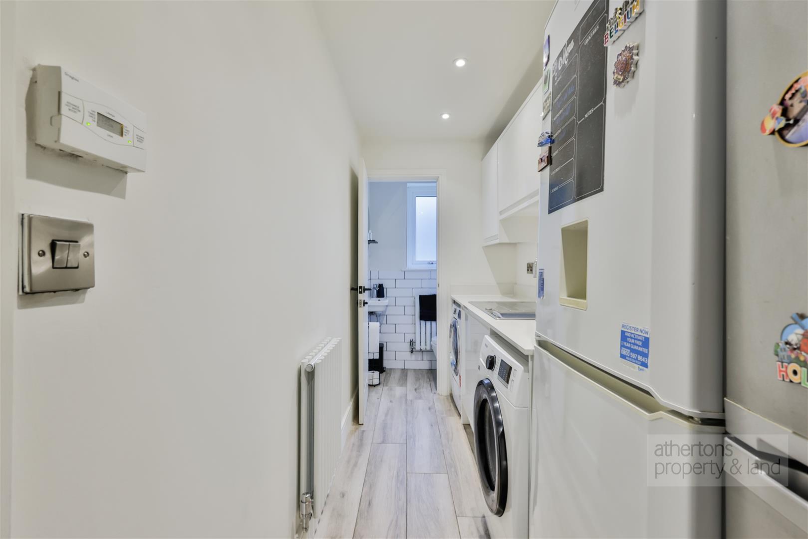 On the lower ground level, the home opens into a commanding open-plan kitchen, dining, and living space — perfectly designed for entertaining and modern family life. Bi-folding doors open onto the rear patio, flooding the room with light. The kitchen itself is fitted with a range of sleek base and eye-level units, Quartz worktops and upstands, a central island, pull out pantry cupboard and integrated appliances including an induction hob with extractor, double oven, dishwasher, and inset sink. There is ample space for a large dining table and some lounge furniture, making this an ideal social hub. A long utility room with matching base units, Quartz worktops, inset sink, space for fridge/freezer and plumbing for laundry appliances is located off the kitchen, along with a stylish ground-floor WC with half-tiled walls.
