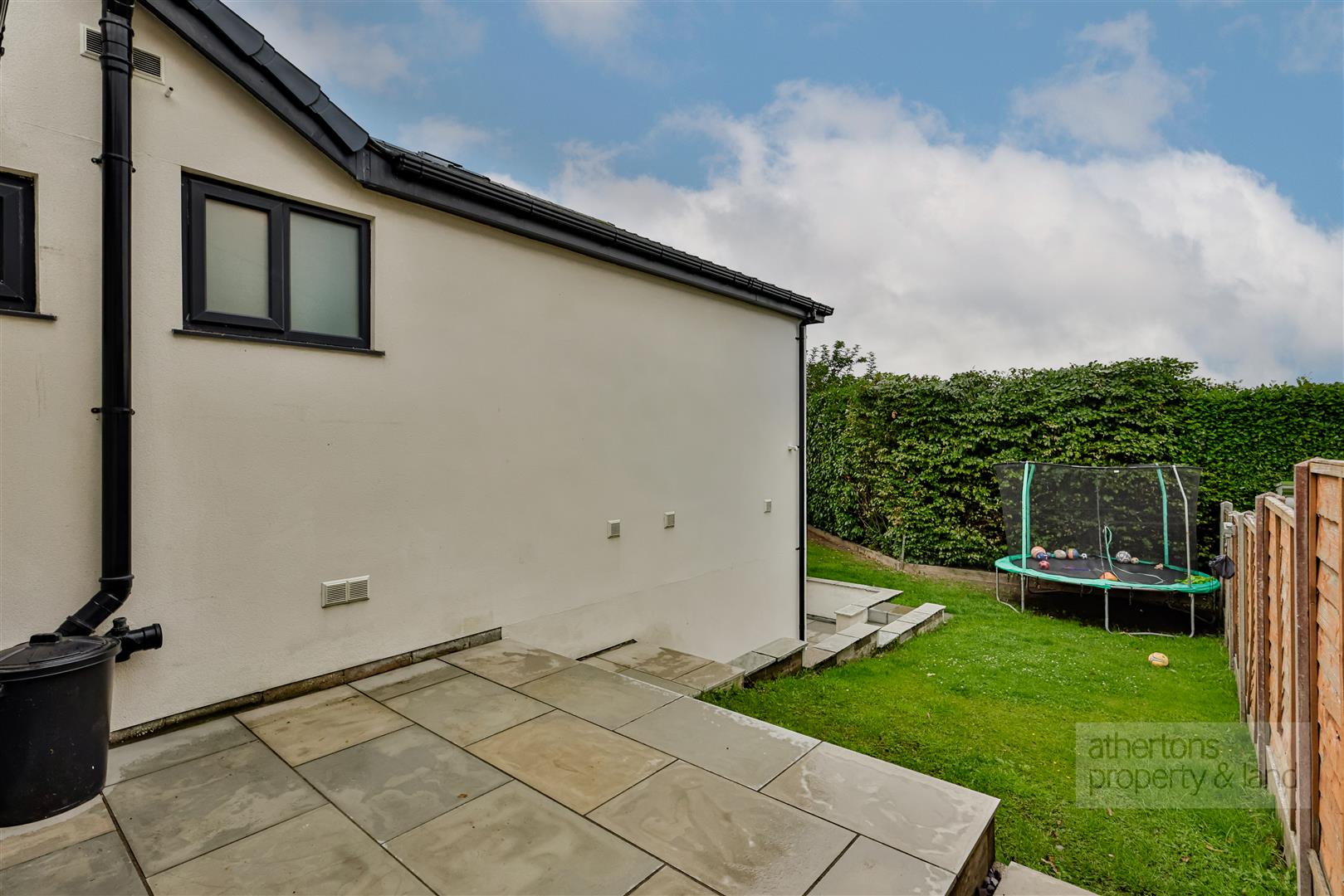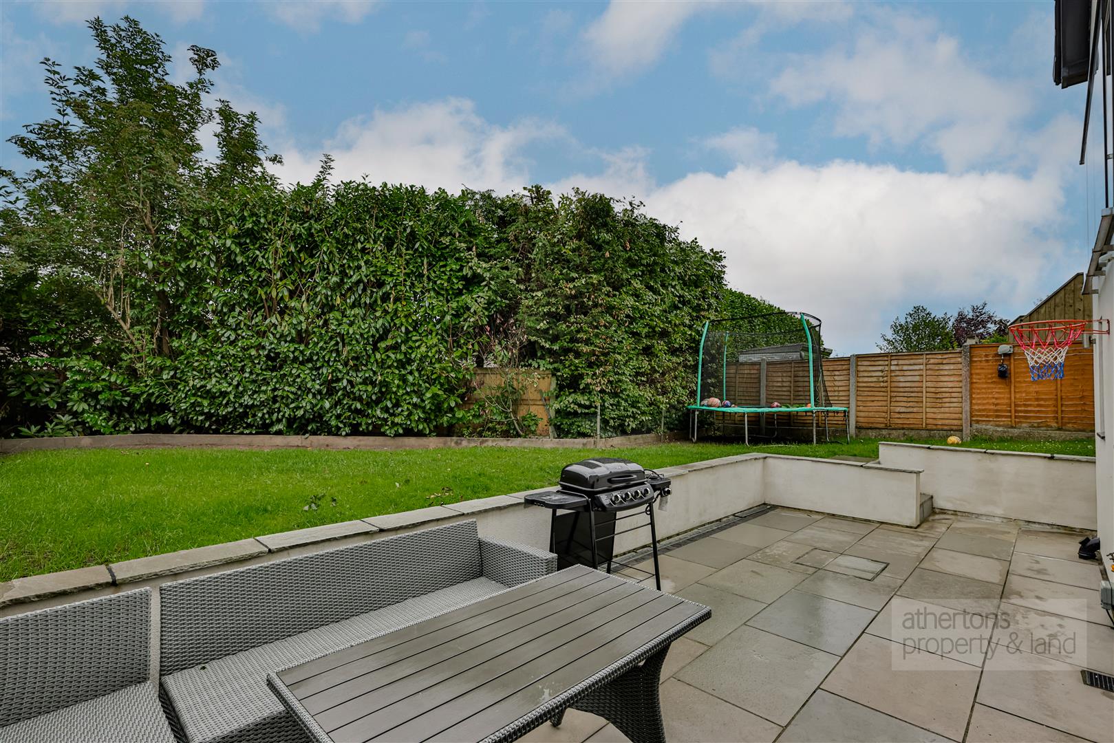 Externally, the property enjoys a landscaped garden designed for family living and entertaining. An initial paved patio with low wall surround leads to sweeping lawned gardens, offering ample space for children to play. Mature hedgerows and fencing provide privacy, while stone steps descend to a further patio area. To the front, a wide tarmacadam driveway offers parking for multiple vehicles and leads to the attached single garage with electric up-and-over door.