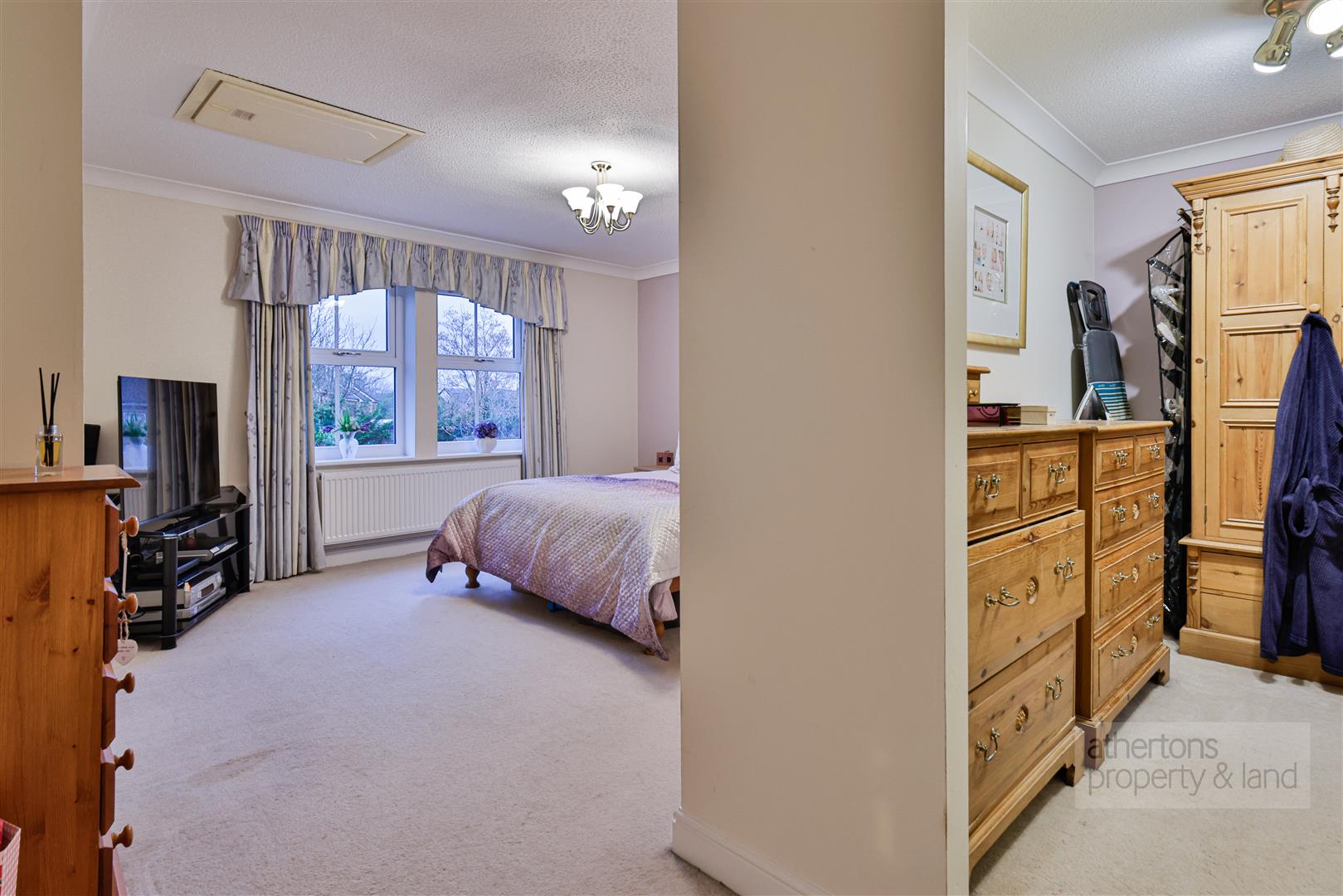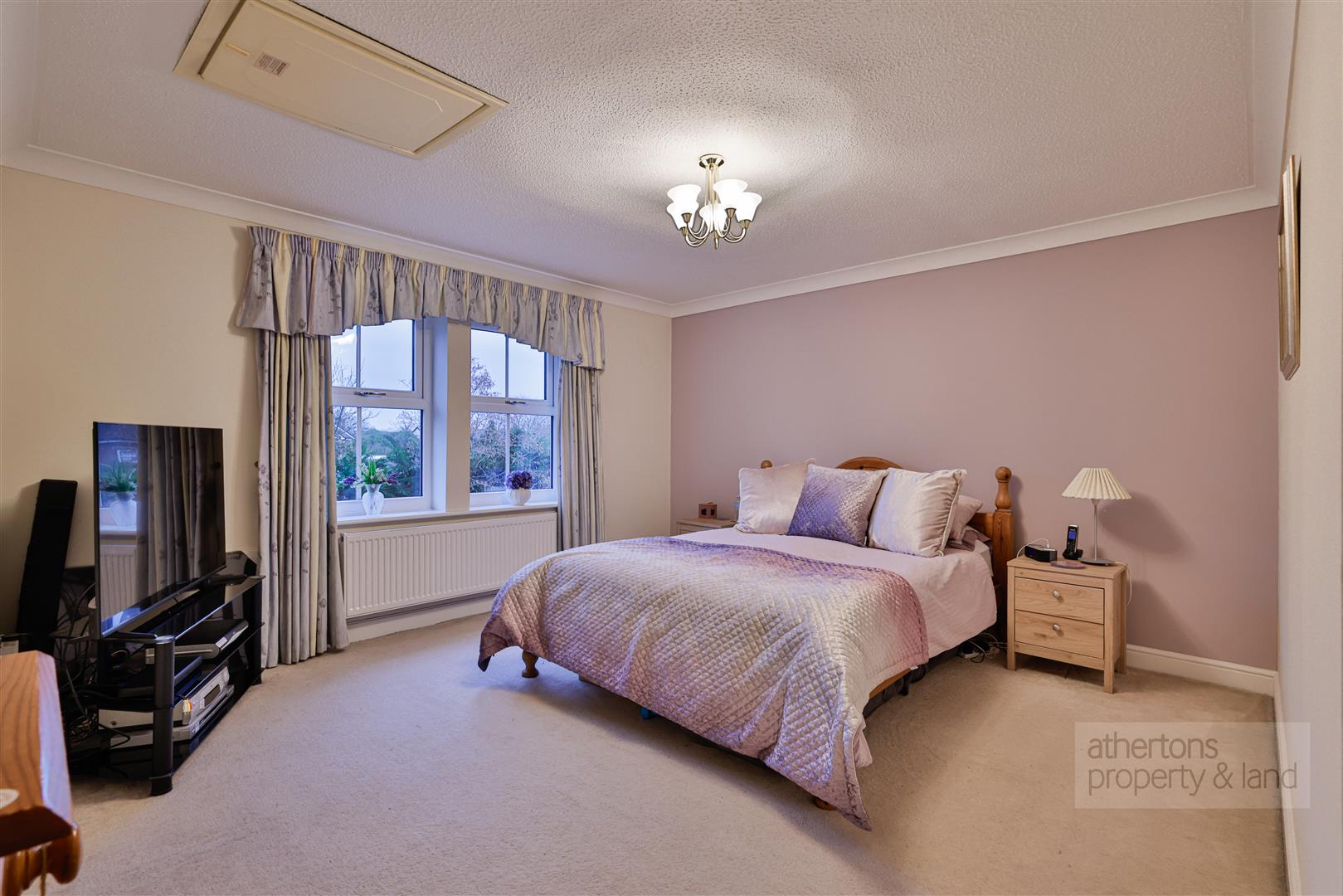 The property offers six well proportioned bedrooms, including an impressive principal master bedroom suite featuring a dedicated dressing room and a luxurious en-suite bathroom incorporating a round bath, separate shower enclosure, WC, and his and hers wash basins with storage.