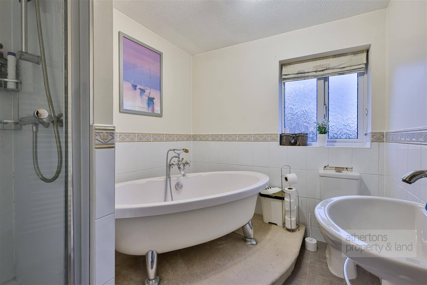 A second bedroom on the second floor also benefits from its own en-suite shower room fitted with a three piece white suite. The remaining bedrooms are served by a stylish house bathroom, which includes a raised freestanding bath, separate shower enclosure, wash hand basin, and WC.