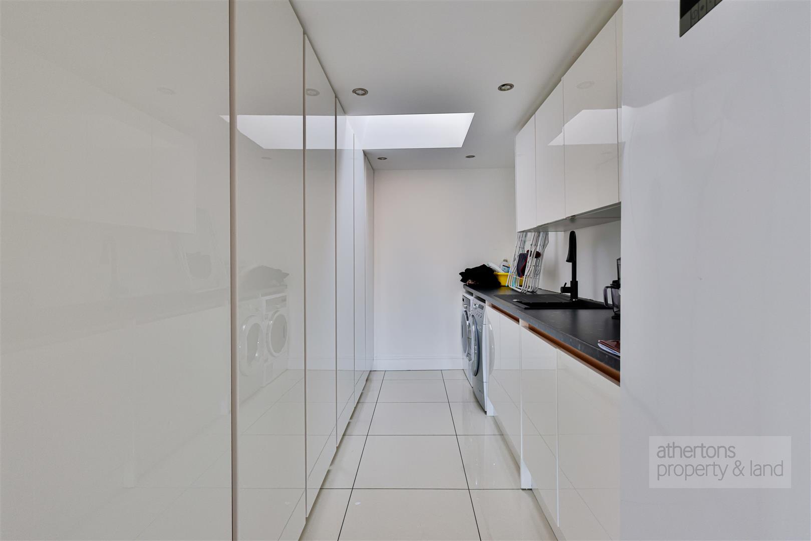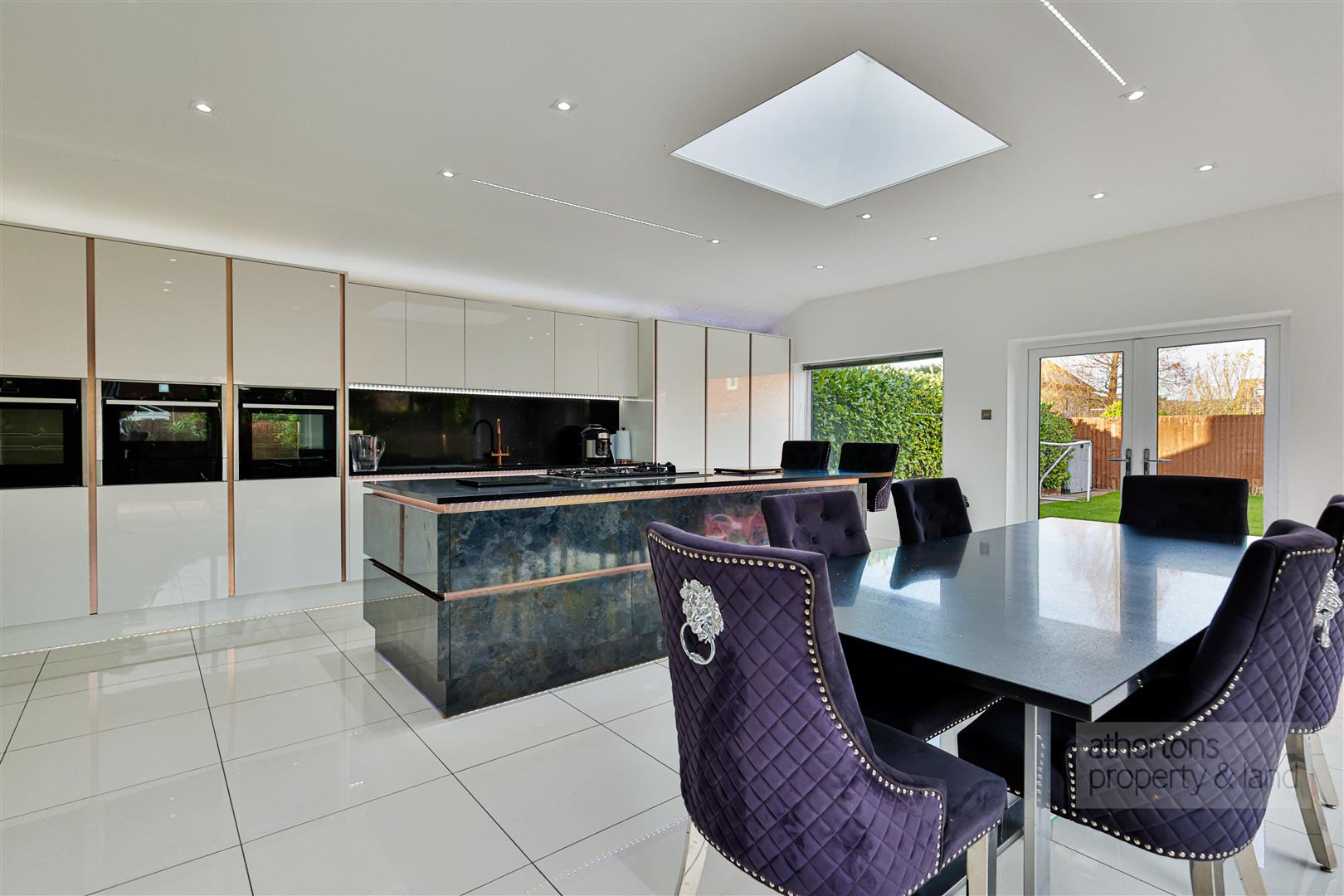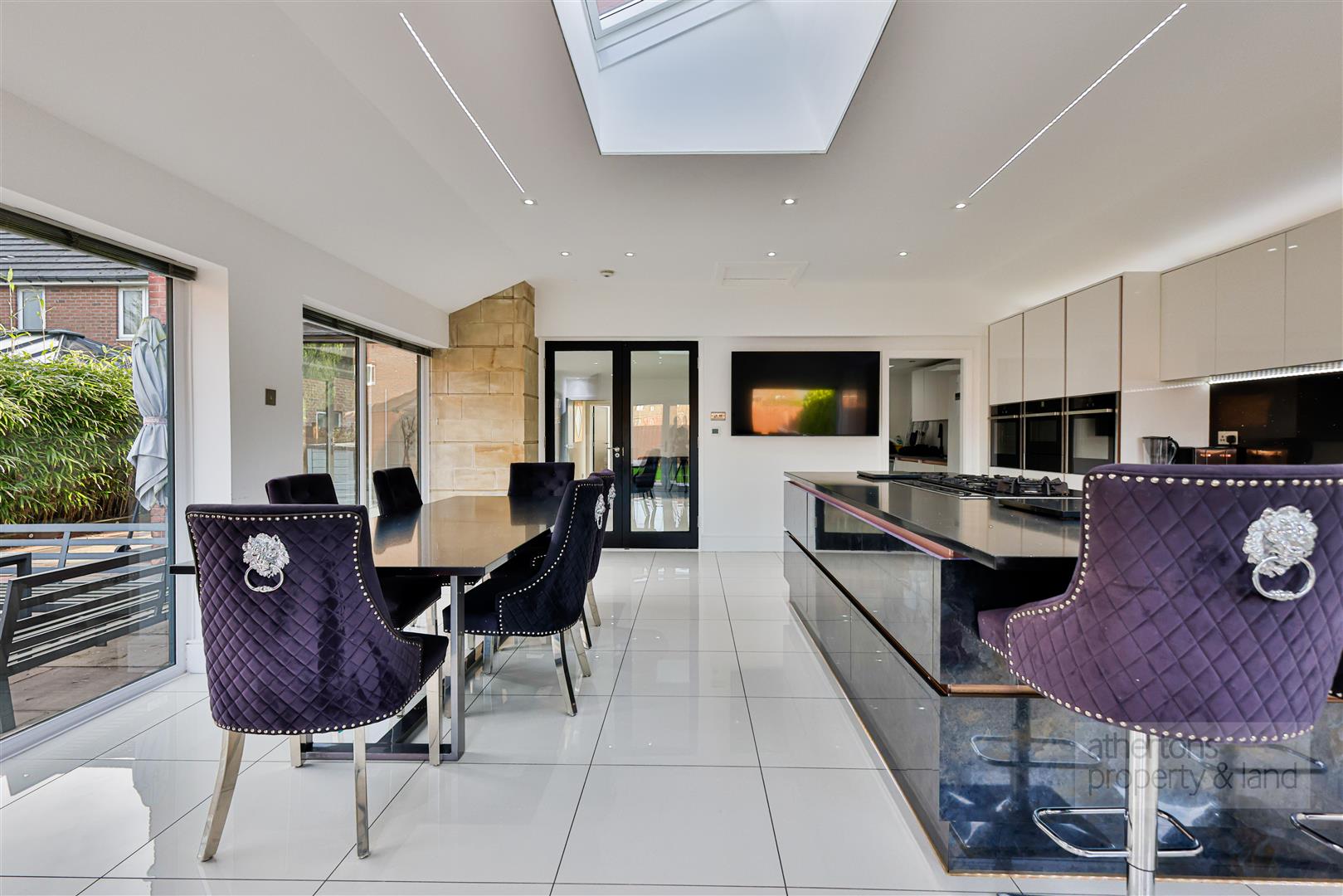 A further lounge sits to the rear, enriched by full-length picture windows, media wall, twin electric fires, and direct access to the rear patio, making it an ideal everyday family room. The triple-aspect kitchen and dining area provides an exceptional open-plan environment for cooking, dining, and entertaining. Appointed with black granite worktops, sleek base and wall units, and a comprehensive suite of Neff appliances including triple ovens, a plate warmer, a five-ring gas hob, and a rising extractor, the kitchen also features integrated full-height fridge and freezer, an instant hot water tap, and a central breakfast bar. A skylight floods the space with natural light while an electric log-burning-effect fire enhances the room’s ambience. Open access leads into a well-equipped utility room with matching cabinetry, plumbing for laundry appliances, a sink, and pantry storage.