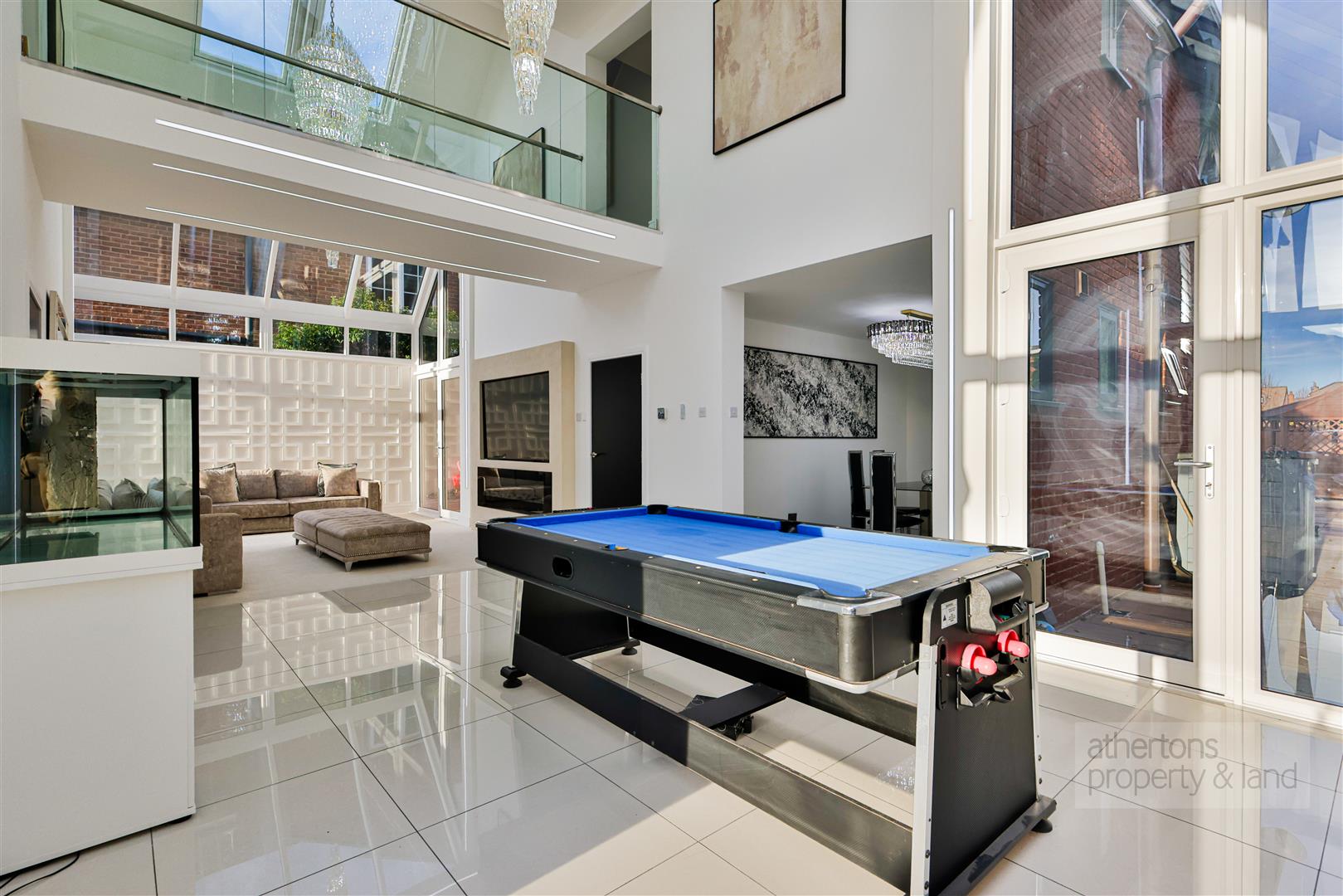 Internally, the property opens into an elegant L-shaped entrance hall finished with tiled flooring and providing access to a stylish two-piece WC, fitted storage, the garage, and a dedicated boot room with bench seating and cabinetry. Moving through the ground floor, the layout unfolds into a series of expansive living areas designed around light, height, and openness. The vaulted lounge is a breathtaking centrepiece featuring full-height glazing, skylights, a Venetian plaster media wall, an electric living-flame fire, bespoke wood panelling, and two spectacular chandeliers suspended adjacent to a dramatic internal walkway that divides the upper levels. This unforgettable space flows seamlessly into the dining area, the playroom, and the inner hall, reinforcing the home’s sense of scale and connectivity.