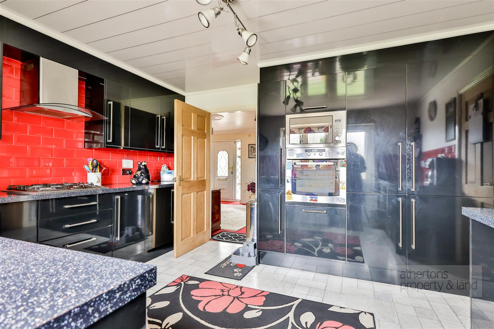 The kitchen is well-appointed with a comprehensive range of wall and base units, complementary worktops, and integrated appliances including an oven, combi microwave, gas hob, extractor, and fridge-freezer. There is also plumbing for a washing machine and side access onto the large patio area.