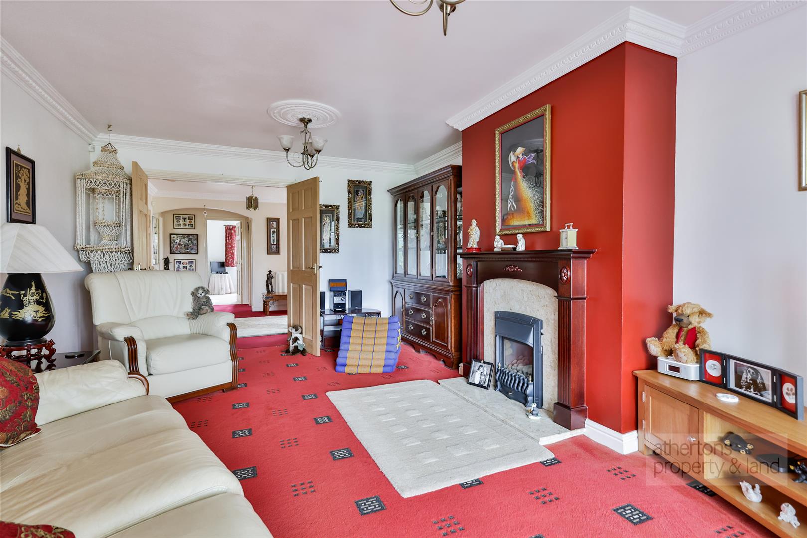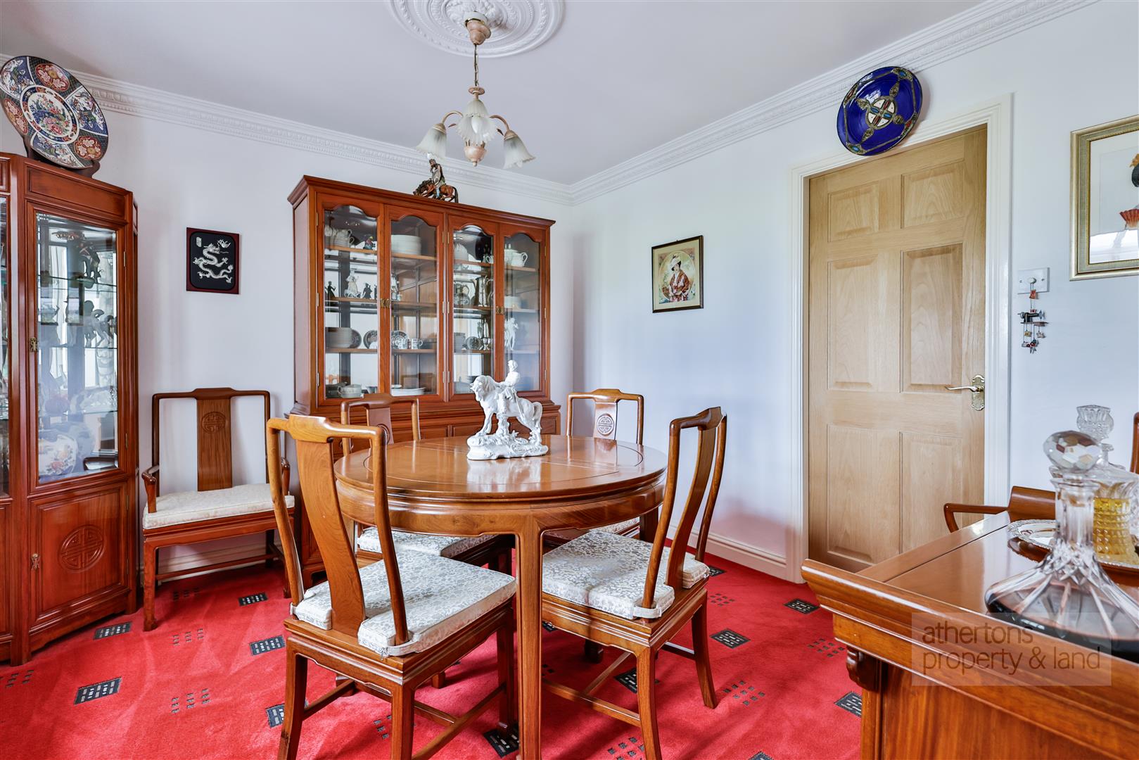 Internally, you are welcomed by a generously sized central entrance hall with a large storage/cloaks cupboard. French doors lead into a bright and spacious dining lounge featuring a central fireplace with inset gas fire, marble hearth, timber surround, ceiling coving, and further French doors opening into a glazed conservatory—perfect for enjoying the stunning outlook from Whalley Nab to Pendle Hill. Adjoining the lounge is a well-proportioned dining room with access to the kitchen.