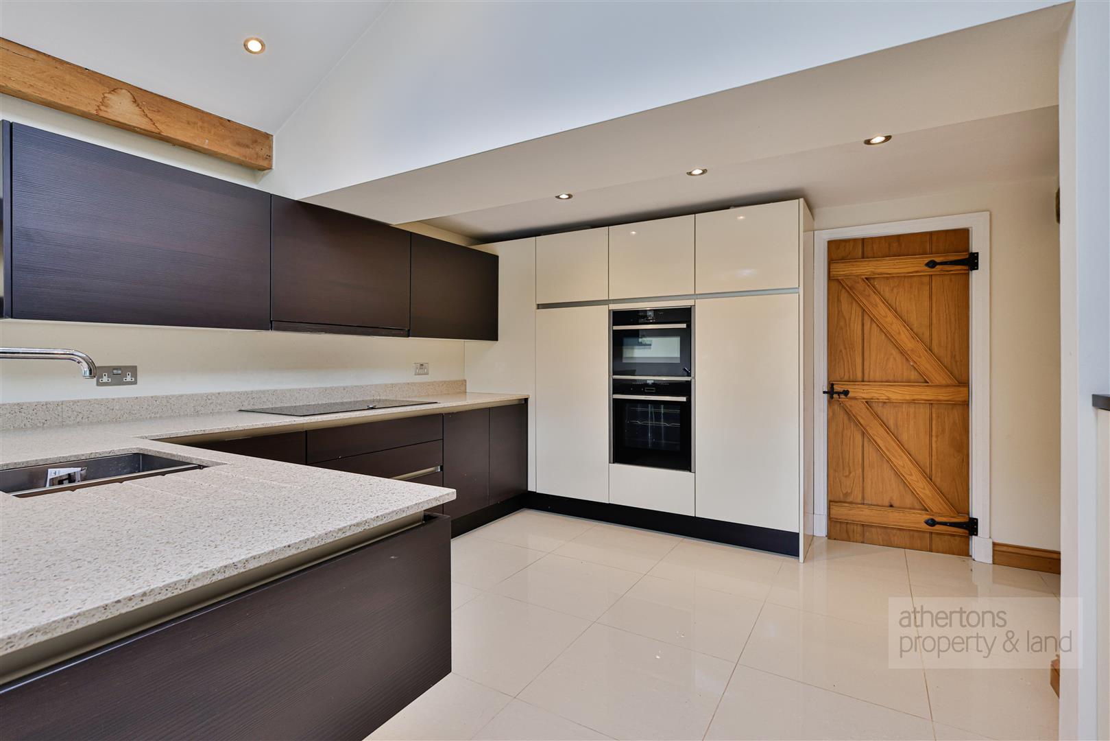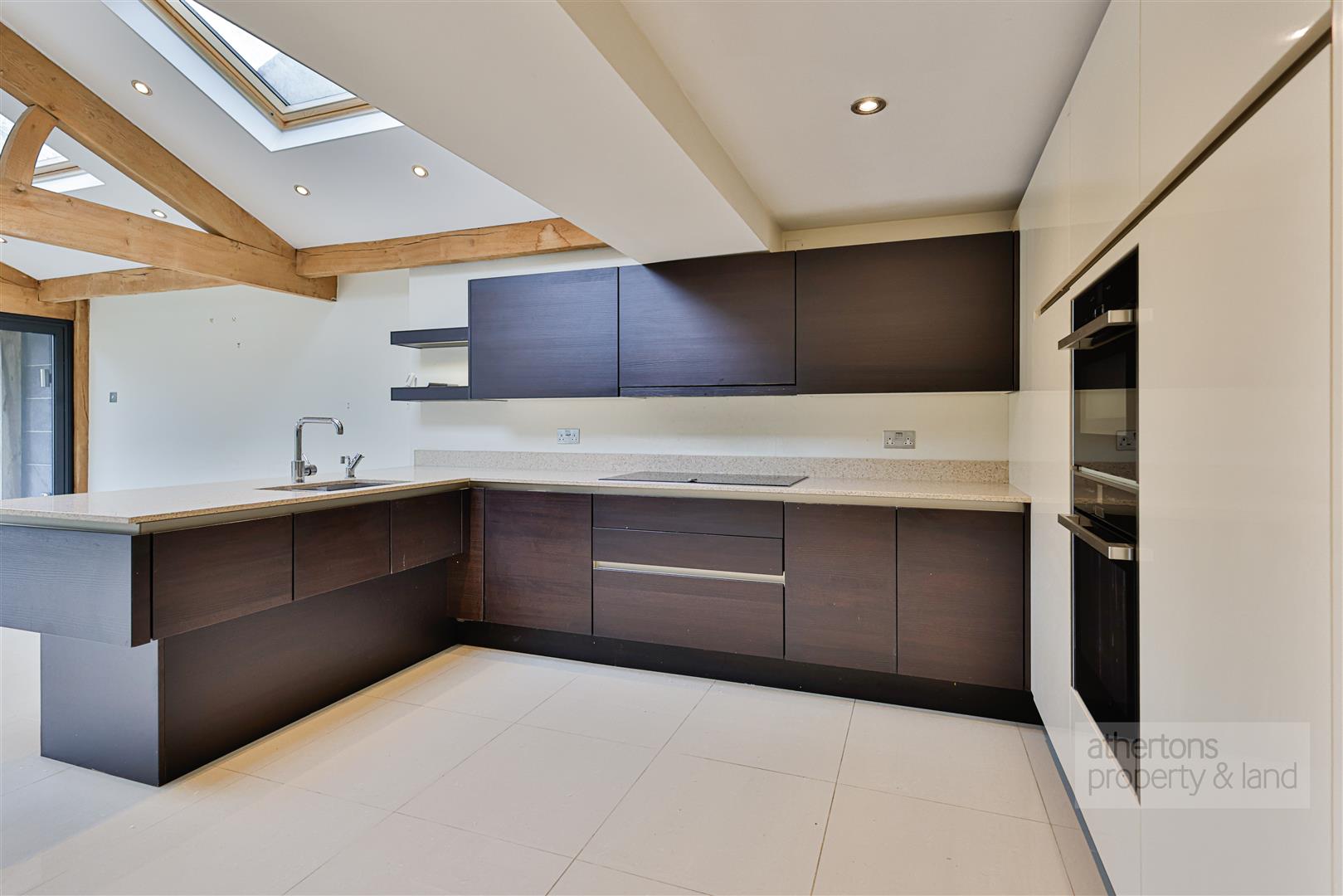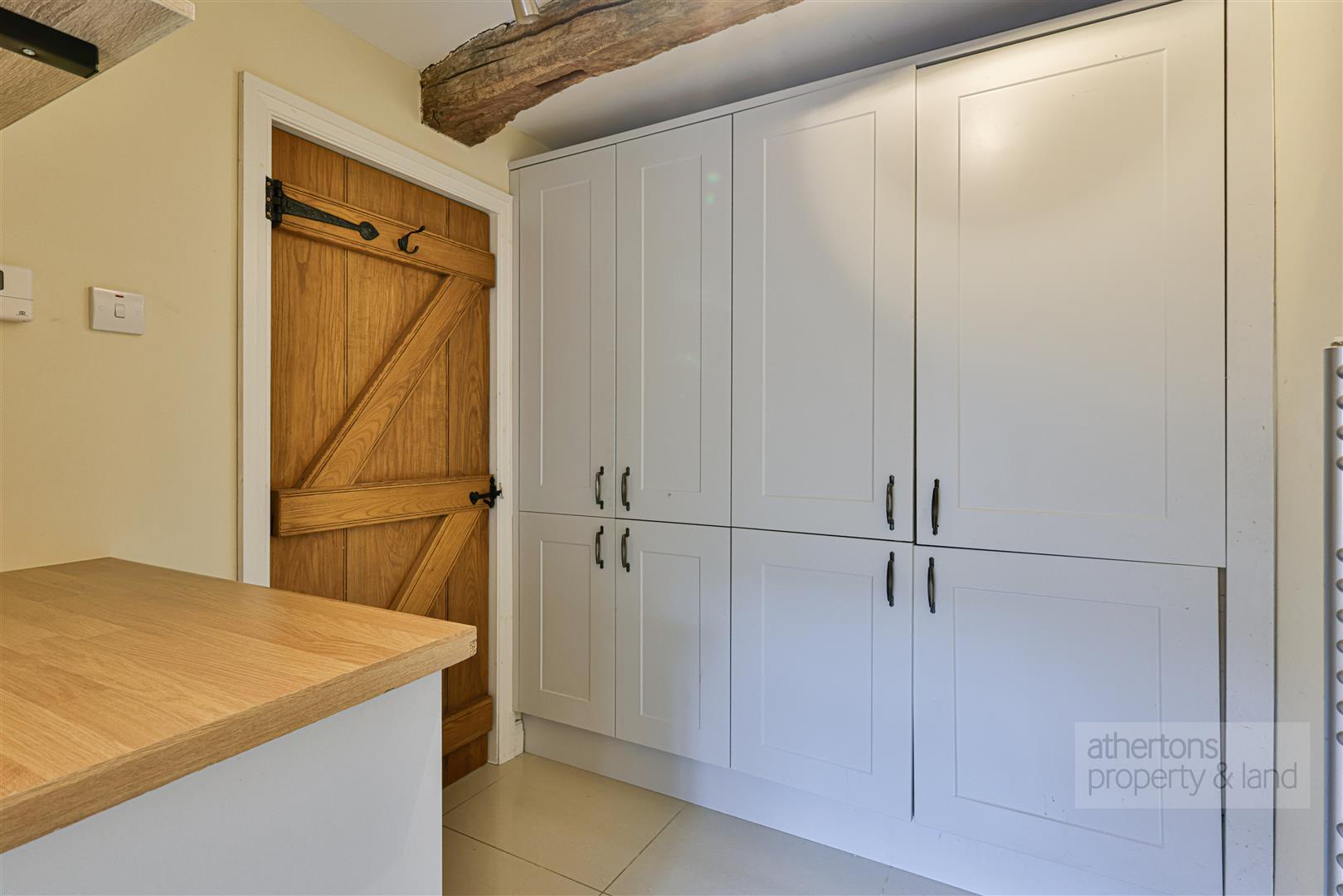 The standout feature of the cottage is the striking open-plan kitchen and living space, designed and extended with exposed trusses to create a seamless environment for both relaxed family living and entertaining. This light-filled room showcases exposed ceiling timbers and contemporary cabinetry, complemented by integrated appliances including a fridge, dishwasher, double oven, hob, and sink unit. Bi-folding doors extend the living space outward, opening directly onto the sheltered patio veranda and framing picturesque views across open fields, reinforcing the home’s strong connection to its rural surroundings.