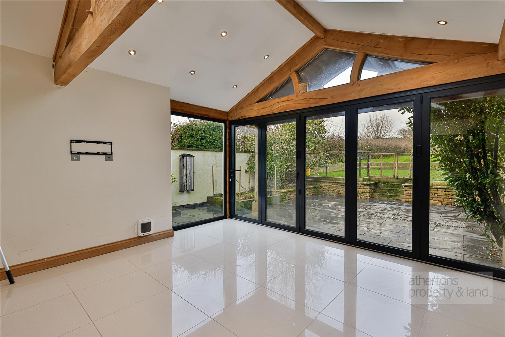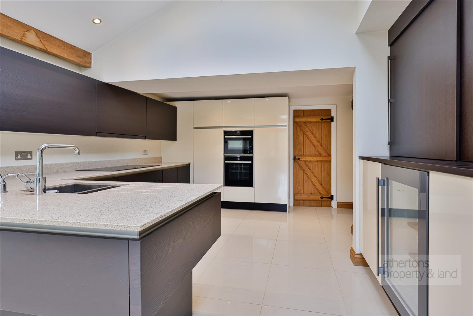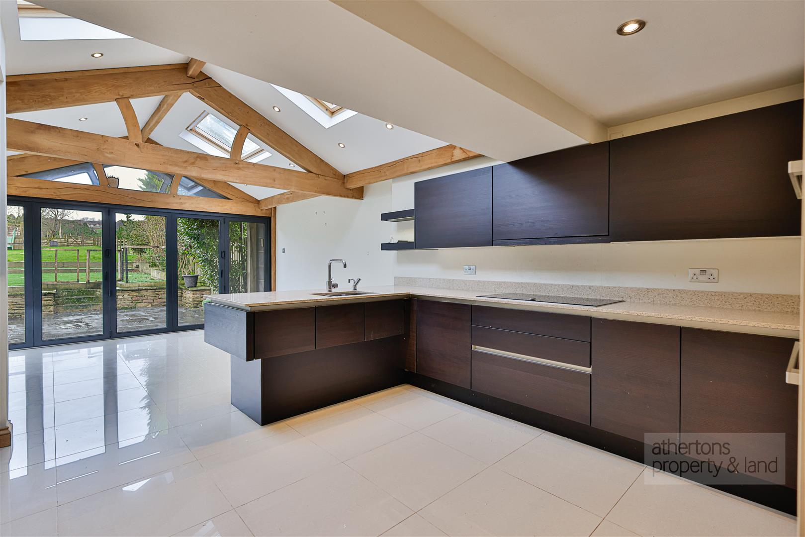 The standout feature of the cottage is the striking open-plan kitchen and living space, designed and extended with exposed trusses to create a seamless environment for both relaxed family living and entertaining. This light-filled room showcases exposed ceiling timbers and contemporary cabinetry, complemented by integrated appliances including a fridge, dishwasher, double oven, hob, and sink unit. Bi-folding doors extend the living space outward, opening directly onto the sheltered patio veranda and framing picturesque views across open fields, reinforcing the home’s strong connection to its rural surroundings.