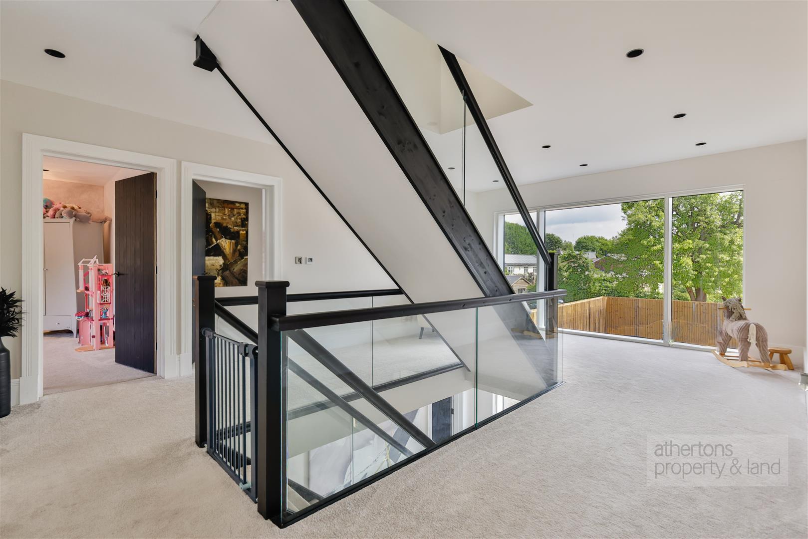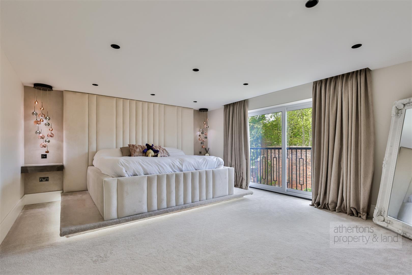 Upstairs, a generous landing connects three elegantly presented double bedrooms, each with beautifully tiled en-suite bathrooms of a showroom standard. The principal suite is particularly noteworthy, offering a private powder room, a walk-in wardrobe with full-height storage and central island, a Juliet balcony with views over the rear garden and surrounding countryside, and an exceptional en-suite with dual basins, concealed vanity storage, a walk-in rainfall shower, and a freestanding oval bath. The second floor reveals a bright and spacious landing with a separate laundry room, complete with base and wall units and plumbing for a washing machine and dryer. There is additional eaves storage and access to two further double bedrooms. Bedroom four offers generous proportions, ample eaves storage, and an en-suite shower room. Bedroom five is a substantial suite with a beautifully appointed four-piece en-suite, including a raised freestanding bath, corner shower, vanity basin, and dual-flush WC. This floor also includes a dressing area with extensive storage and a separate boiler/plant room.