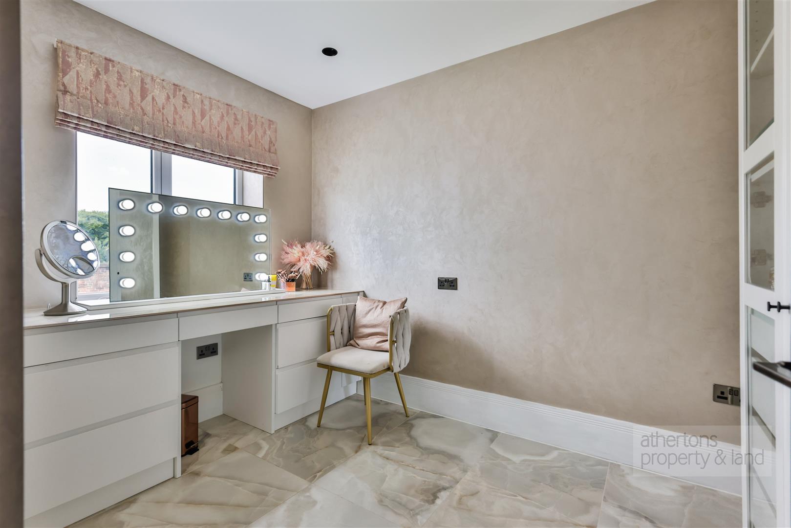 This impressive space flows seamlessly across large porcelain tiles into a spacious lounge area with a central Venetian plaster media wall, glazed sliding doors opening onto the rear patio, and an open-plan dining area bathed in natural light from both the rear and the entrance hall. The family living room mirrors this level of finish, also featuring a Venetian plaster media wall and glazed access to the patio. Adjacent lies a well-equipped office, equally suitable as a home cinema.