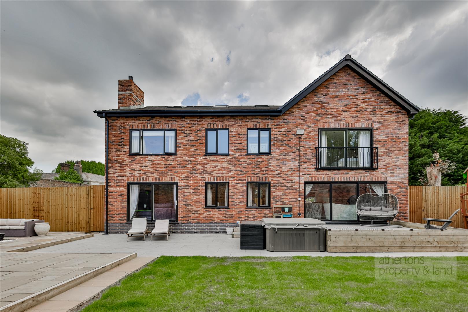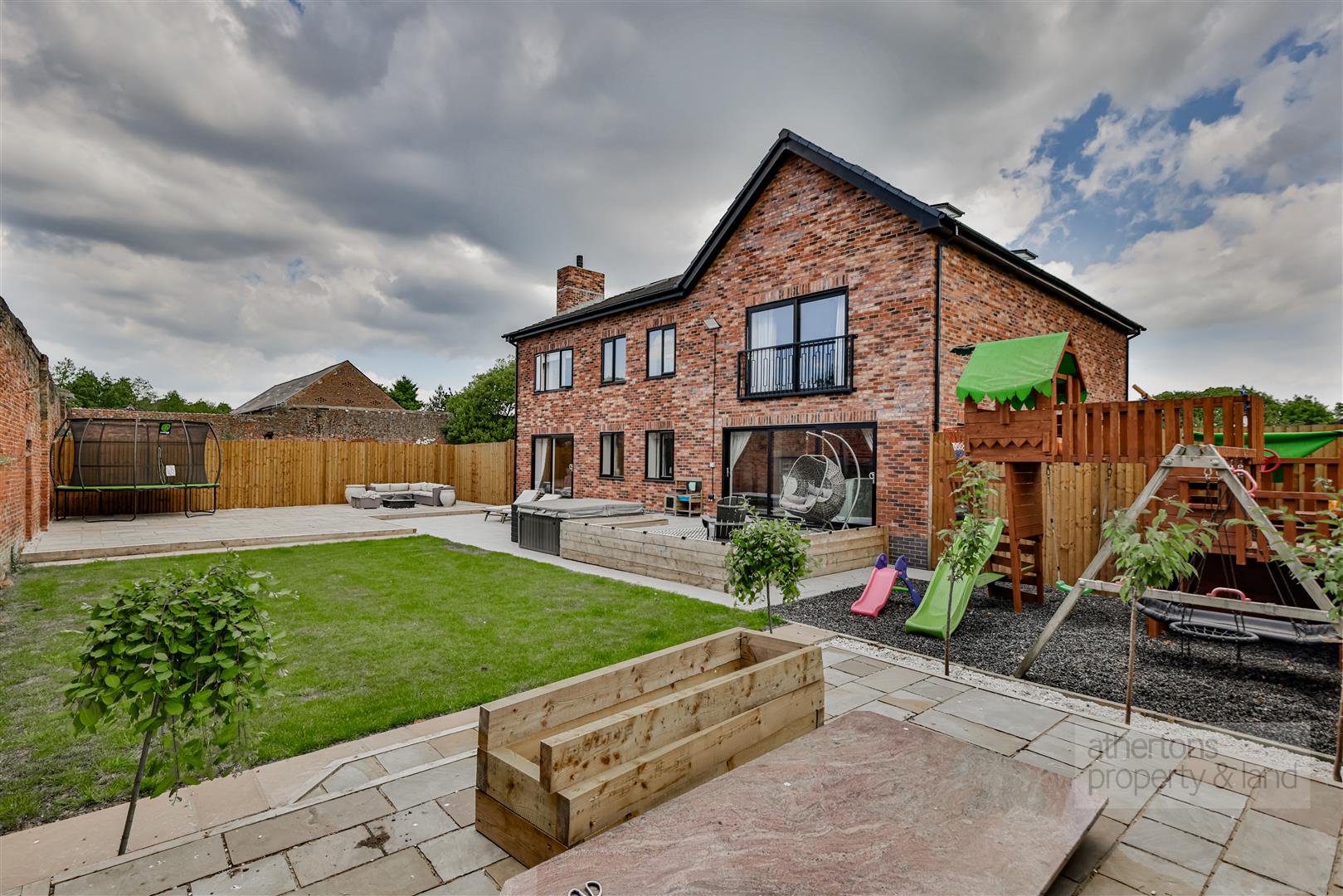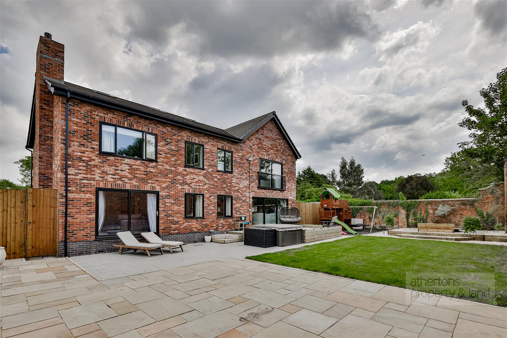 Externally, the property is approached via a private road and entered through grand electric wrought iron gates, which are inscribed with the property name. A substantial tarmacadam driveway provides ample parking, including an EV charging point, and leads to secure gated side gardens. One side features an artificial lawn ideal for sports and recreation, while the other provides a tiled, enclosed space with kennels and composite shed storage—perfect for pet owners. The rear garden is particularly striking, offering total privacy and a picturesque outlook framed by the original walled garden. This idyllic space includes a feature Indian Teak inset door, extensive patio areas, a barked children's play zone, and a central lawn, all set within tranquil, mature surroundings.