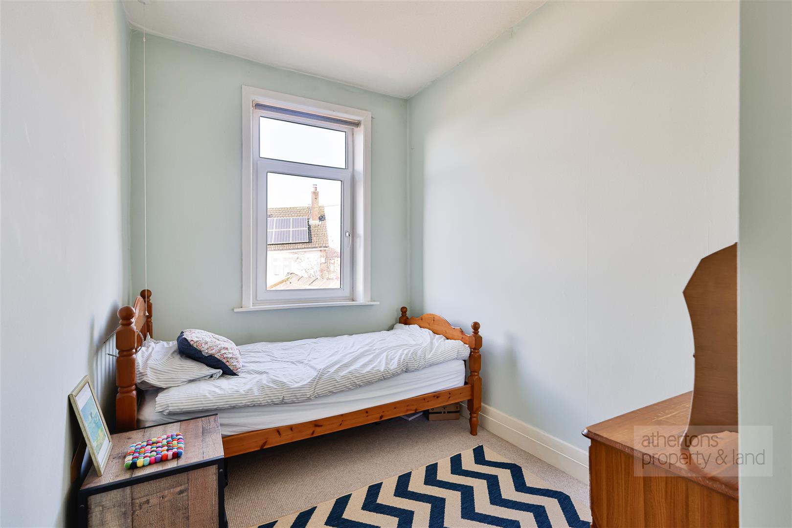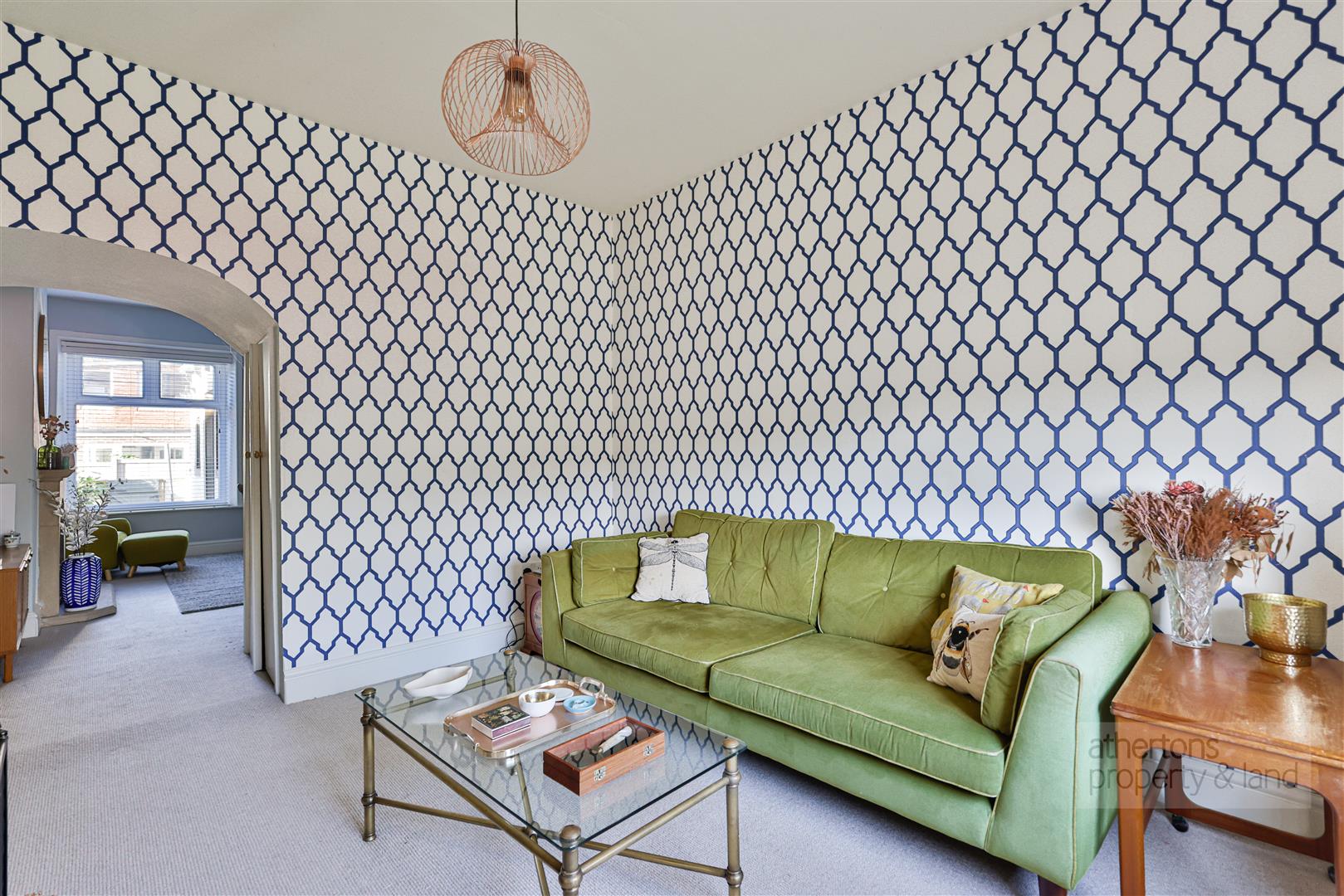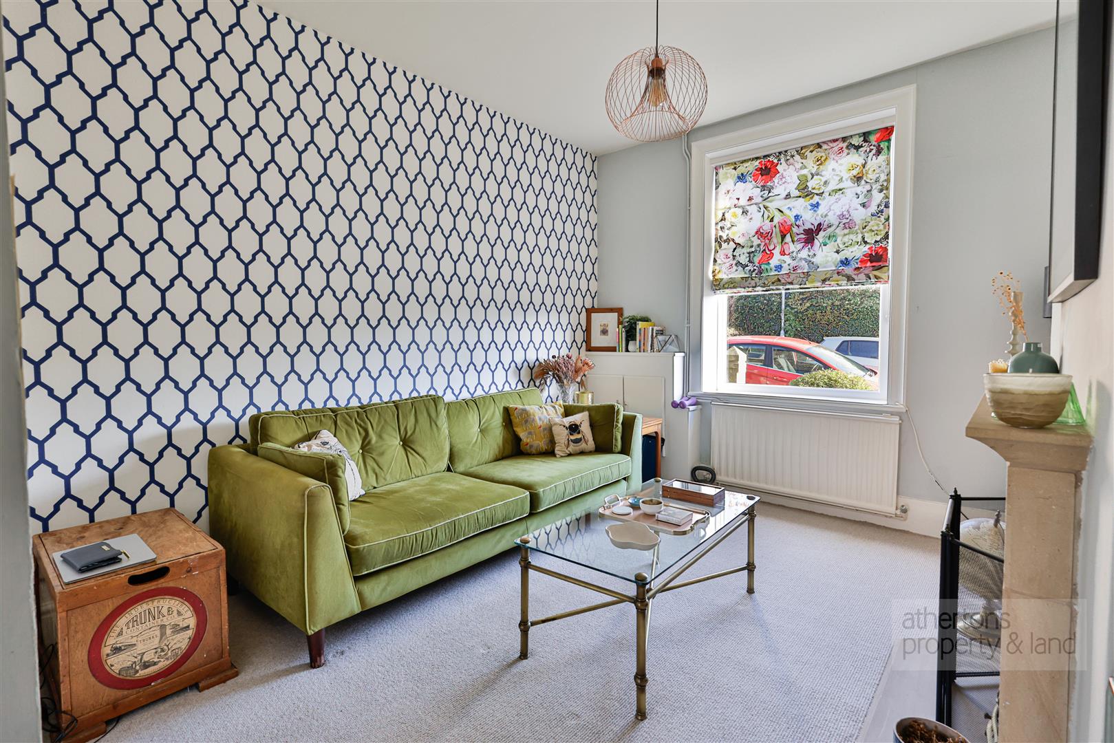 To the first floor, the landing leads to three well-proportioned bedrooms, each tastefully decorated and filled with natural light. Bedroom one is located to the front and is a generous double room, while bedrooms two and three are situated to the rear, with bedroom two benefiting from fitted wardrobe solutions. The bathroom is fully tiled and fitted with a panelled bath with electric shower over, pedestal wash basin and WC.