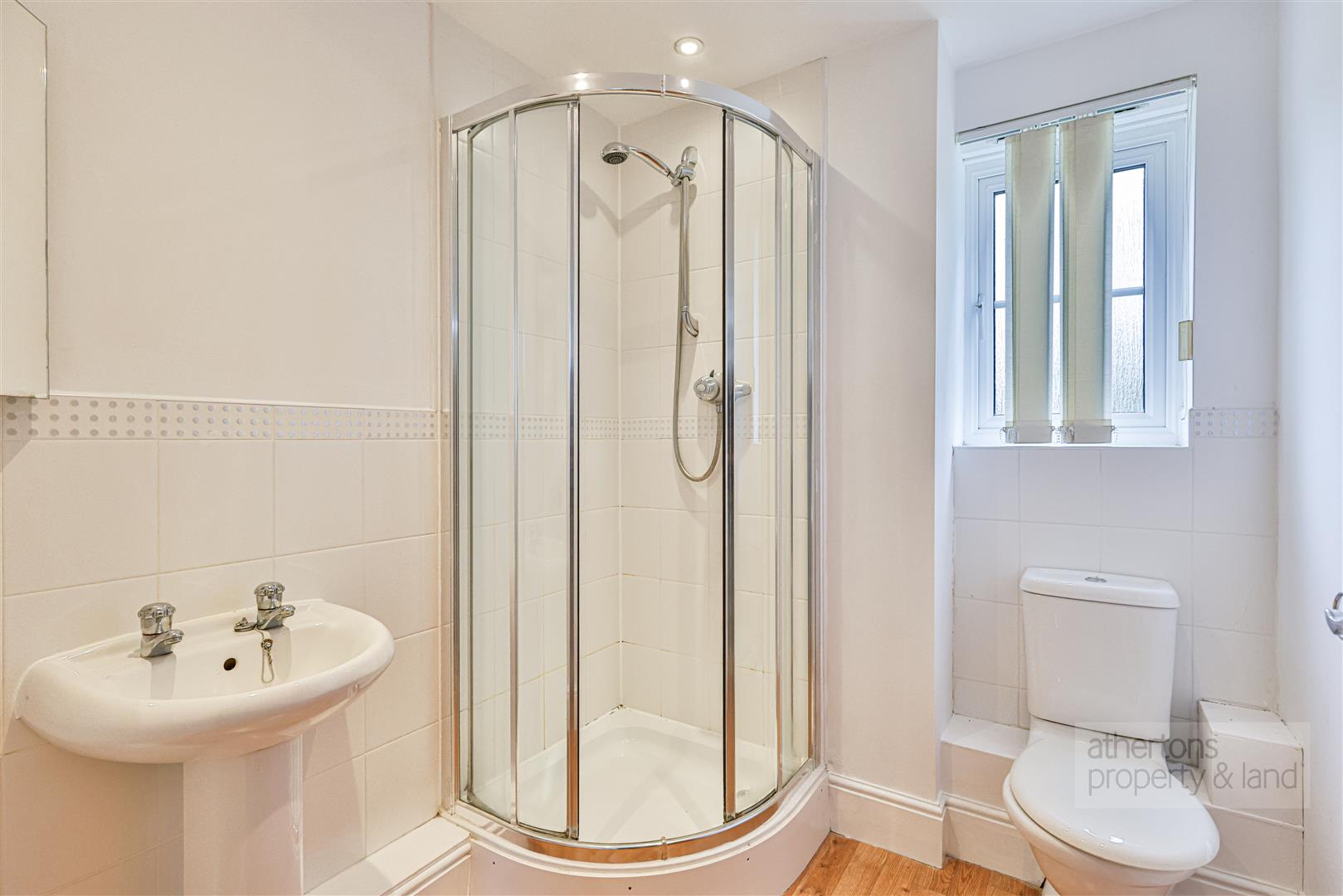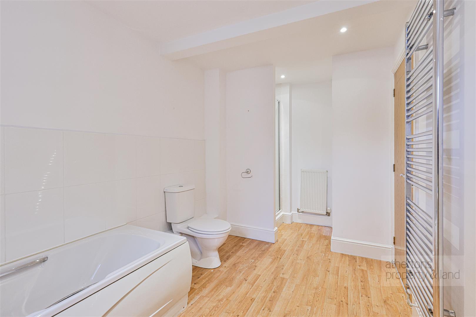 The apartment boasts two well-proportioned double bedrooms, each enjoying an abundance of natural light. The master bedroom features twin double-glazed windows framed by stone mullions, bedside wall lights and a radiator. It is further enhanced by a stylish en suite shower room, comprising a corner cubicle with mixer shower, pedestal basin and low-level WC. The space is complemented by a ladder-style towel radiator, mirror-fronted cabinet, recessed lighting, wood-effect vinyl flooring and a frosted double-glazed window with extractor fan.