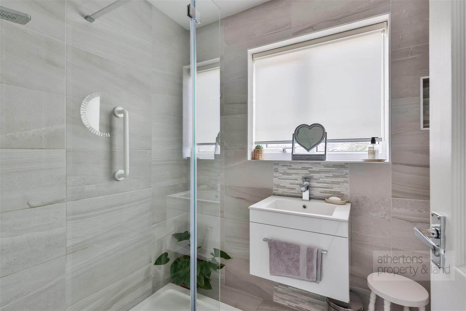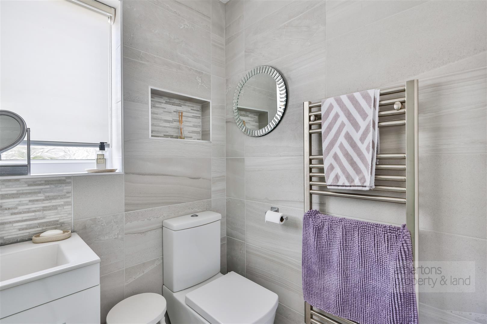 The recently completed family bathroom has been finished to an exquisite standard, with contemporary tiling to the floor and walls, a walk-in shower with sleek glass screen, dual-flush WC, a vanity wash basin, and a built-in storage cupboard.