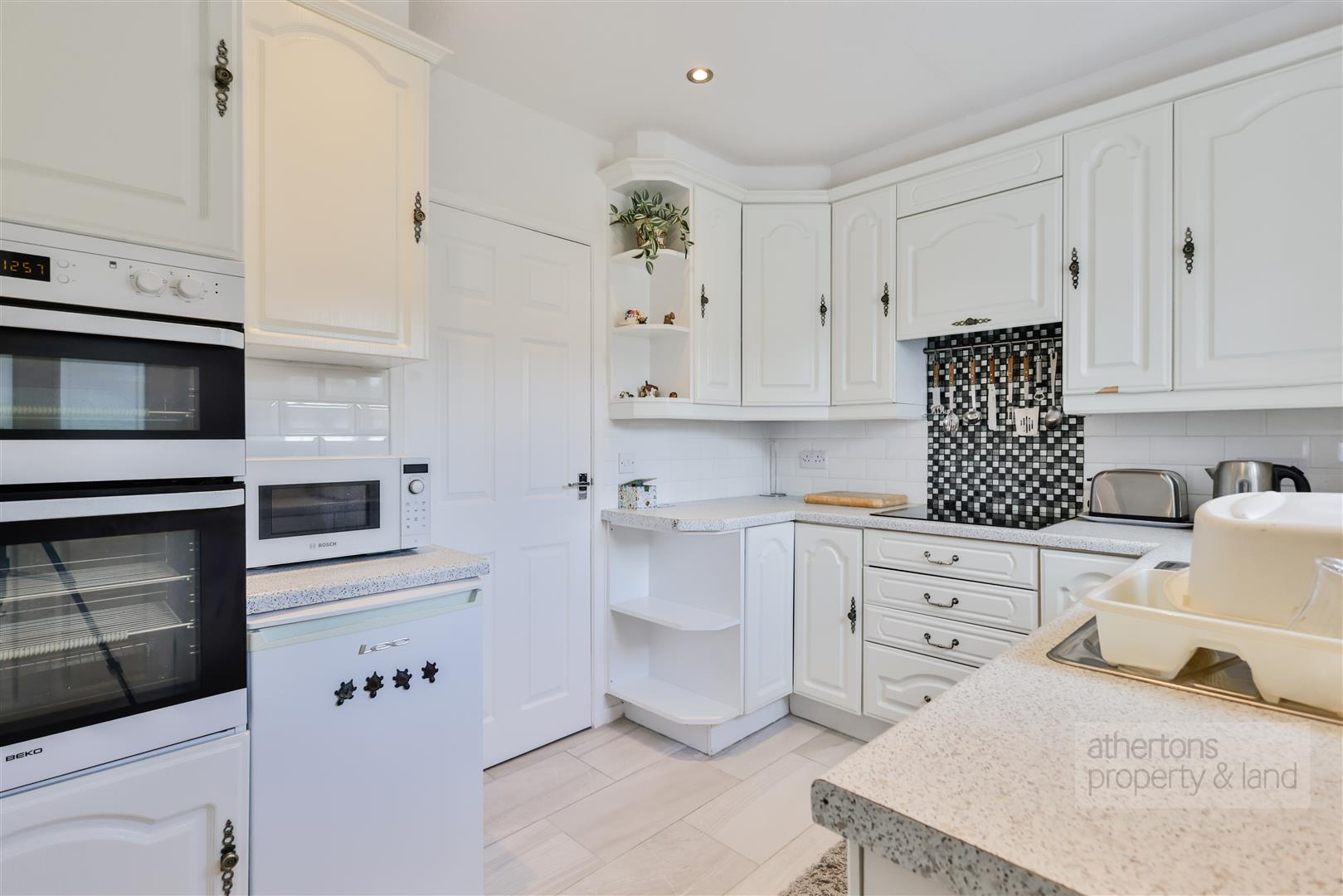 The kitchen is both practical and stylish, fitted with a range of cream base and eye-level units with tiled flooring, a four-ring induction hob with extractor over, electric oven and grill, and an under-counter half fridge. A stainless steel dual-bowl sink sits beneath a window with side garden views. From the kitchen, an inner hallway provides external access to both the front and rear of the property and internal access into the garage, which is equipped with a remote-controlled electric up-and-over door, power, and lighting.