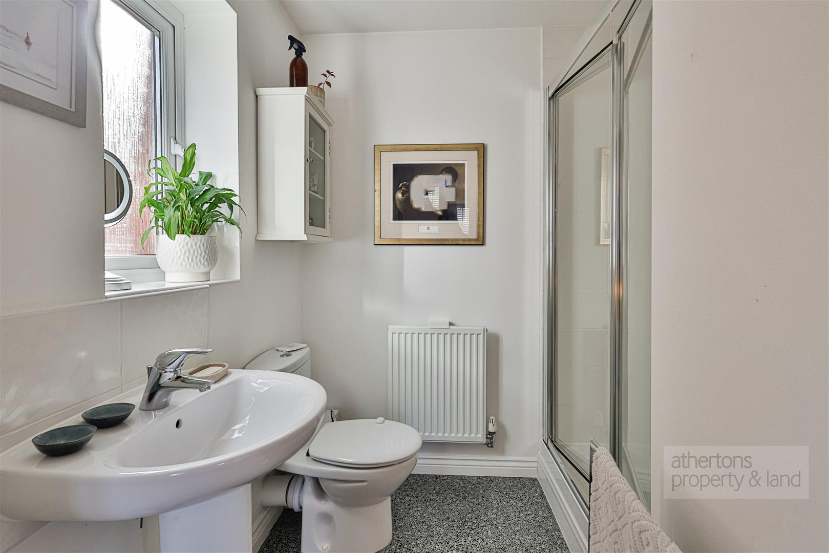 Bedroom two and bedroom three are both well-proportioned rooms and share a Jack and Jill en-suite shower room, again presented in a modern, neutral style consistent with the rest of the home. Bedroom four is currently utilised as a walk-in wardrobe but would equally serve as an ideal home office, nursery, or single bedroom depending on requirements. The family bathroom comprises a three-piece suite including a panelled bath, pedestal wash basin, and dual-flush WC, complemented by vinyl flooring and tiled elevations.