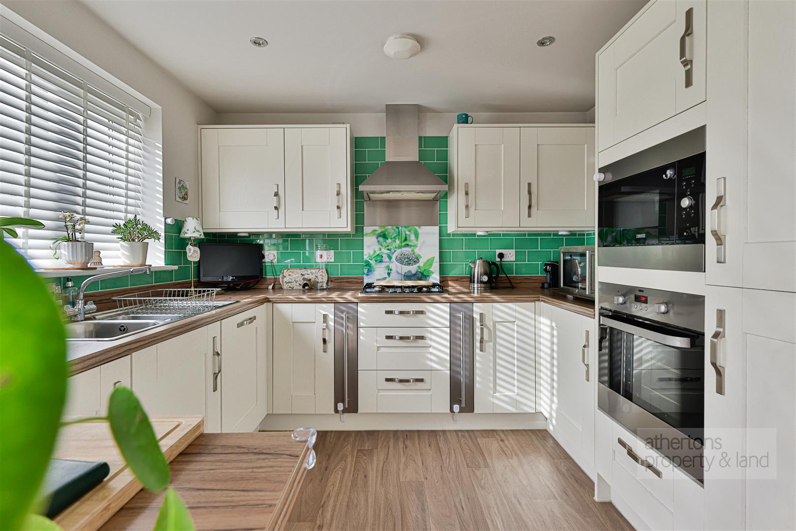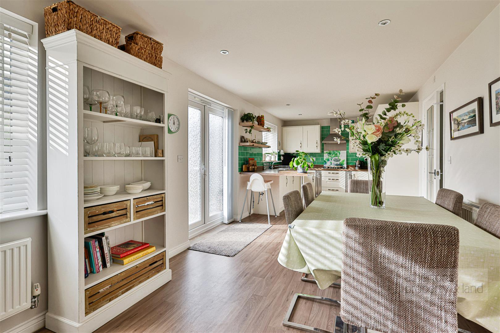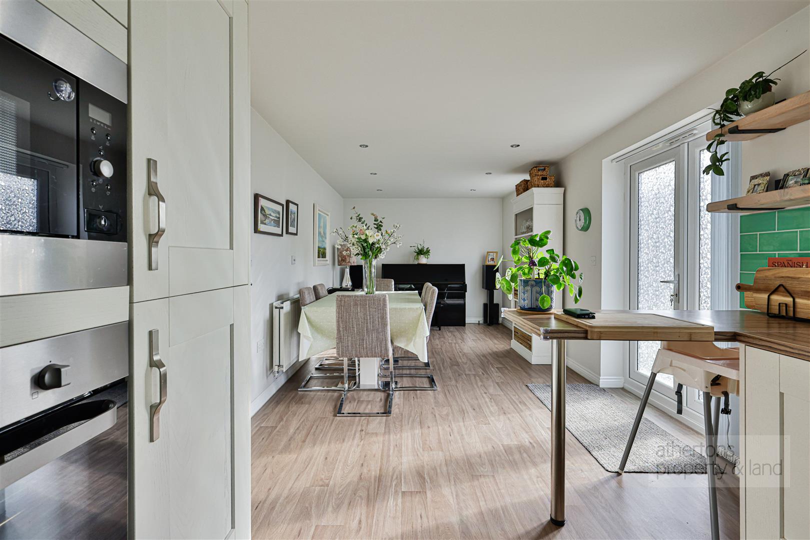 To the rear of the property is the spacious kitchen/dining room, thoughtfully designed to accommodate both family life and entertaining. The kitchen is fitted with sleek base and eye-level units complemented by laminate worktops and additional fitted splashbacks. Integrated appliances include a dishwasher and fridge/freezer, alongside a gas hob and electric oven. A small breakfast bar provides informal seating, while there is ample space for a dining table and snug furniture, creating a sociable and versatile open-plan environment. French doors open onto the rear patio, allowing natural light to flood the room and offering seamless access to the garden.
