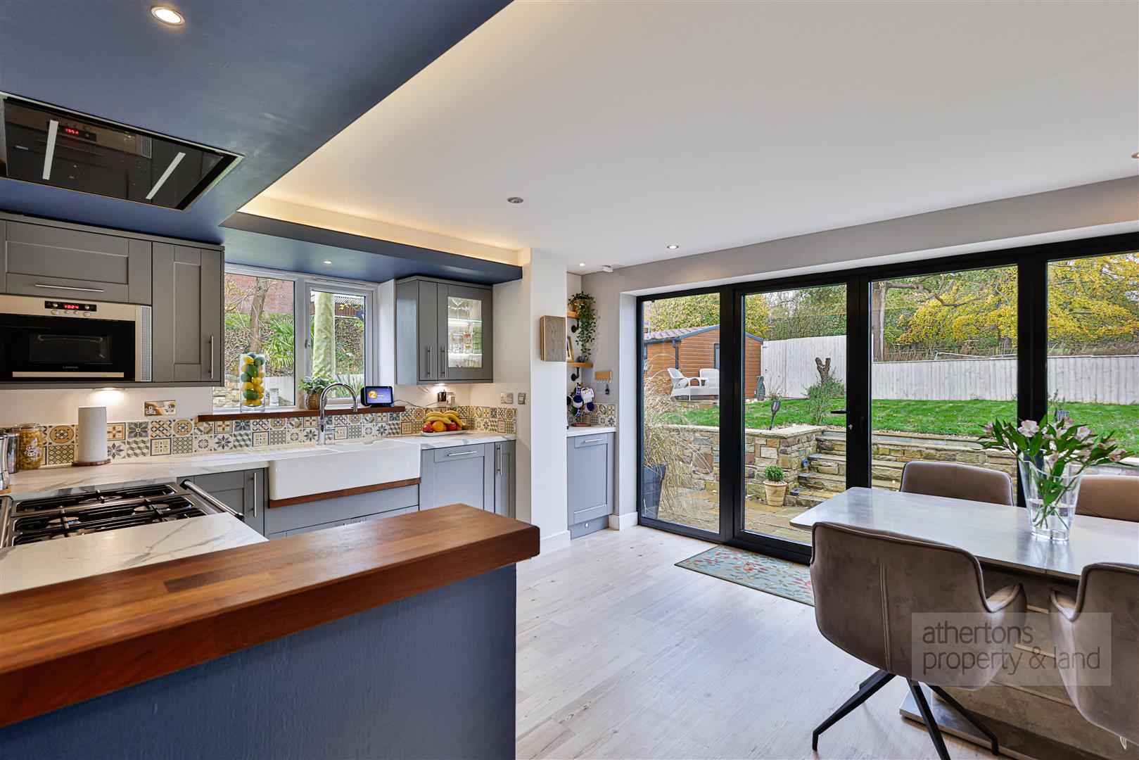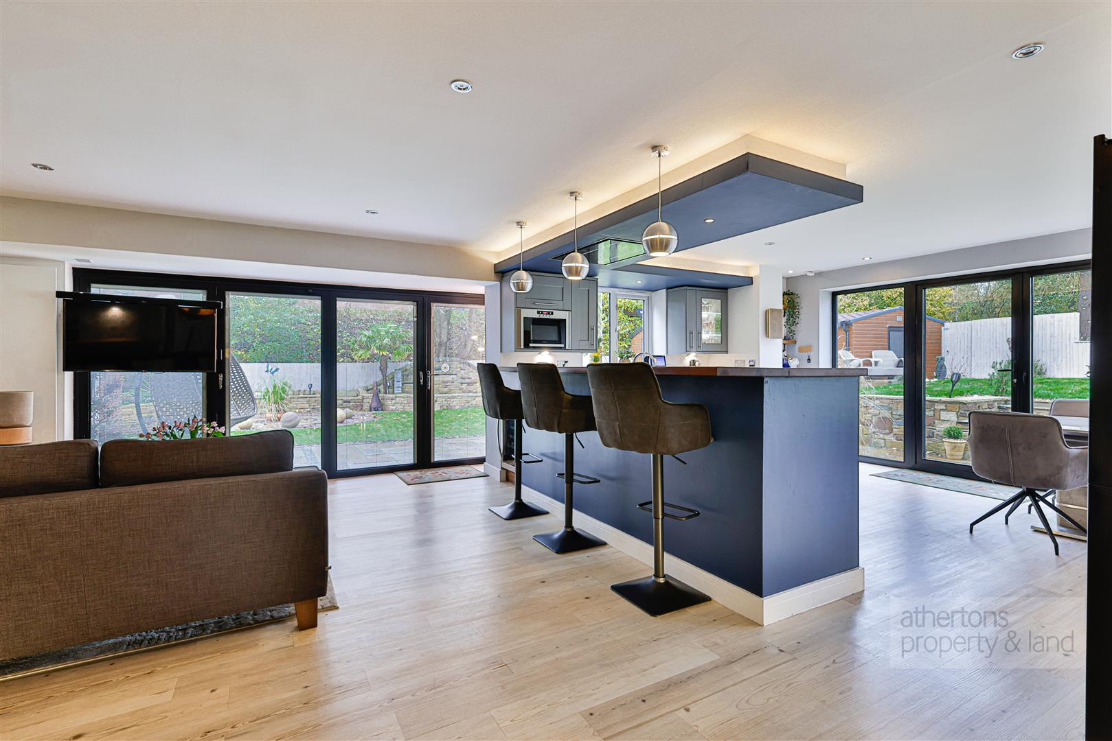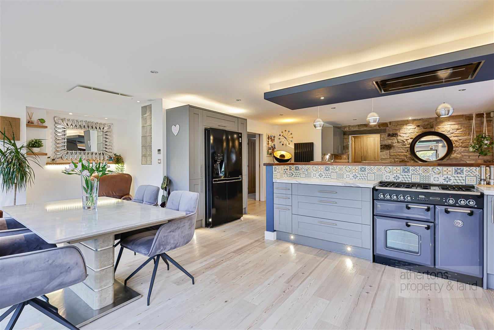 The property’s centrepiece is the open-plan kitchen, dining, and family area, designed for modern family life and entertaining. This bright, open space features exposed stone detailing, two sets of aluminium bi-folding doors to the garden, partial underfloor heating, marble-effect worktops, and a large breakfast bar. Quality fittings include a Rangemaster cooker with gas hob and extractor, Quooker tap, dual Belfast sinks, integrated wine fridge, and provision for an American-style fridge-freezer. A practical utility room with fitted units, sink, integrated fridge/freezer, and plumbing for laundry appliances adjoins the space, while a useful store/workshop with French doors to the rear garden and a Velux window offers further flexibility.