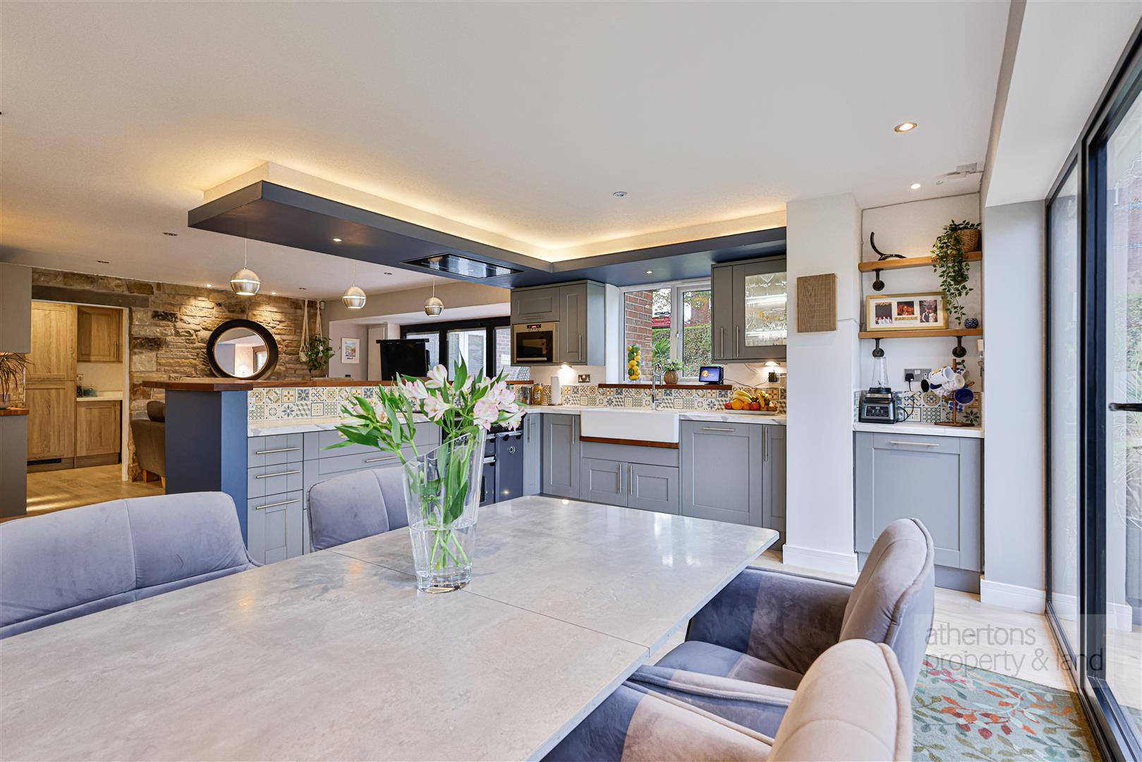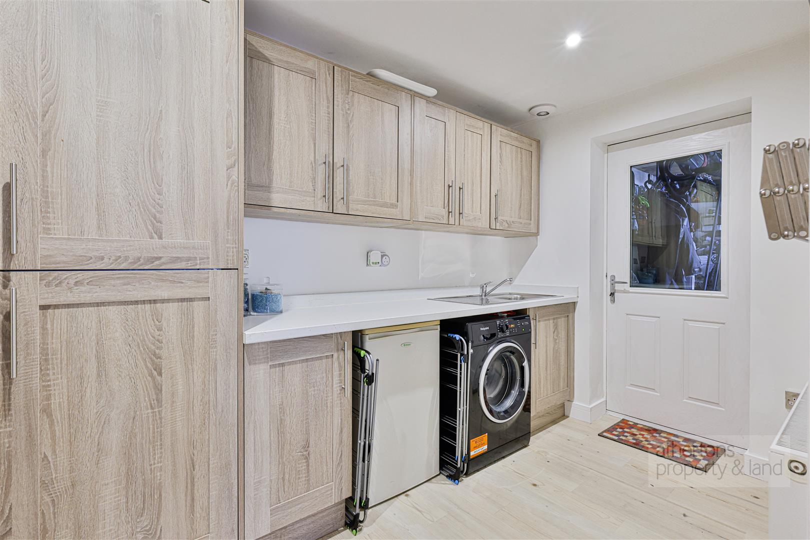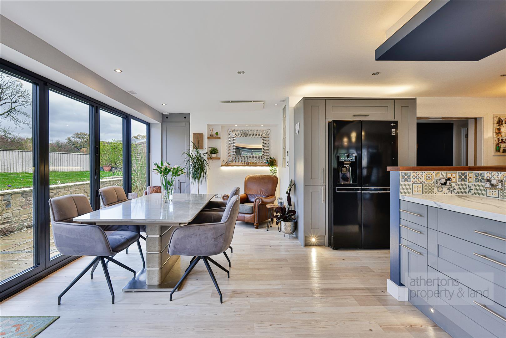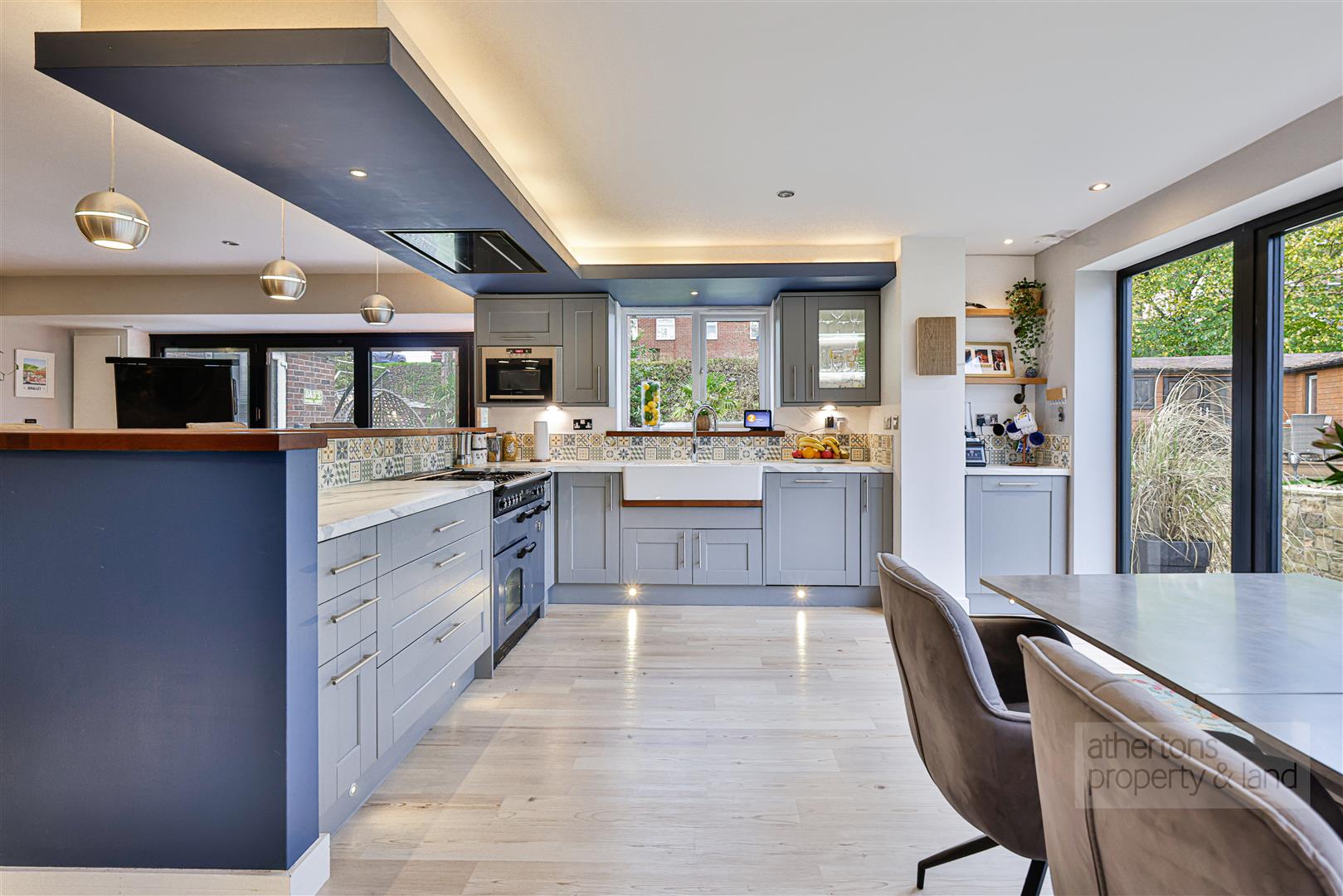 The property’s centrepiece is the open-plan kitchen, dining, and family area, designed for modern family life and entertaining. This bright, open space features exposed stone detailing, two sets of aluminium bi-folding doors to the garden, partial underfloor heating, marble-effect worktops, and a large breakfast bar. Quality fittings include a Rangemaster cooker with gas hob and extractor, Quooker tap, dual Belfast sinks, integrated wine fridge, and provision for an American-style fridge-freezer. A practical utility room with fitted units, sink, integrated fridge/freezer, and plumbing for laundry appliances adjoins the space, while a useful store/workshop with French doors to the rear garden and a Velux window offers further flexibility.