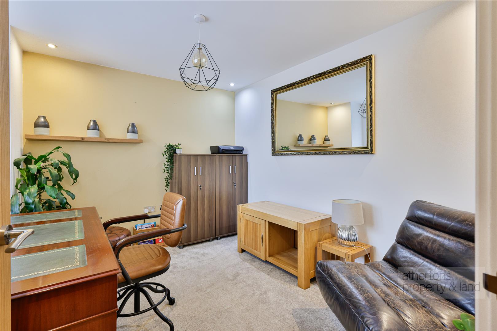 A glazed entrance porch with exposed brick detailing opens into an L-shaped hallway with U-shaped stairs to the first floor, an under-stairs storage cupboard, and a two-piece WC. The living room, converted from the original garage, offers a generous reception space with twin bay windows, a granite and stone fireplace housing a gas log-effect stove, and aluminium bi-fold doors opening onto the garden. A separate study provides an ideal home office or children’s playroom, enjoying a pleasant front aspect.